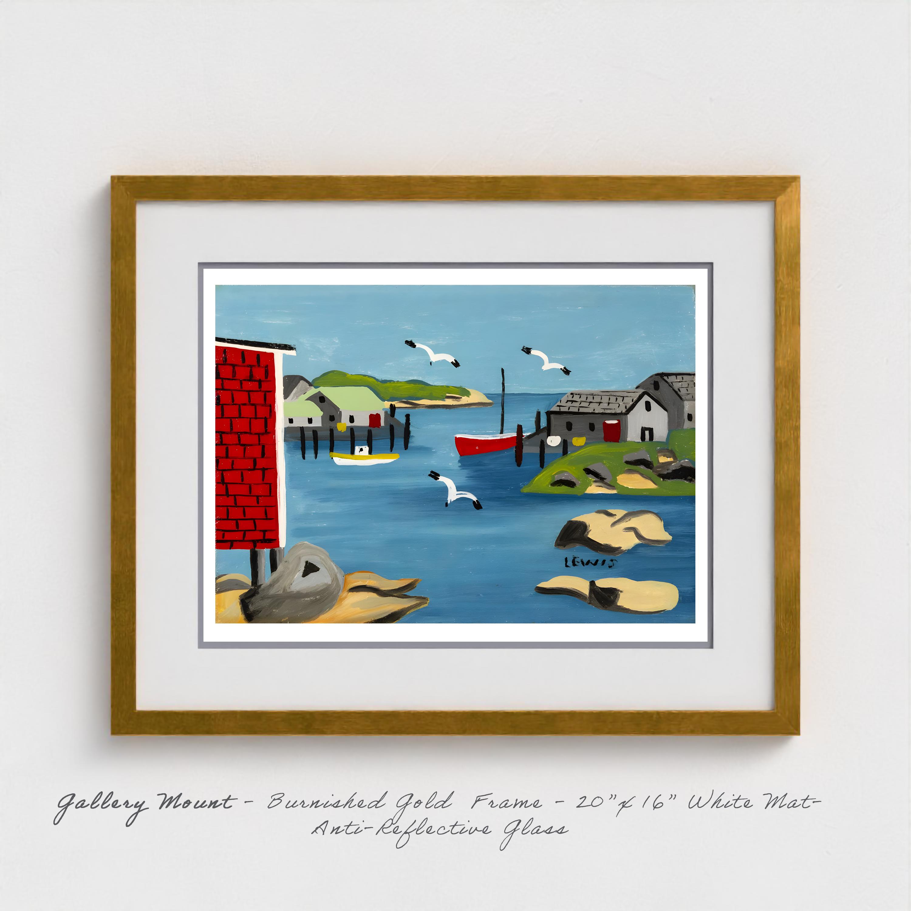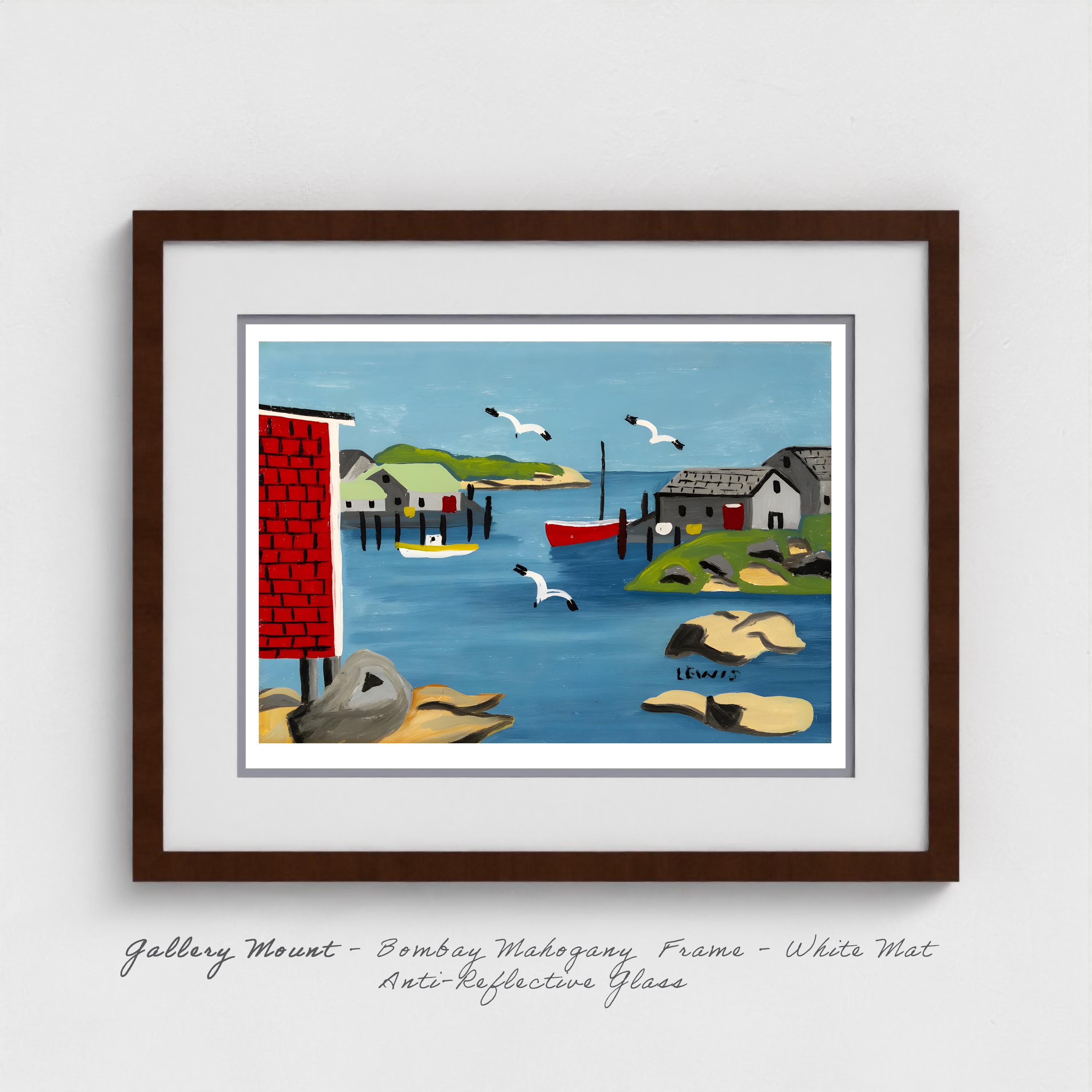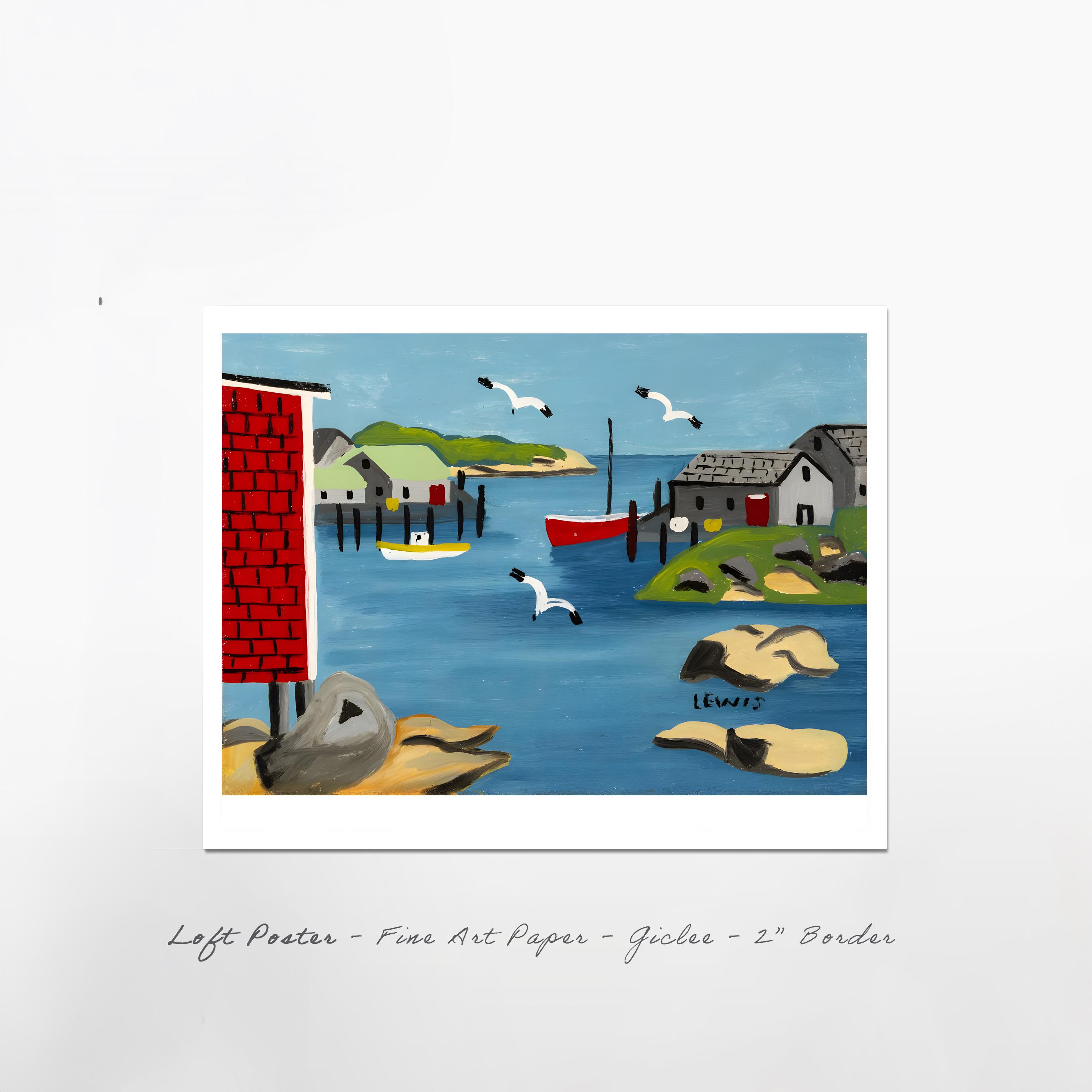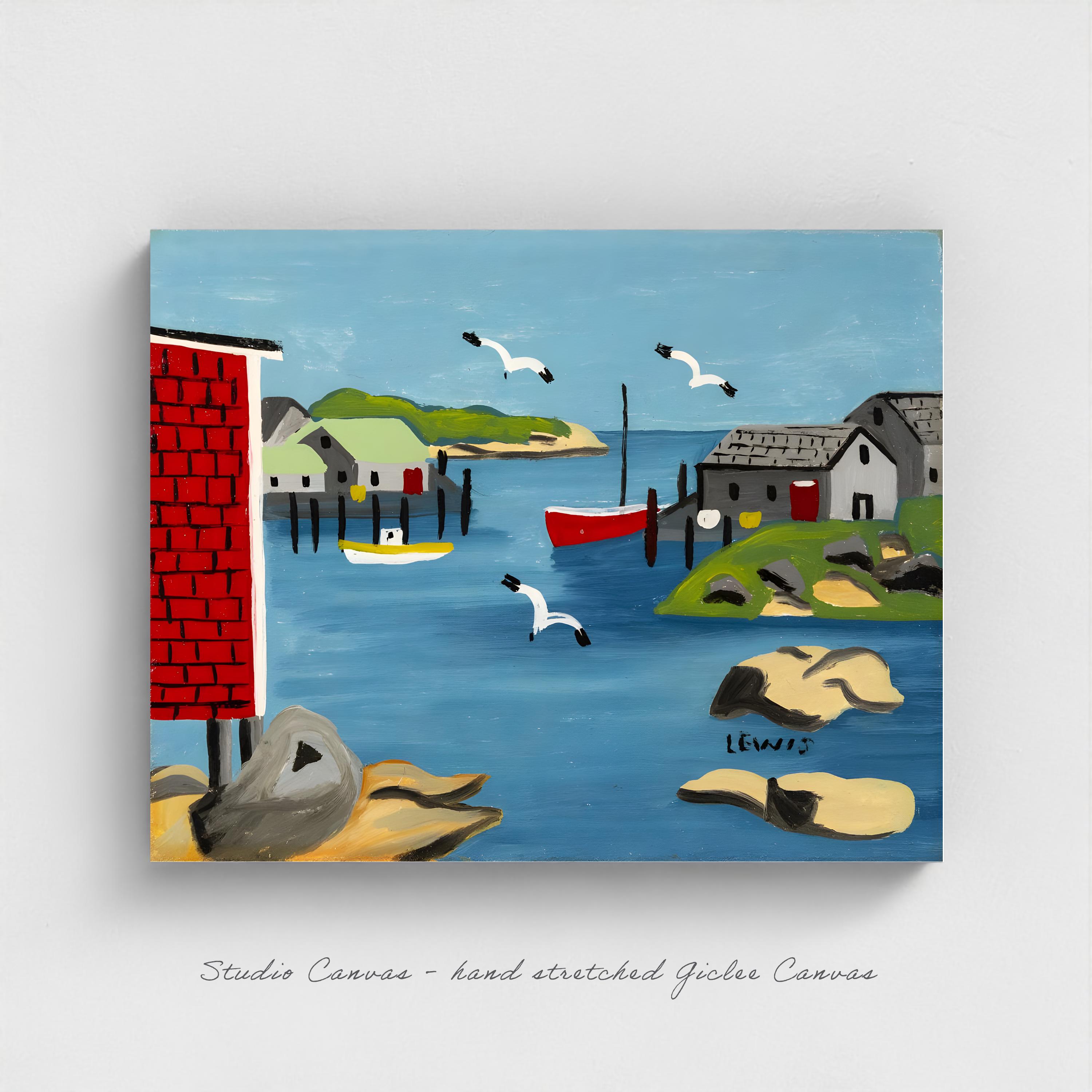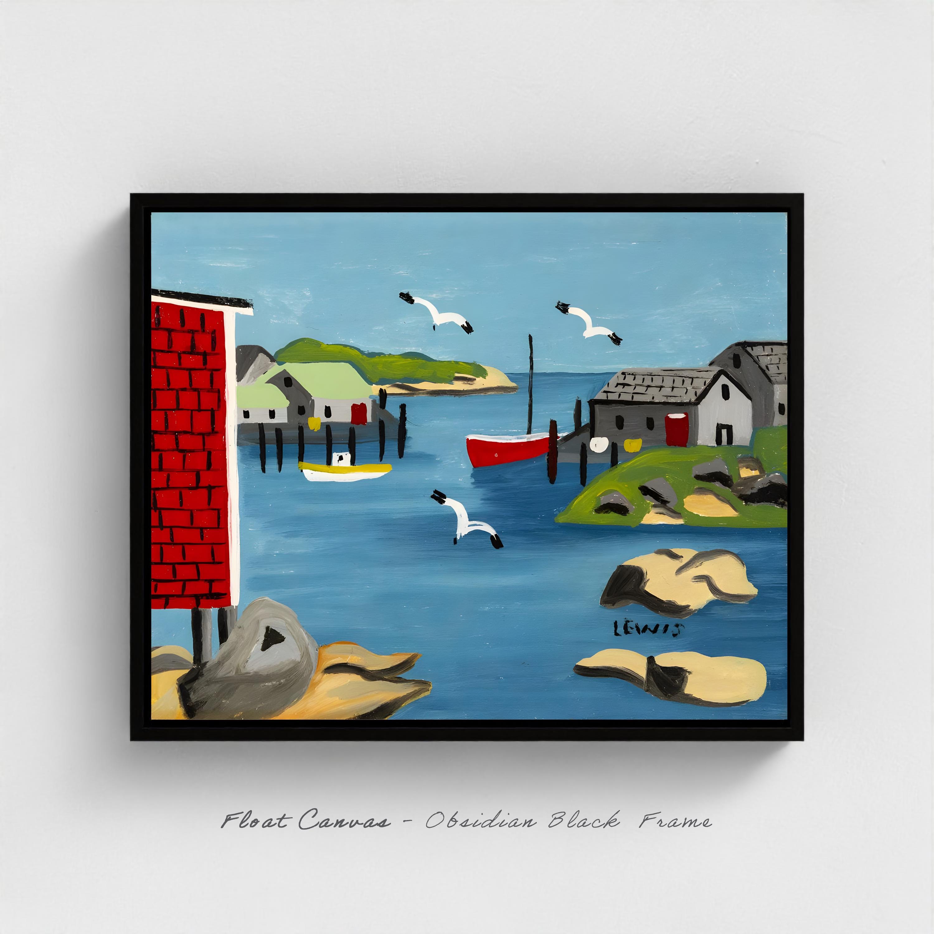 Experience the delightful charm of Maud Lewis with this peaceful coastal view. Graceful gulls soar above the Nova Scotia shoreline, painted in her signature bold, happy colors that capture the simple beauty of maritime life. Every brushstroke radiates the warmth and optimism that made Maudโs work so treasured.
