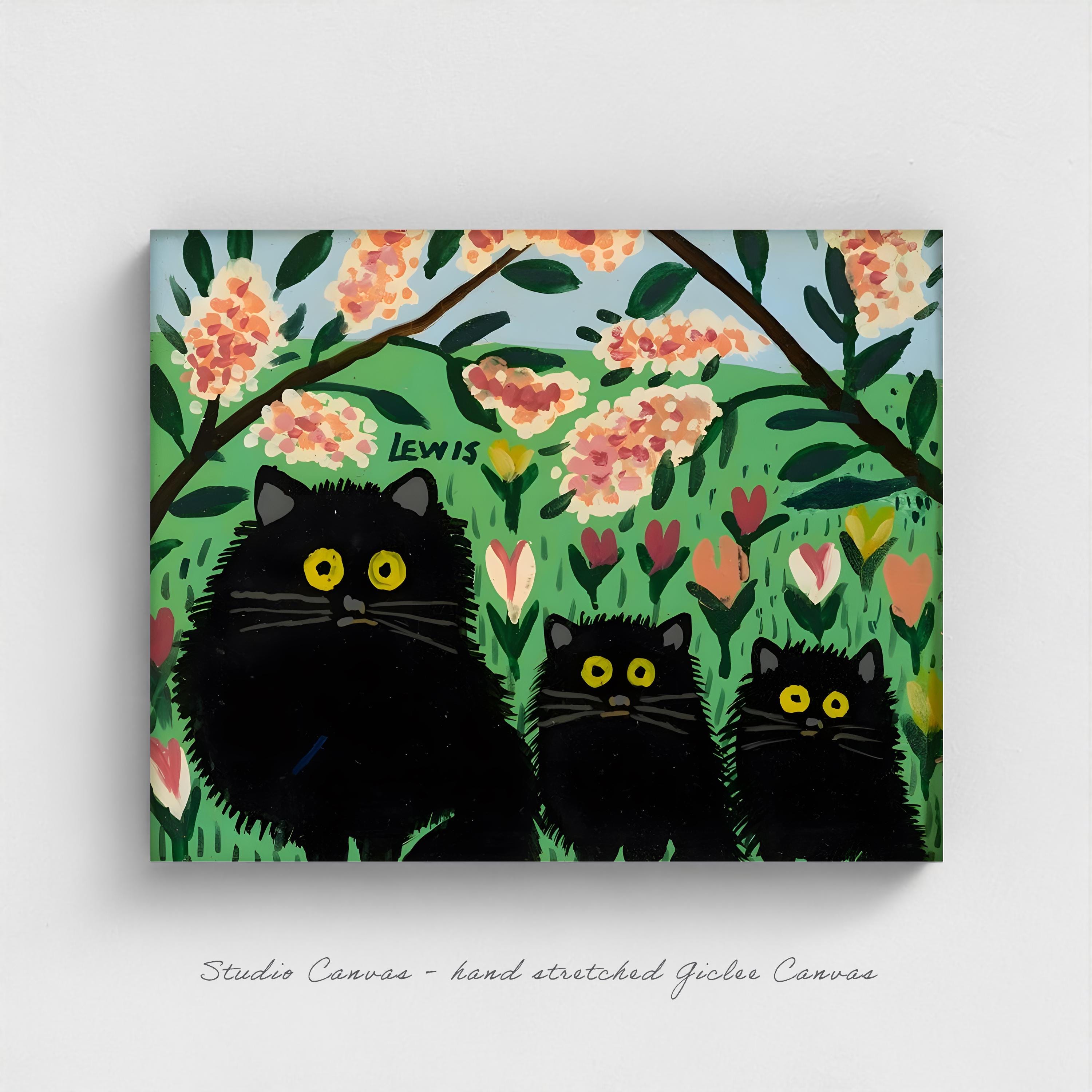 The black background—unusual for Lewis—causes the colours to appear more vivid and shifts the work toward abstraction. Art educator Harold Pearse observed that paintings like Three Black Cats function iconically through their restricted subject matter, formalized rendering, and serial repetition, creating an ongoing narrative about Lewis's vision of a Nova Scotia that was rapidly disappearing.