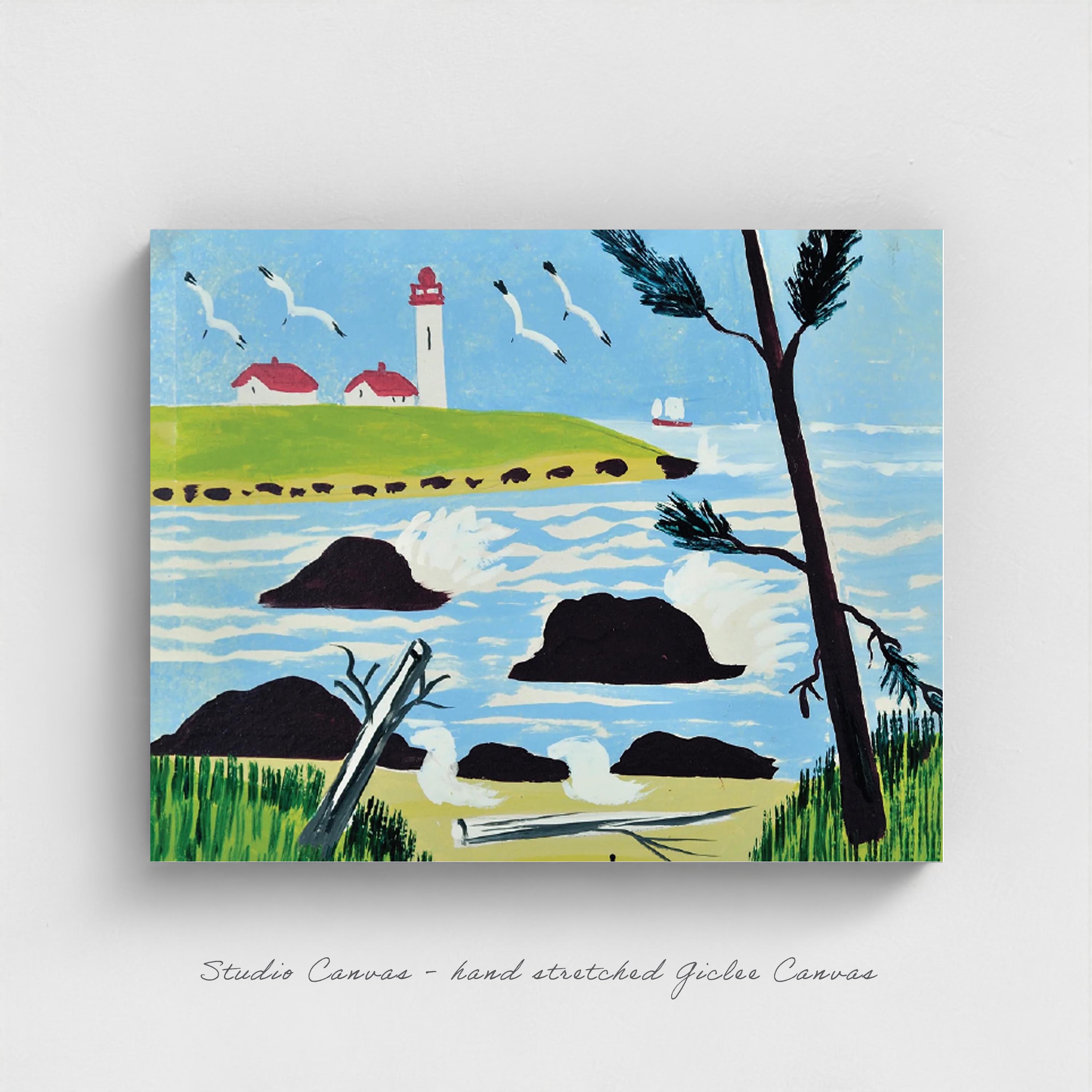 Description: Bring home the timeless charm of Nova Scotia's coastline with this delightful Maritime scene by beloved Canadian folk artist Maud Lewis. This cheerful Lighthouse Yarmouth County painting captures the essence of Atlantic Canada's fishing heritage with Lewis's signature naive style that transforms everyday coastal life into pure folk art magic. Perfect for lighthouse enthusiasts, Maritime homes, or anyone who treasures the authentic spirit of Nova Scotia's fishing communities.