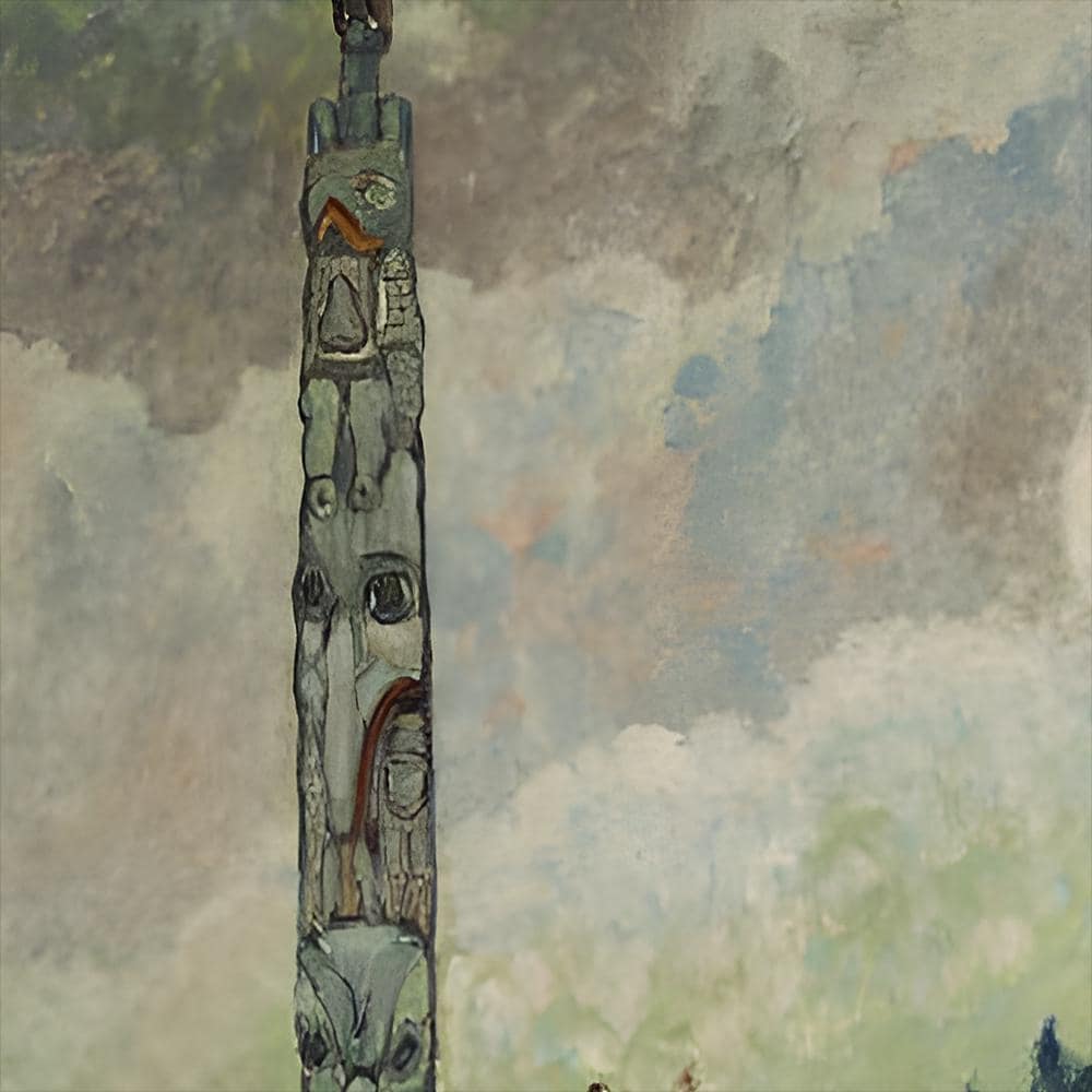 Her Indigenous mentors had taught her that Tanoo's isolation amplified its spiritual power, creating a natural sanctuary where totemic monuments and ancestral energies remain undisturbed by modern influences. This painting captures the profound silence of ancient places where past and present merge in eternal communion, where totemic poles serve as permanent bridges between earthly and spiritual dimensions.