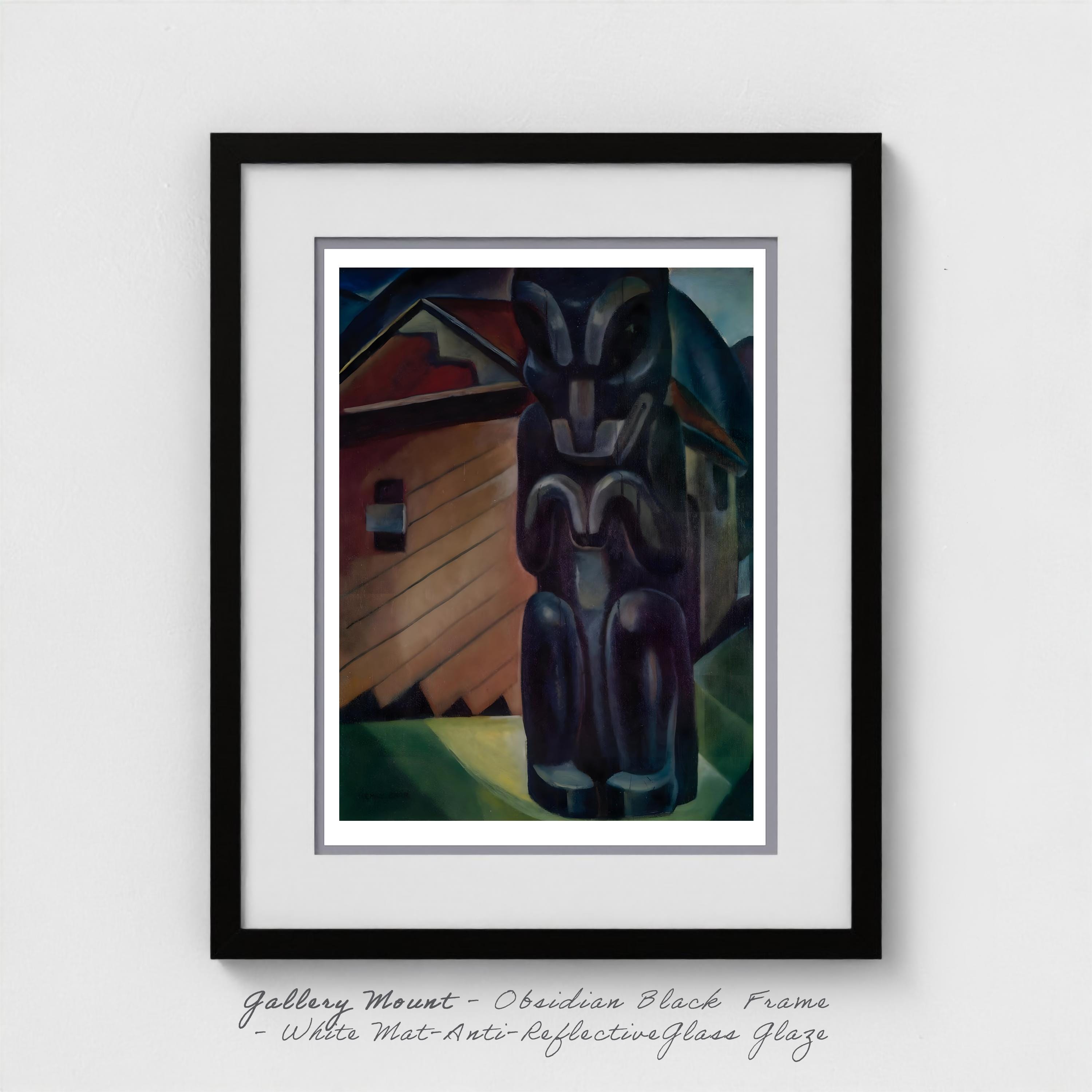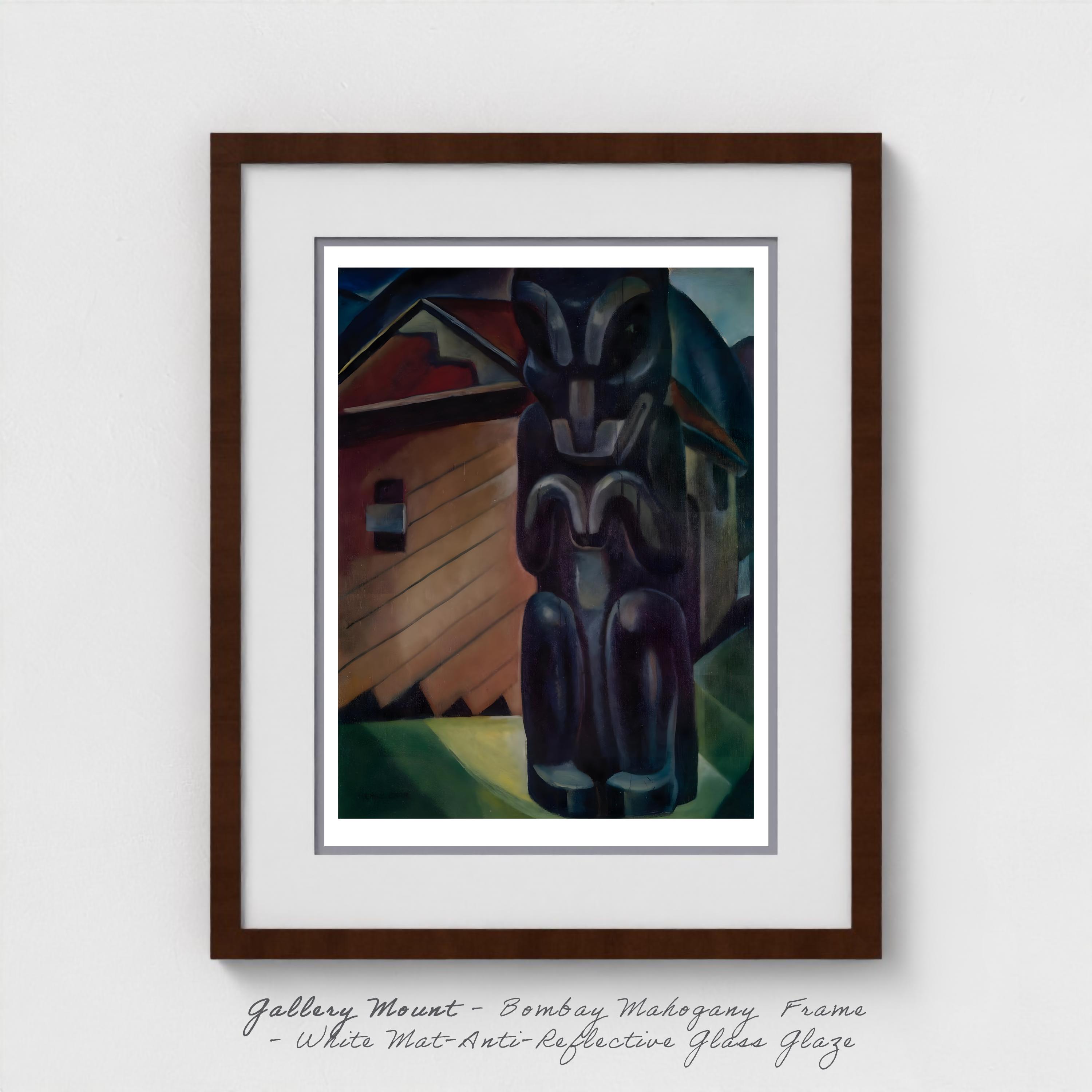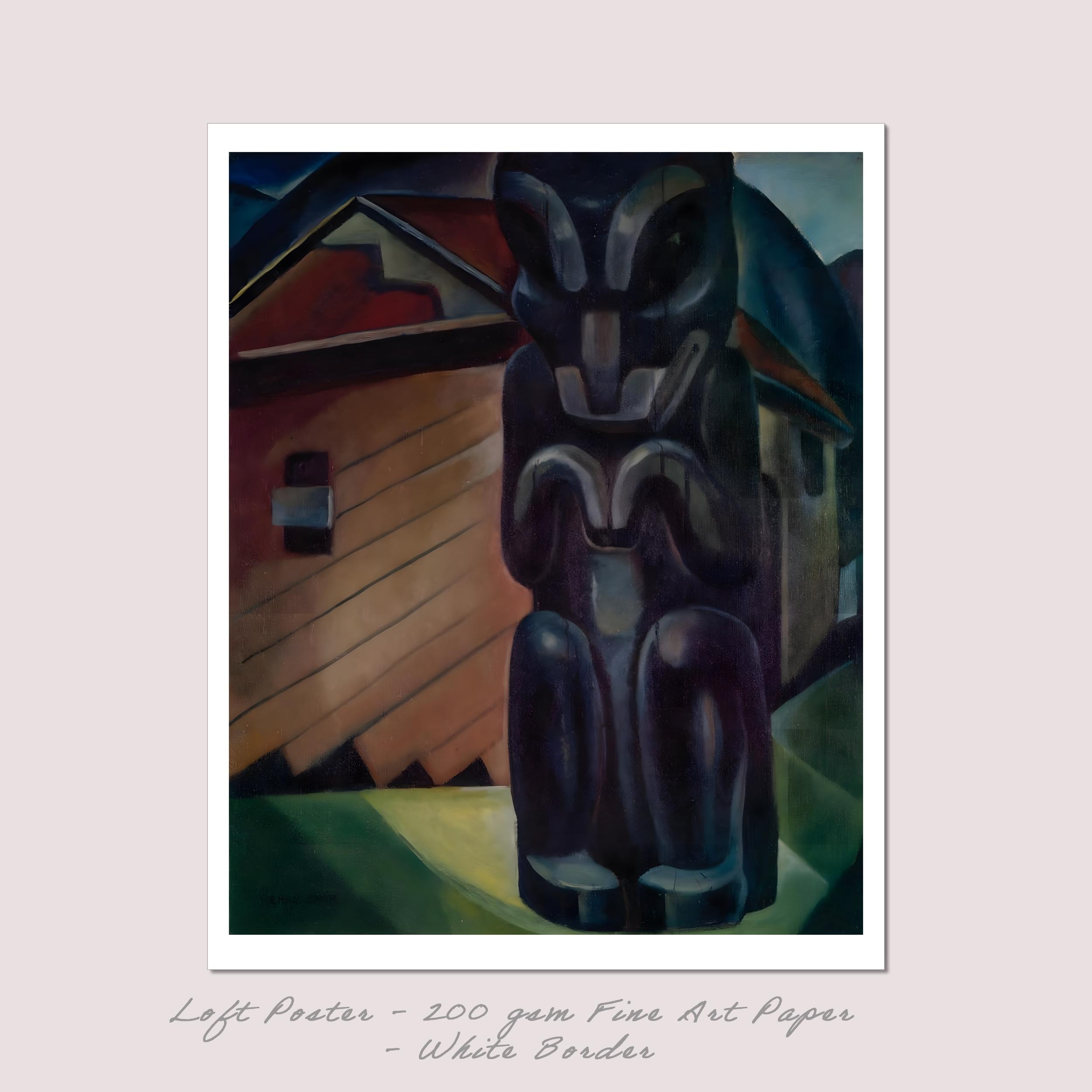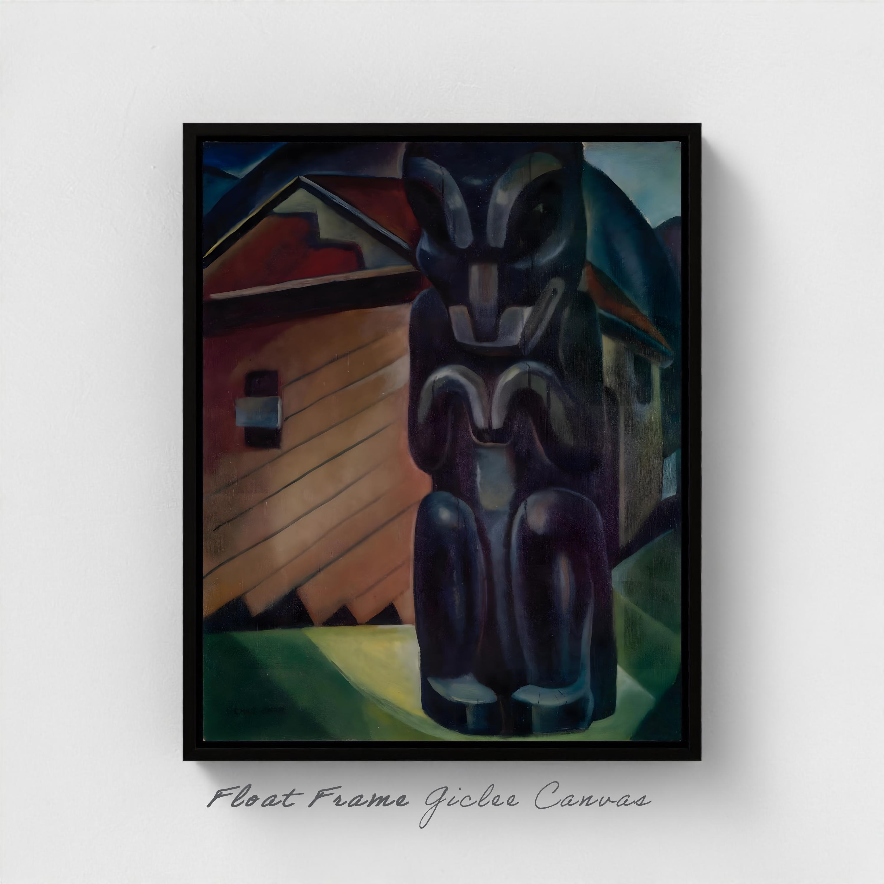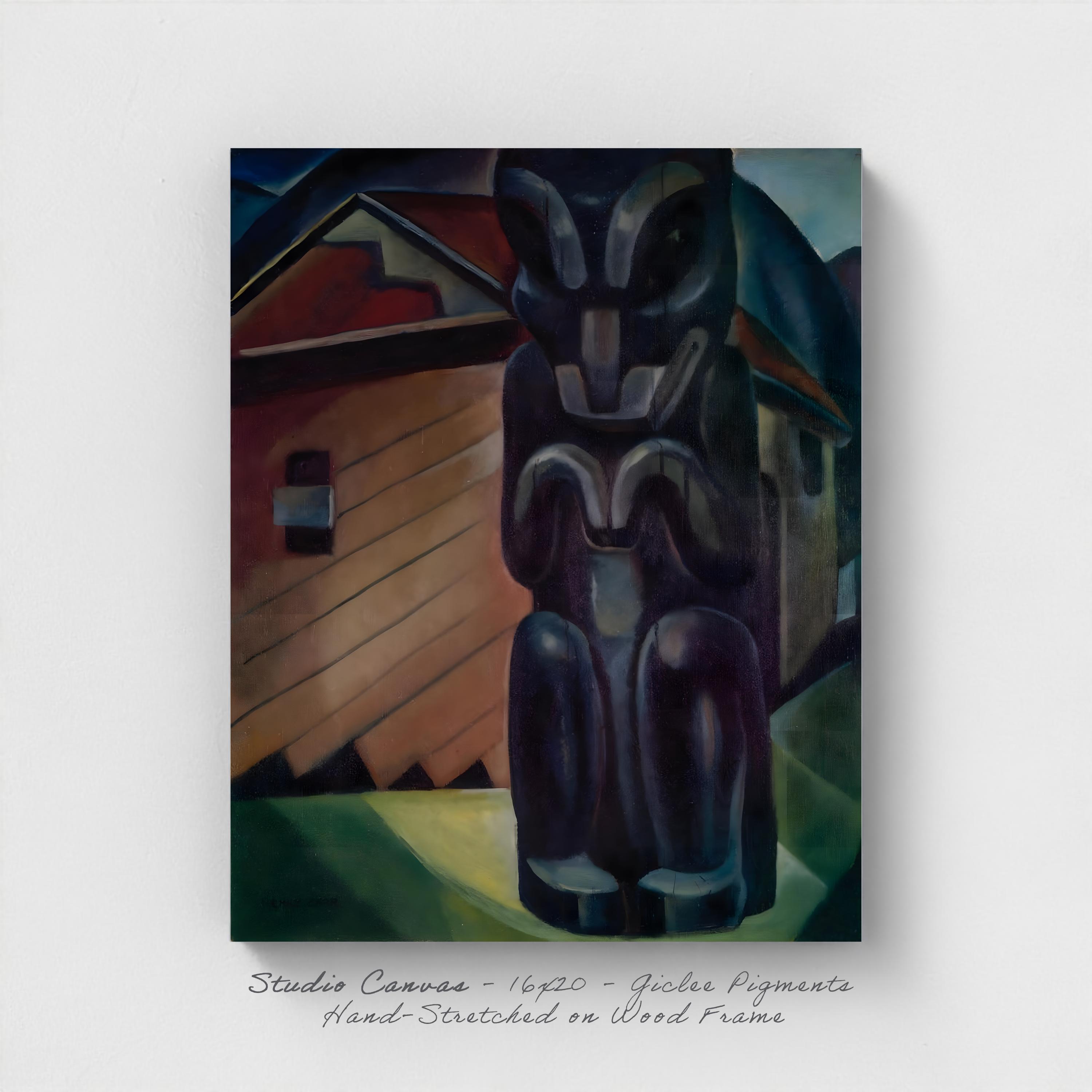 Experience the towering spiritual power of Emily Carr's monumental "Kitwangar Pole," where Theosophical understanding of universal sacred symbols meets Indigenous reverence for the ancient totemic traditions of the Gitxsan people. This commanding work captures Carr's mature synthesis of Lawren Harris's mystical teachings with profound respect for the carved monuments that served as spiritual libraries and ancestral records for Pacific Northwest Indigenous communities.