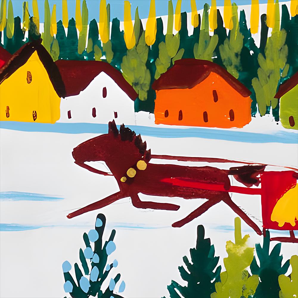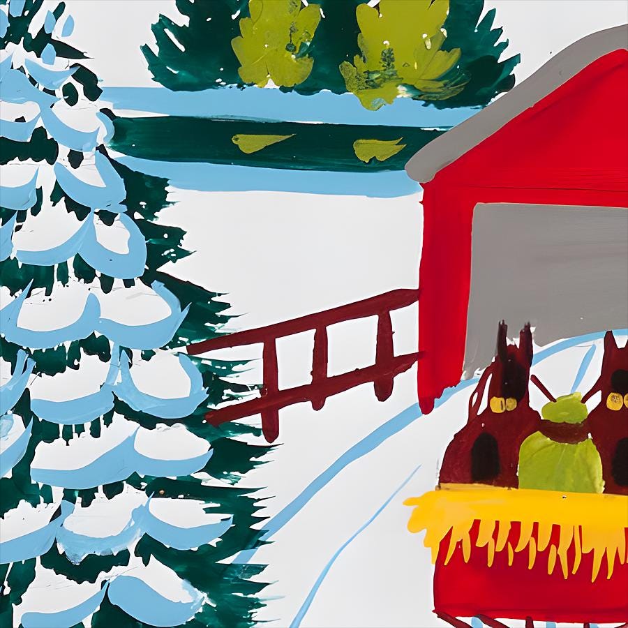 The composition shows Lewis's mature style fully developed. Three sleighs move through the scene at different points in their journey, creating narrative momentum. The covered bridge itself anchors the center, its dark interior contrasting dramatically with surrounding snow. Evergreens frame the composition with verticality, their deep green establishing depth against the winter palette. True to her technique, Lewis painted without shadows or atmospheric perspective, creating instead a flattened decorative space where every element—bridge timbers, horse teams, village houses, forest trees—shares equal visual importance. The colors remain pure and unmixed, applied straight from the tube in her characteristic rectilinear brushstrokes, the stiffness in her arthritic hands becoming her signature rather than her limitation.