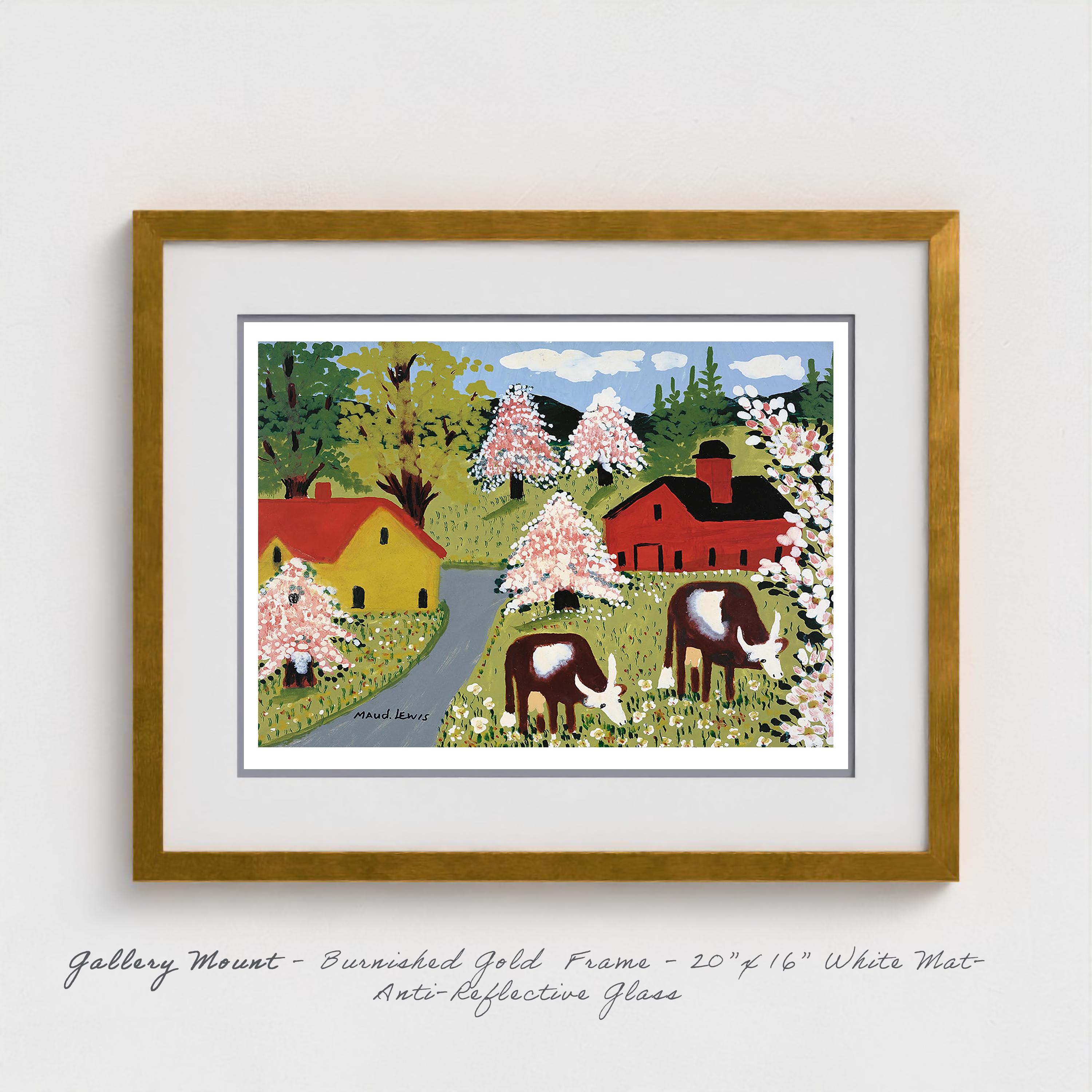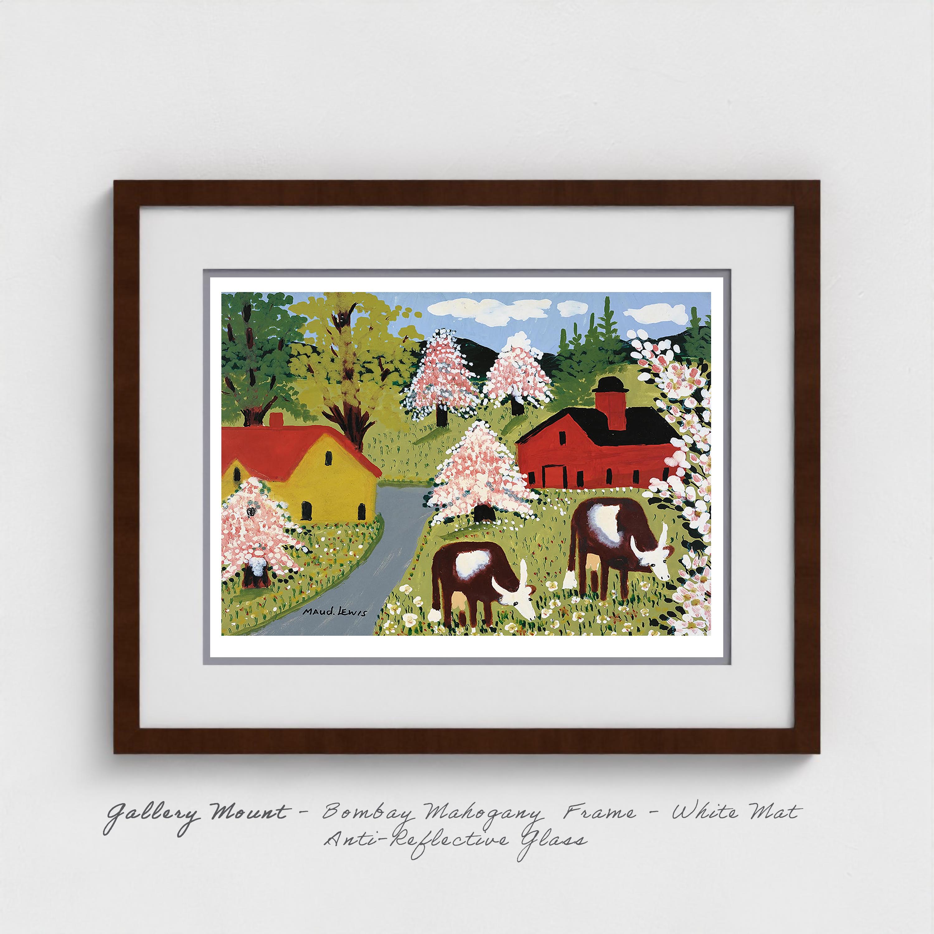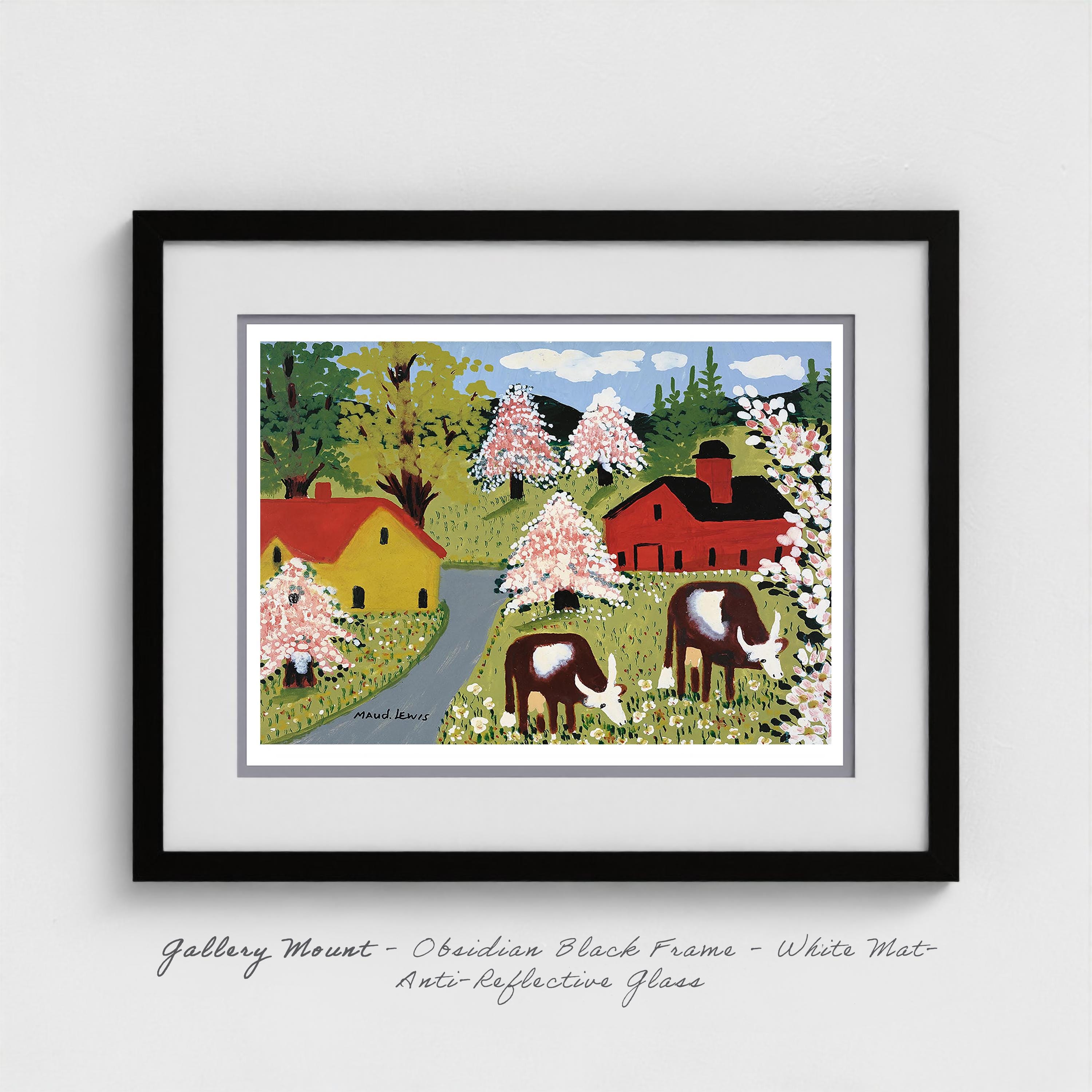 Embrace the peaceful rhythm of Maritime agricultural life through Maud Lewis's serene "Cows Grazing," honouring the gentle dairy herds that sustained Nova Scotia farming families through their daily provision of milk, butter, and the steady income that kept rural households economically viable. This tender work showcases Lewis's profound appreciation for how dairy cows represented security, prosperity, and the careful stewardship that enabled Maritime farmers to build sustainable livelihoods, transforming humble grazing cattle into folk art celebrations of the pastoral beauty and agricultural wisdom that made dairy farming the foundation of rural Nova Scotia's economic and cultural stability.