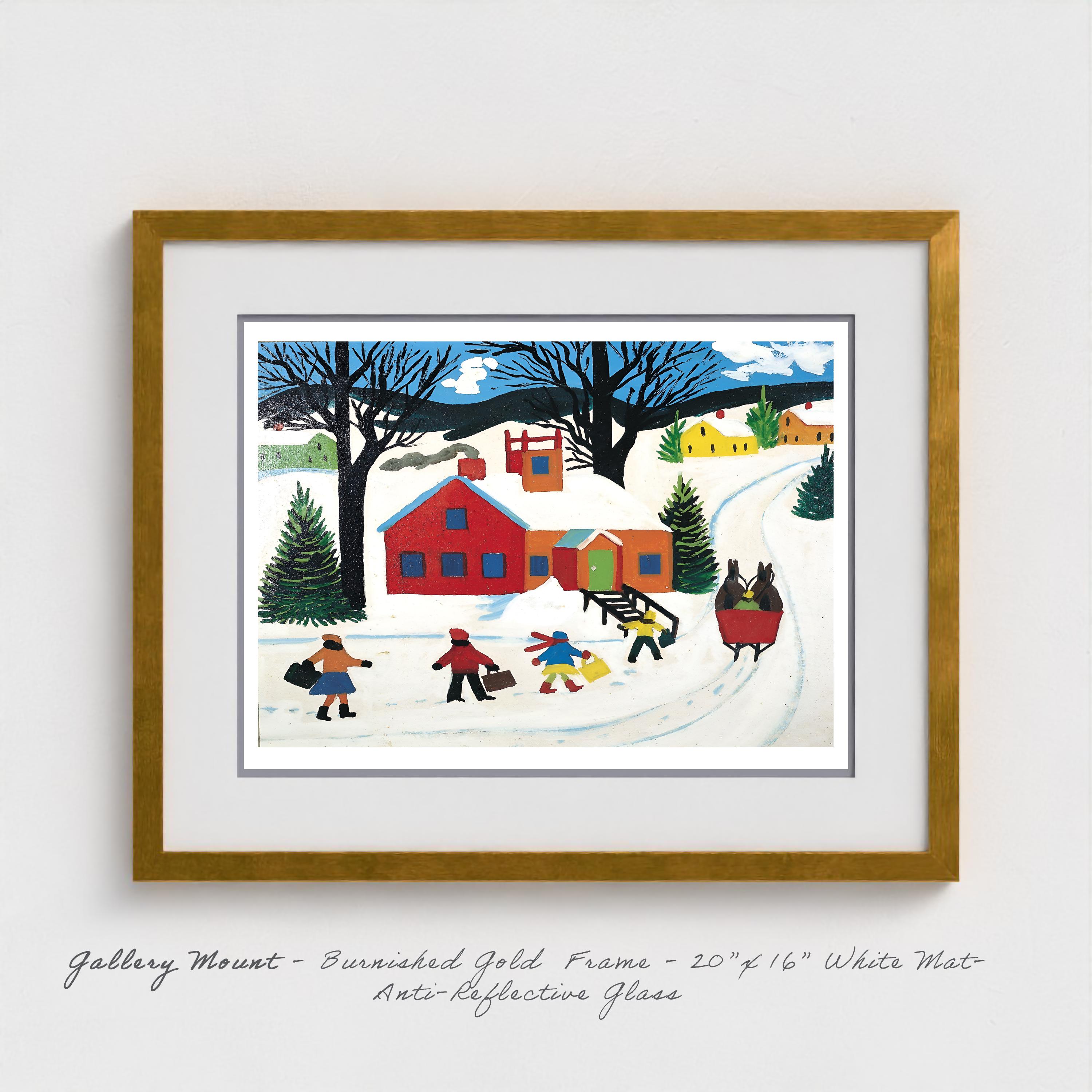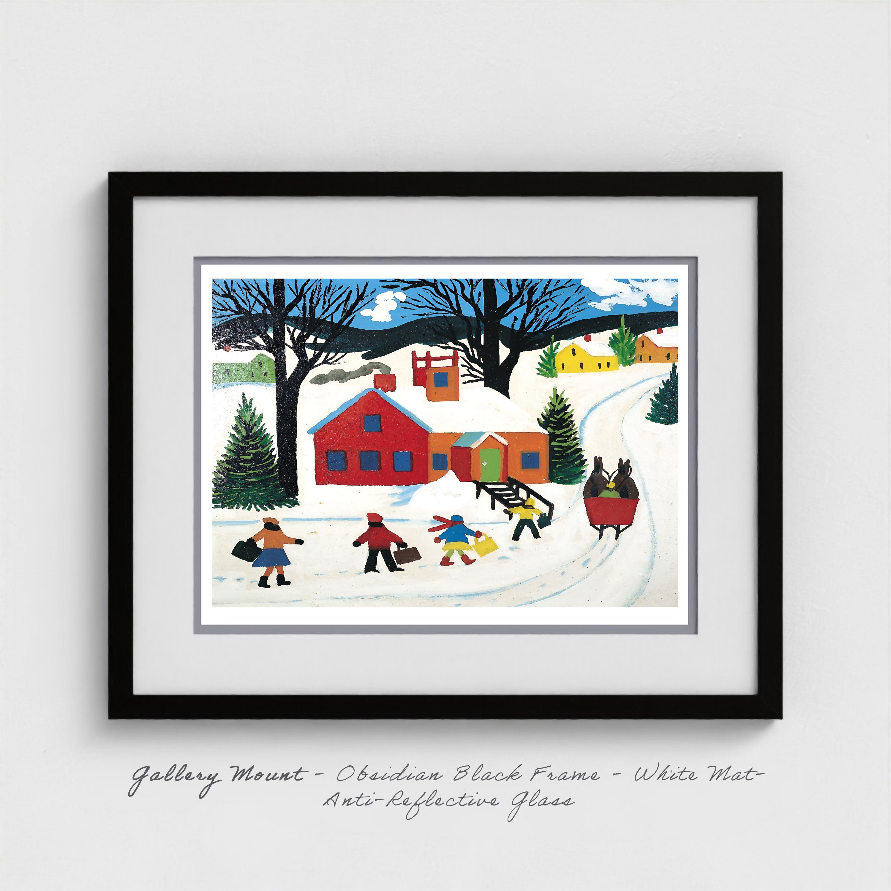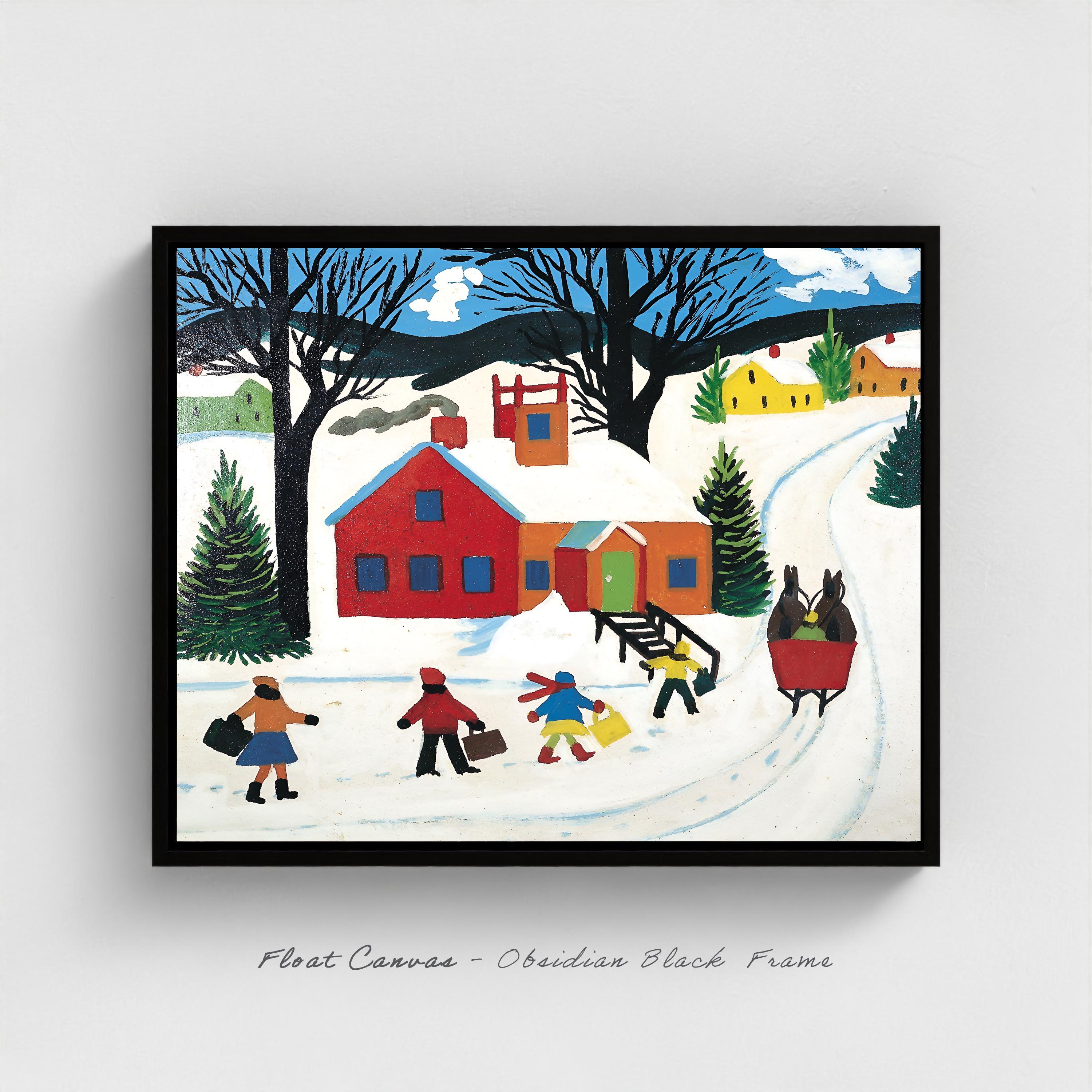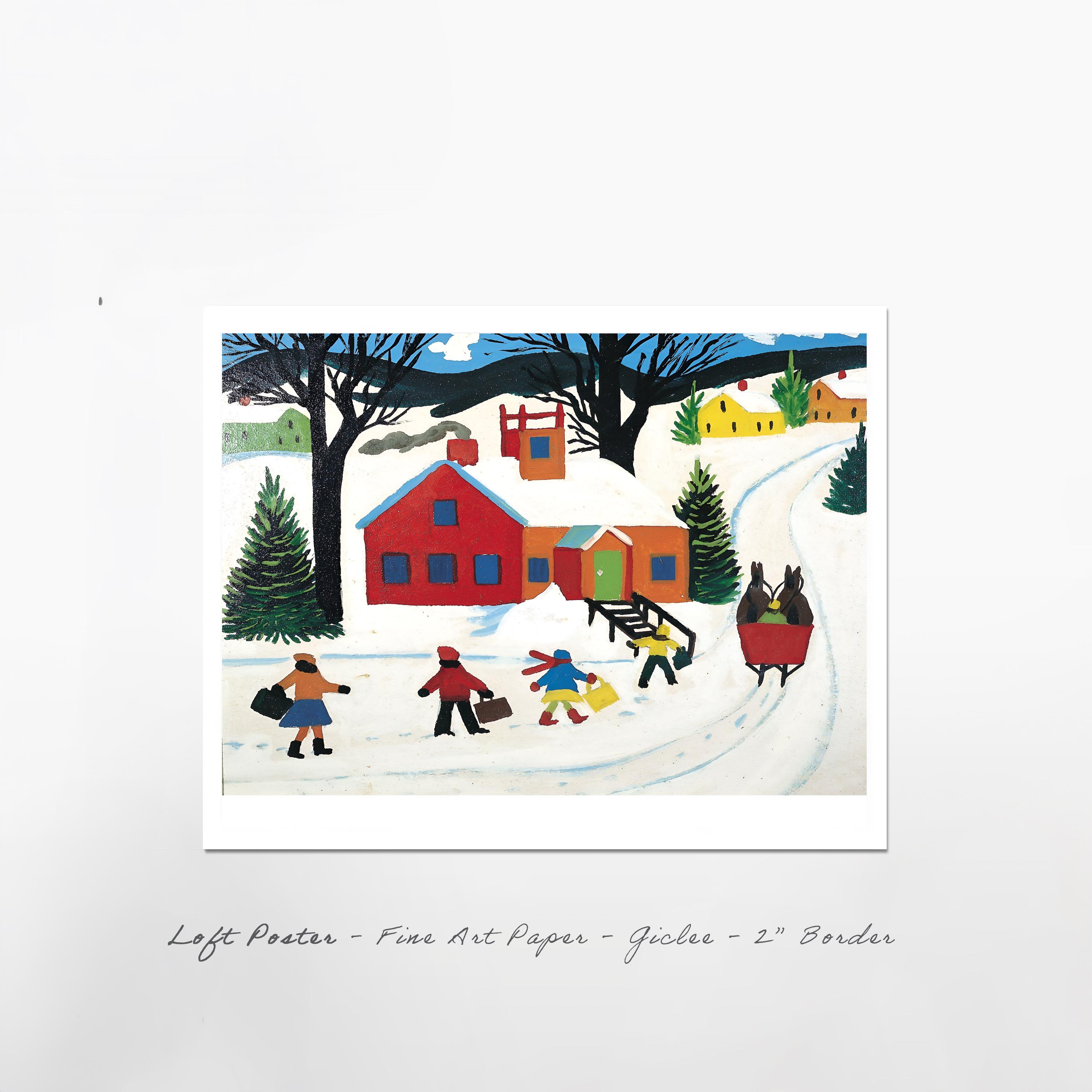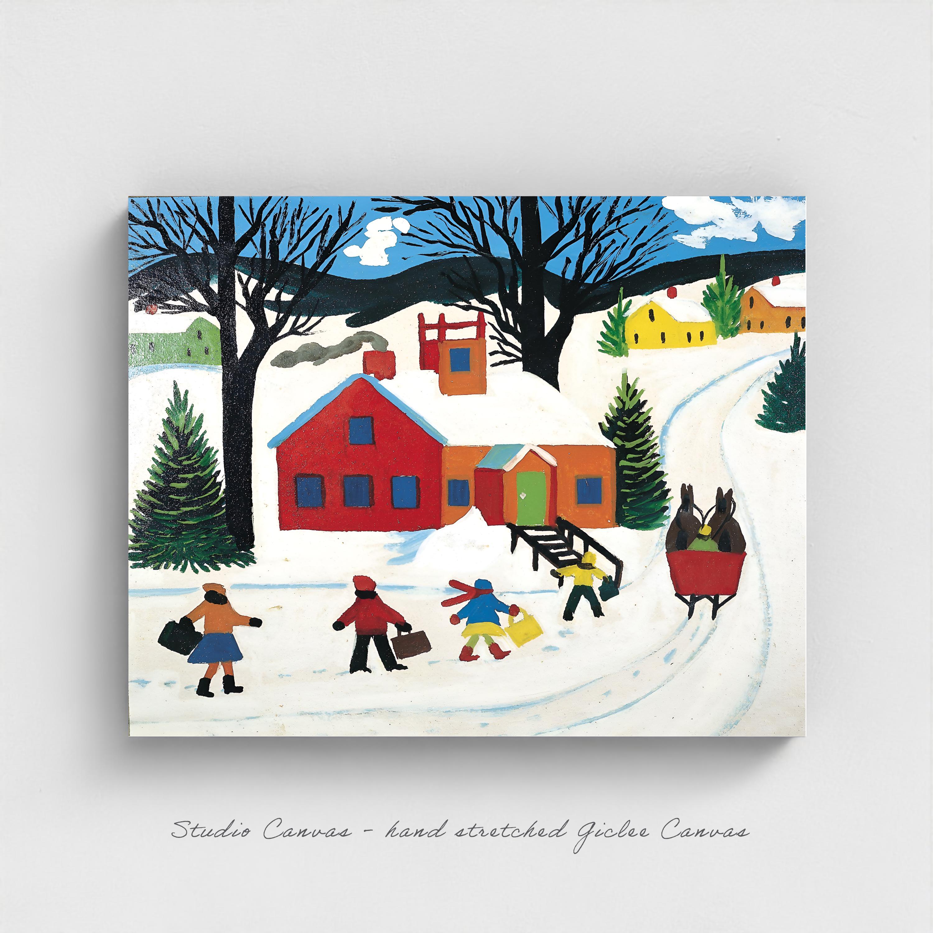 Experience the delightful charm of Maud Lewis with this enchanting winter schoolhouse scene. Her beloved one-room schoolhouse sits nestled in a snowy landscape, painted in her signature bold, happy colors that capture the simple beauty of a Nova Scotia winter day
