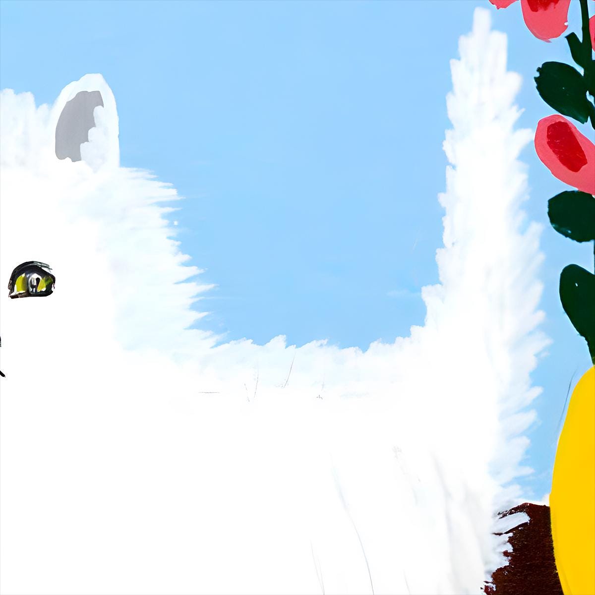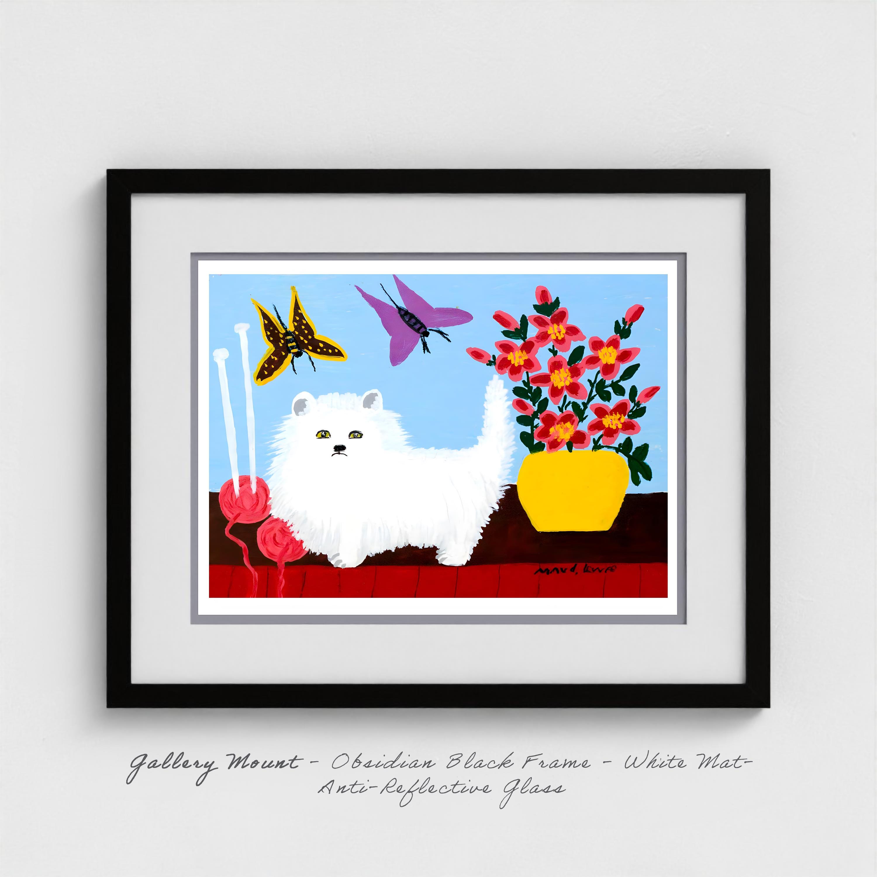 This reproduction honors Lewis's vision with museum-quality Giclee printing that captures every nuance of her bold colors and distinctive brushwork. The white cat's blue eyes shine with that same gentle spirit Lewis infused into all her animal subjects. The flowers maintain their brilliant primary colors—no subtle shading here, just pure, unapologetic joy in red, yellow, and green.