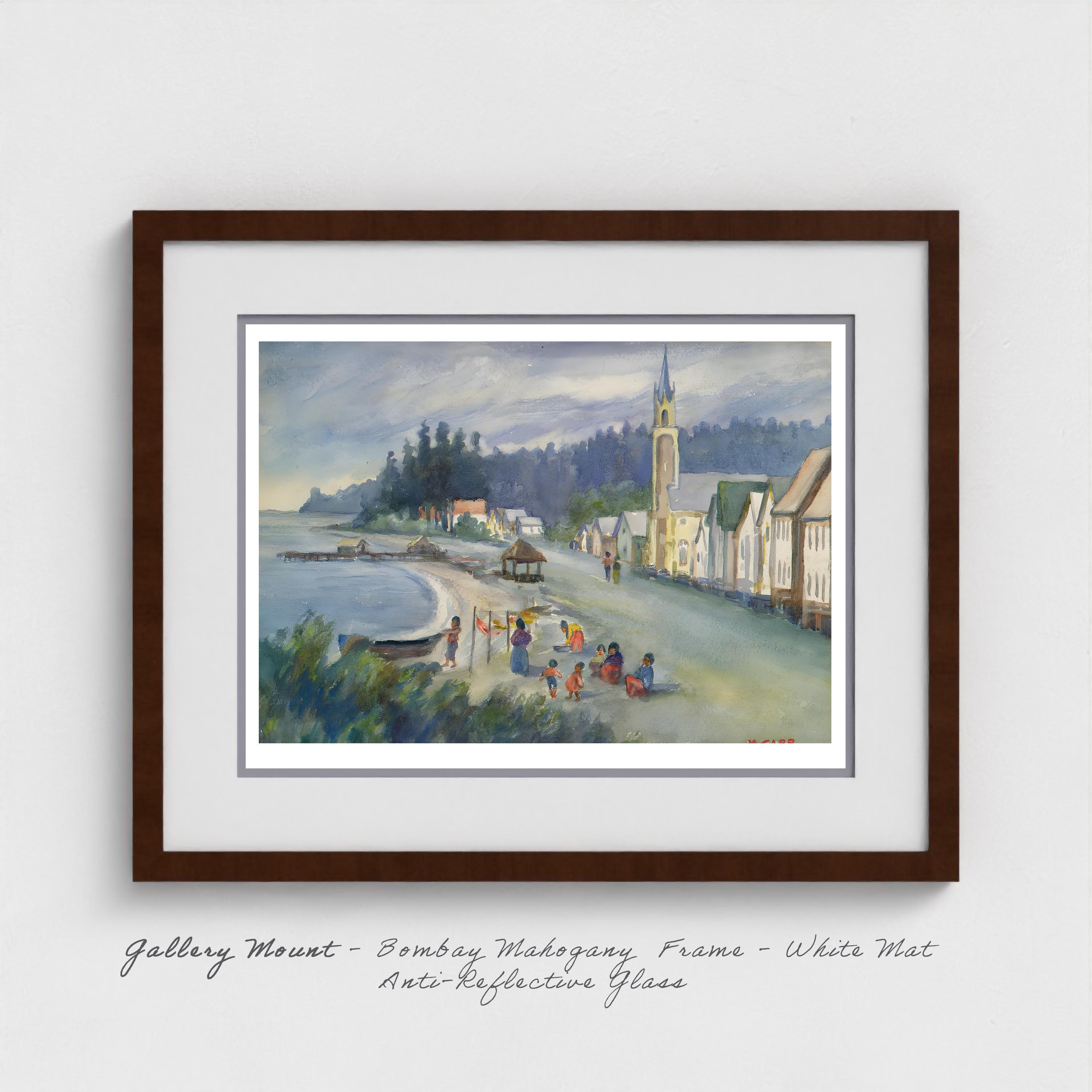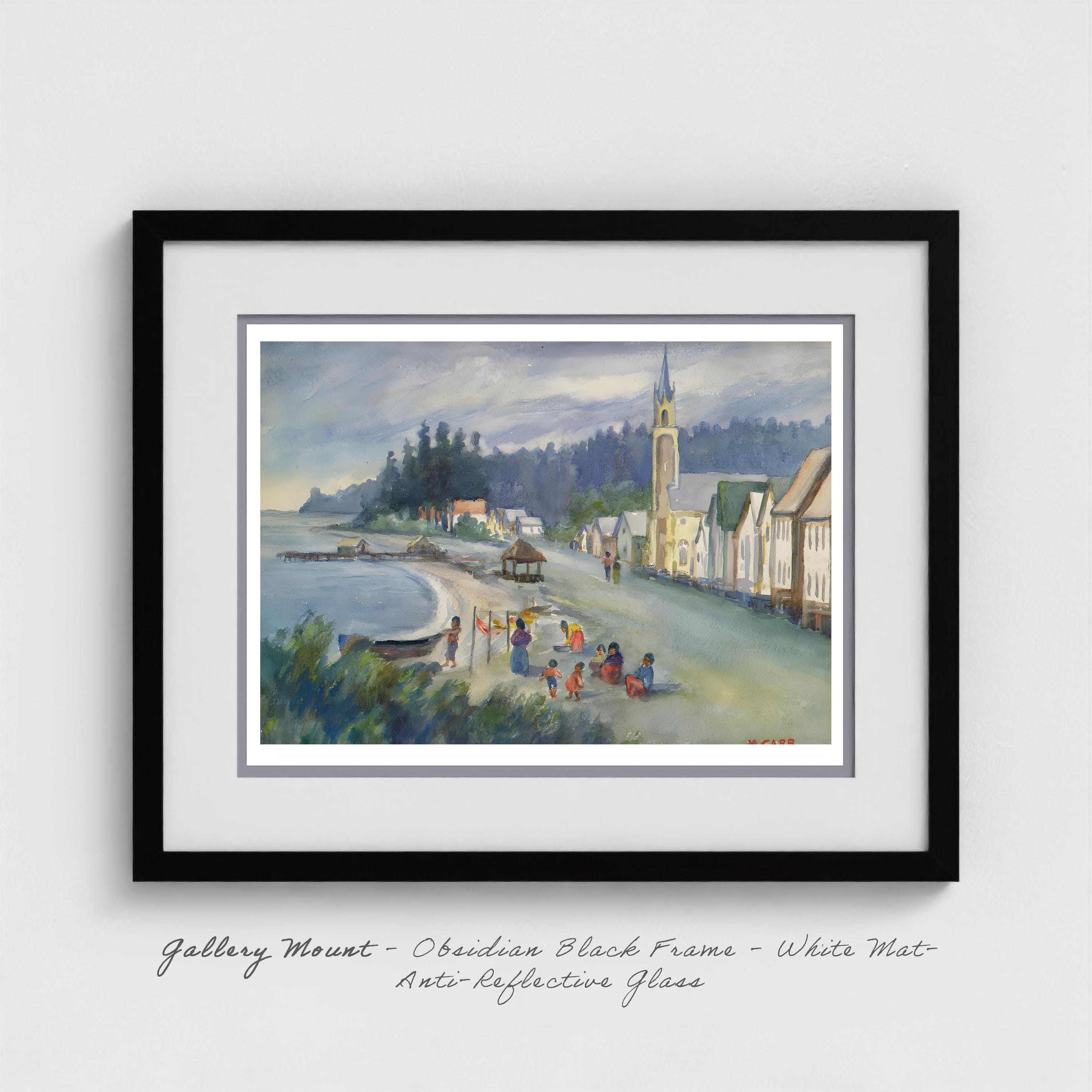 Gallery Mount - Your 11.5" x 15.5" artwork print is enclosed by a grey/white margin then a 2" white matte, protected by a 16"x20" glaze and enclosed with a 1.5" hardwood frame, ready for hanging (19x23" exterior dimensions)