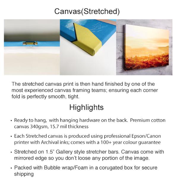 STUDIO CANVAS (20x24”): Museum-quality stretched canvas with 1.5” deep gallery wrap — professional presentation