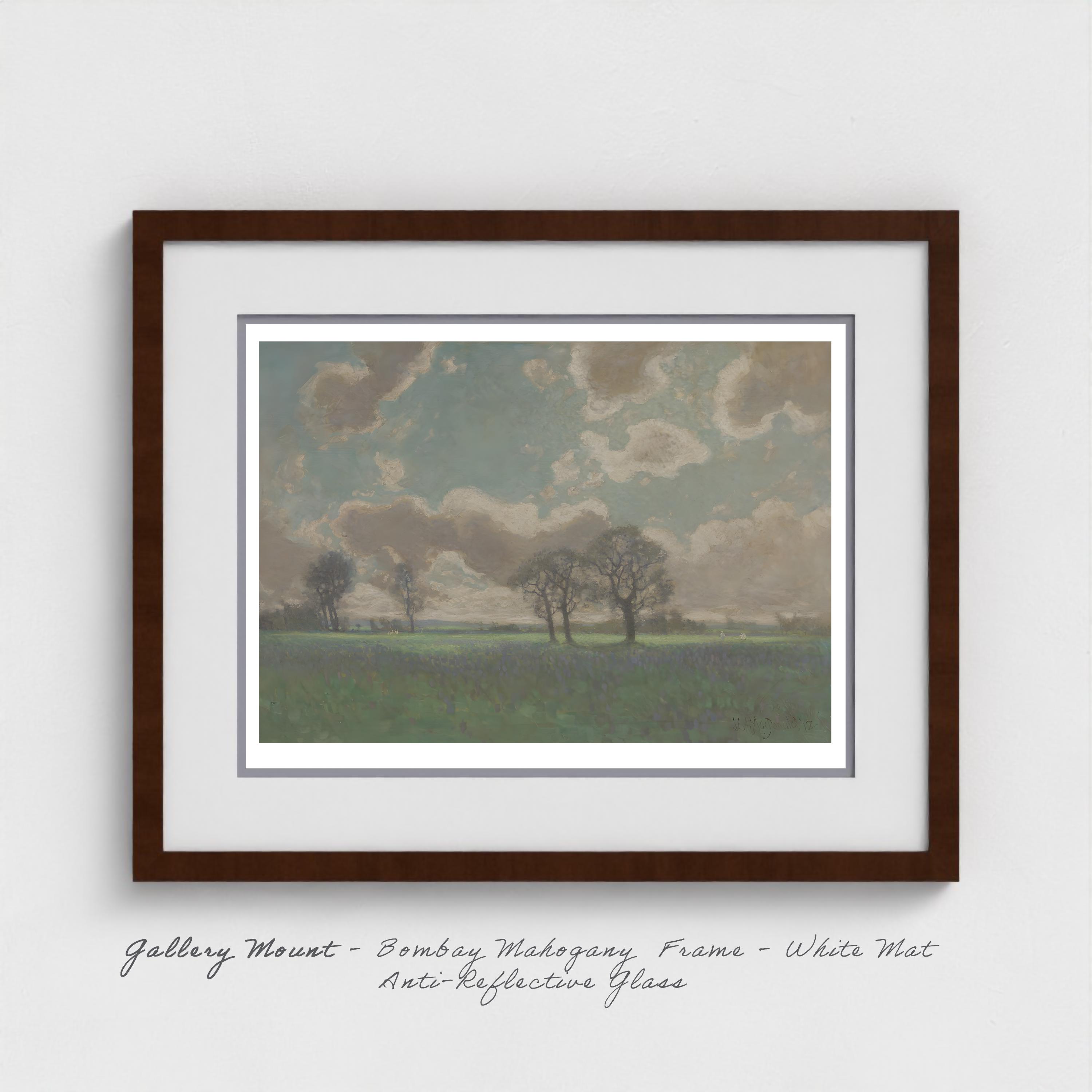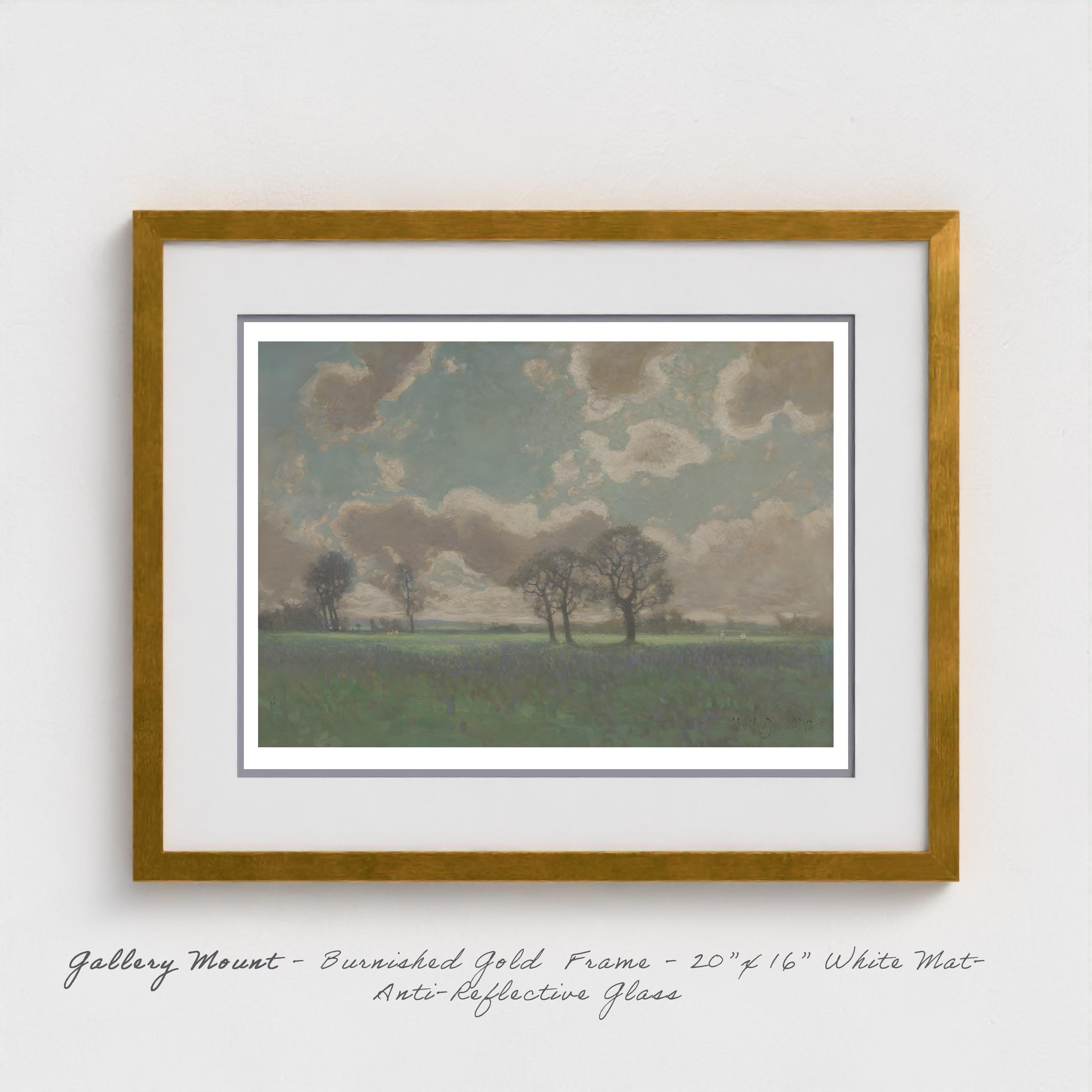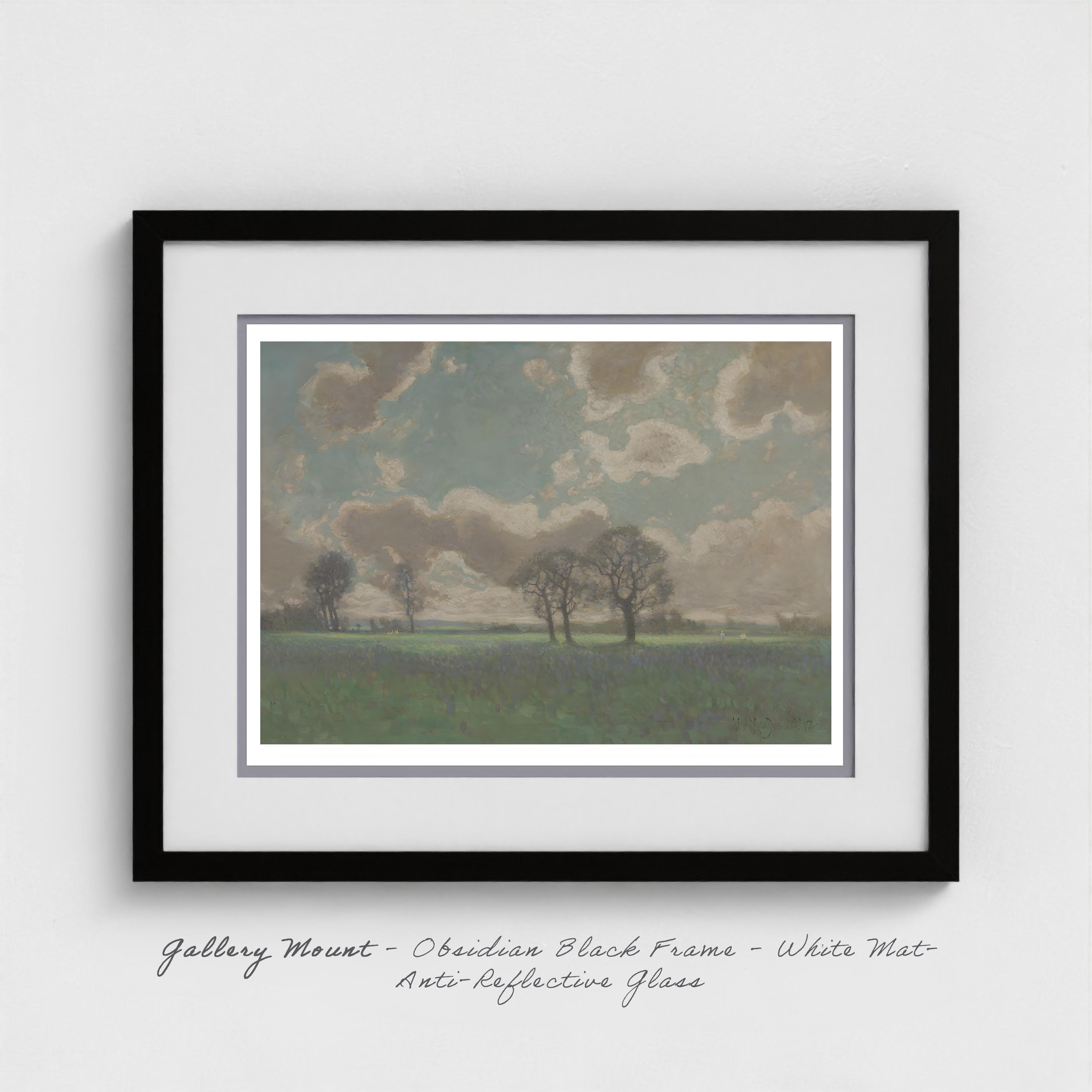 Gallery Mount - Your 11.5" x 15.5" artwork print is enclosed by a grey/white margin then a 2" white matte, protected by a 16"x20" glaze and enclosed with a 1.5" hardwood frame, ready for hanging (19x23" exterior dimensions)