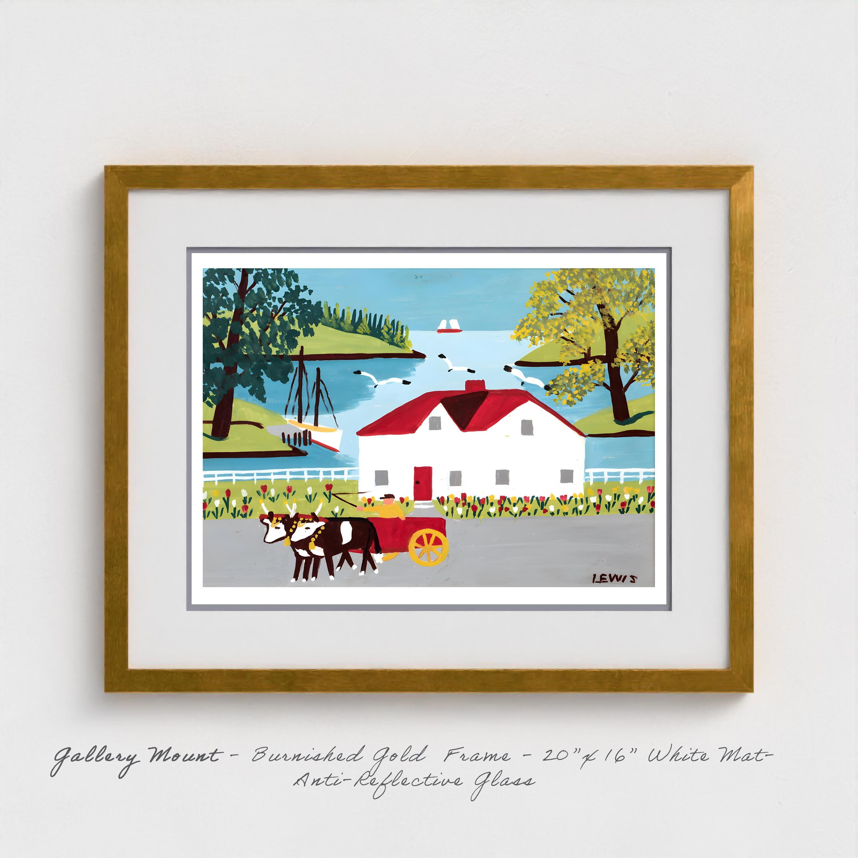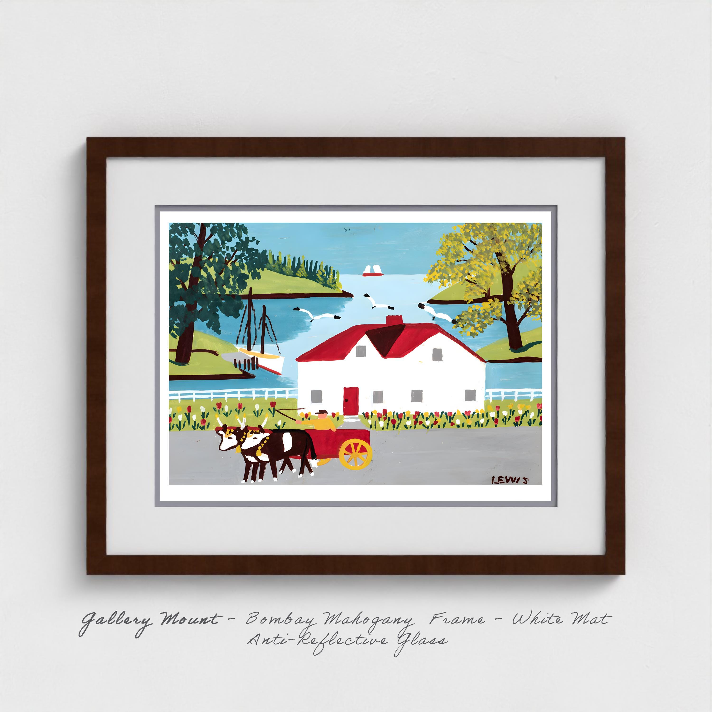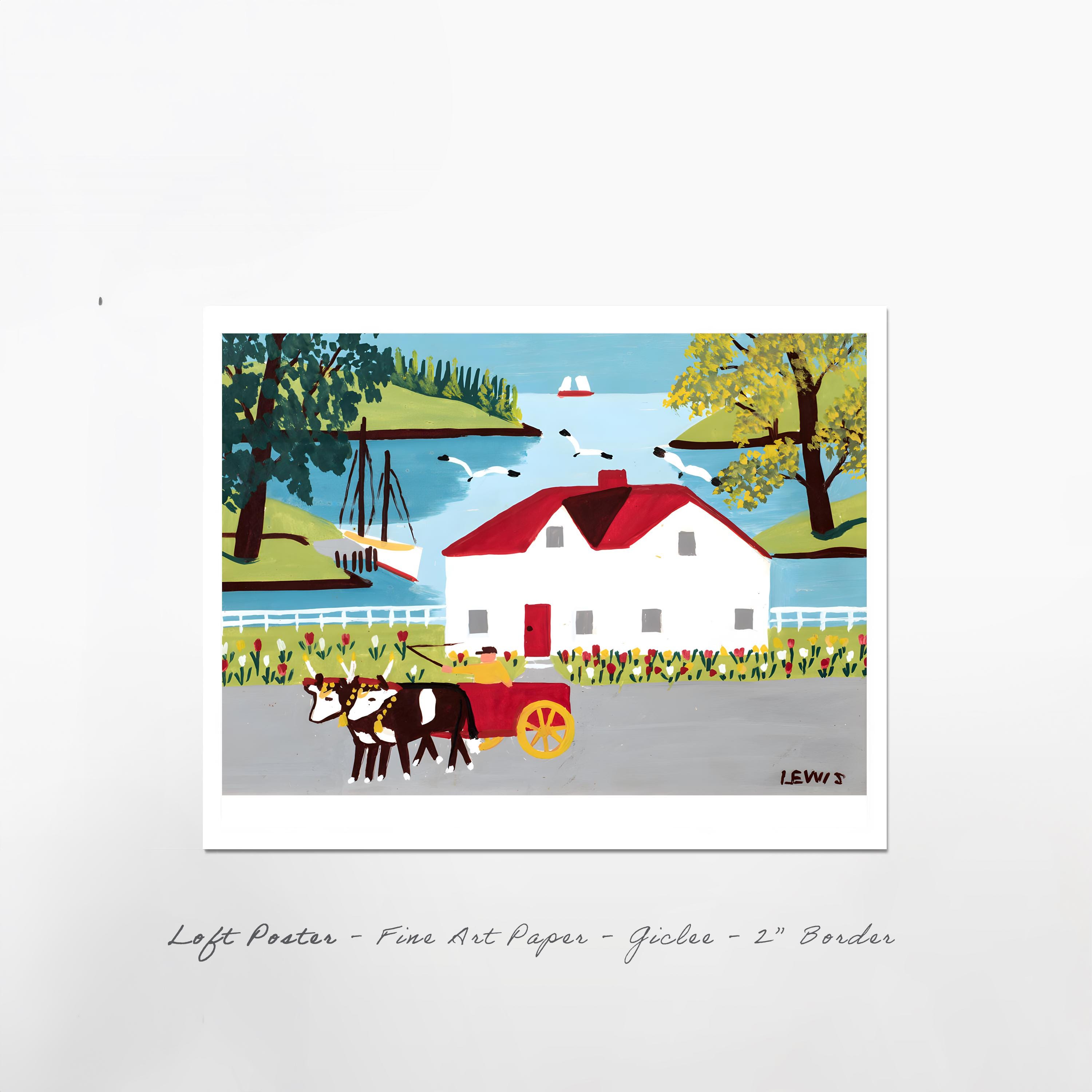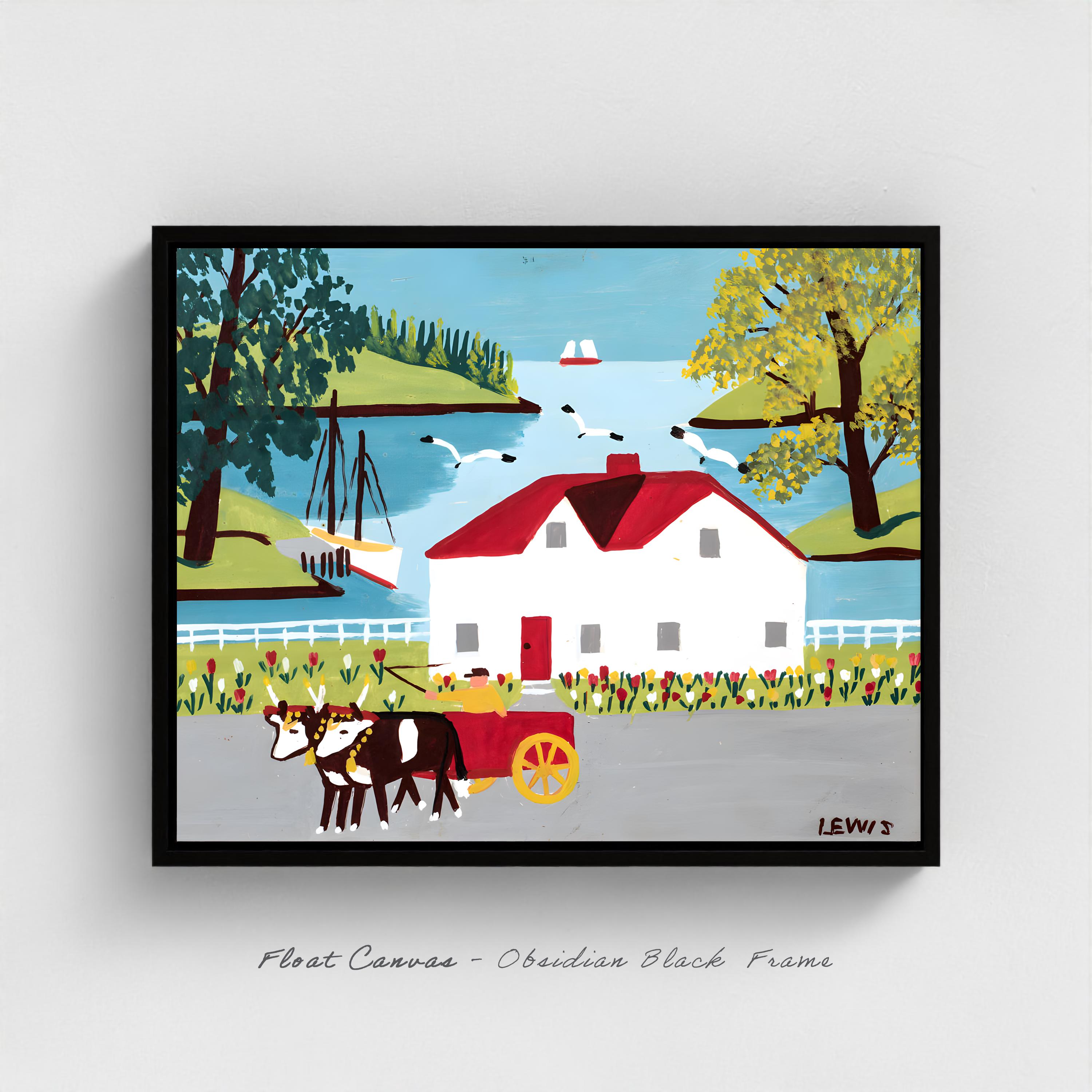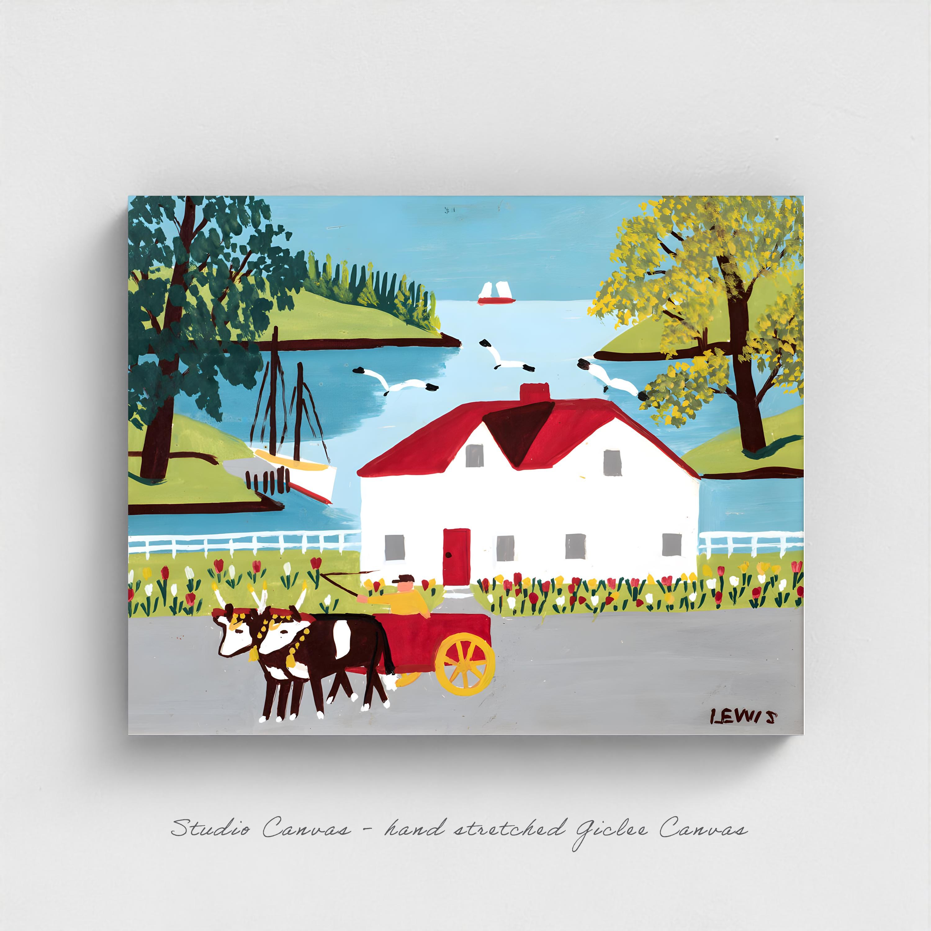 Embrace the timeless rhythm of Maritime rural life through Maud Lewis's peaceful "House and Ox Cart by the River," honouring the essential partnership between home, working animals, and waterways that sustained Nova Scotia's countryside communities through generations of seasonal labour and agricultural prosperity. This serene work showcases Lewis's profound understanding of how rivers connected rural households to transportation networks and economic opportunities, transforming the humble ox cart and riverside dwelling into folk art documentation of the agricultural wisdom and water-dependent lifestyle that enabled Maritime farming families to build sustainable livelihoods where flowing water meant both practical necessity and the natural highway that connected isolated rural properties to markets, neighbours, and the wider world beyond farm boundaries.