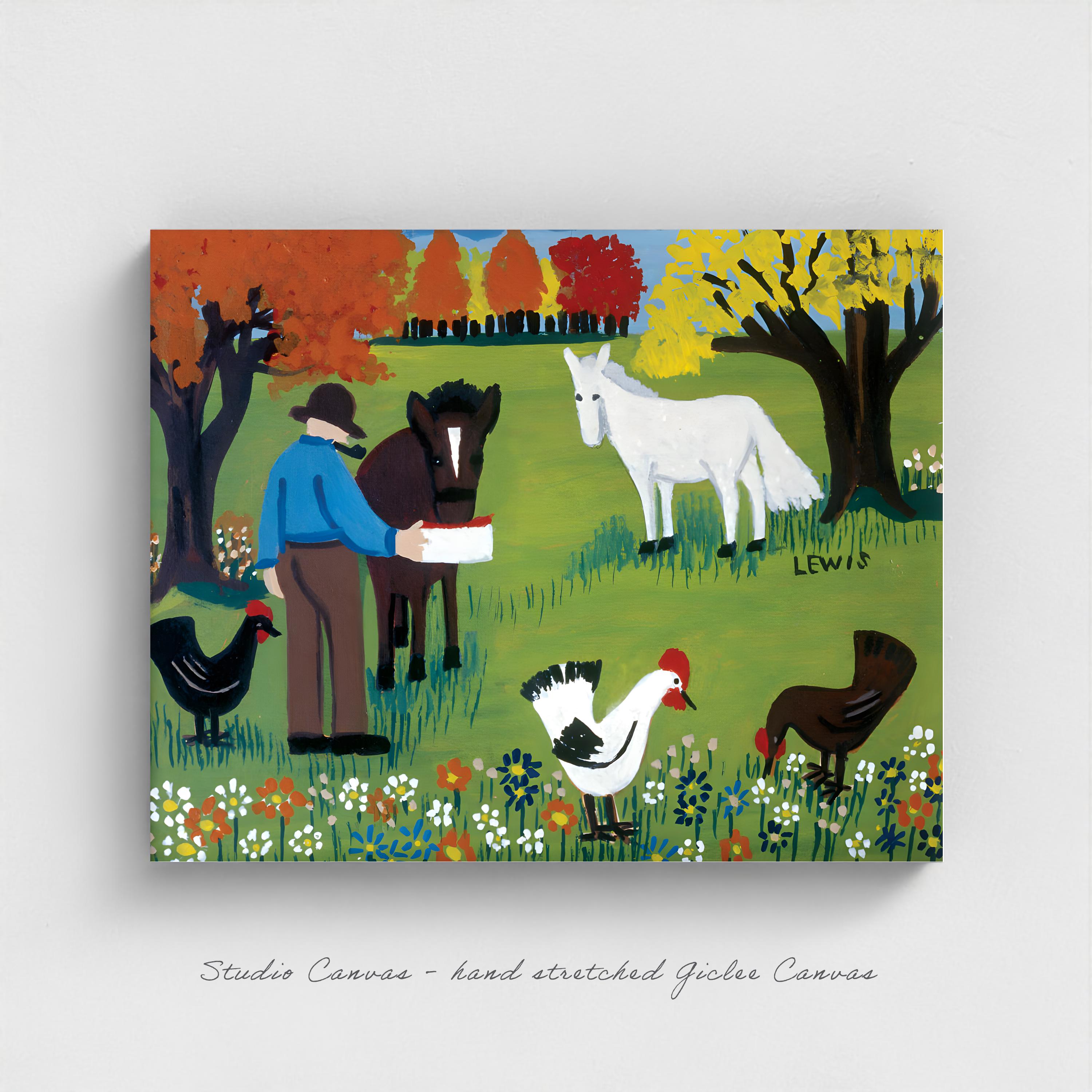 Perfect for animal care enthusiasts who understand Maritime farming ethics, collectors of authentic Nova Scotia agricultural culture, or anyone seeking folk art that honours the animal stewardship and farming responsibility that sustained rural families through Maritime agricultural heritage. Lewis's caring vision makes this essential documentation of Canada's animal care folk art traditions.