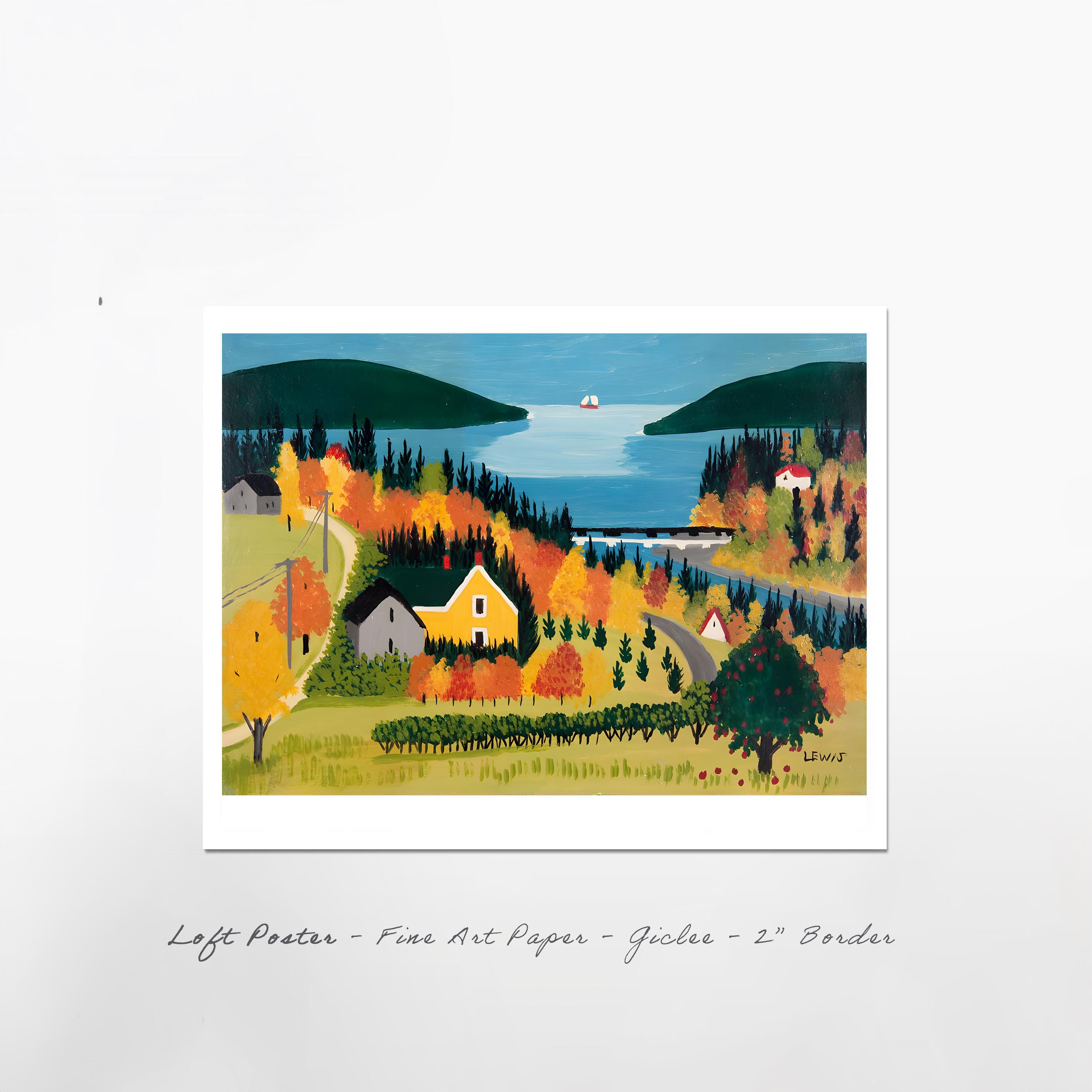 Experience the delightful charm of Maud Lewis with this heartwarming harbour scene from 1958. A cheerful yellow house sits nestled by the water’s edge, painted in her signature bold, happy colors that capture the cozy simplicity of Nova Scotia coastal living. Every brushstroke radiates the warmth and optimism that made Maud’s work so treasured.