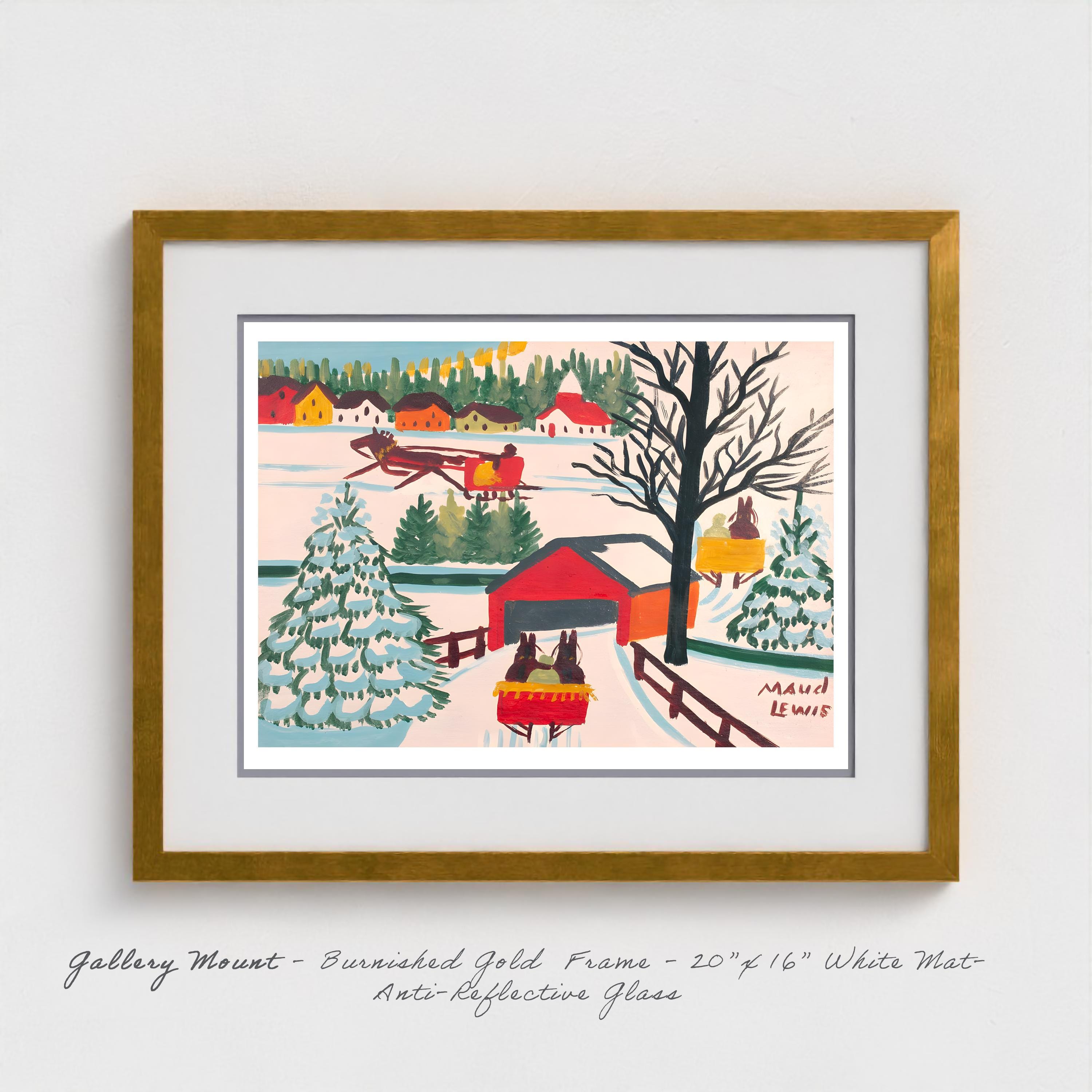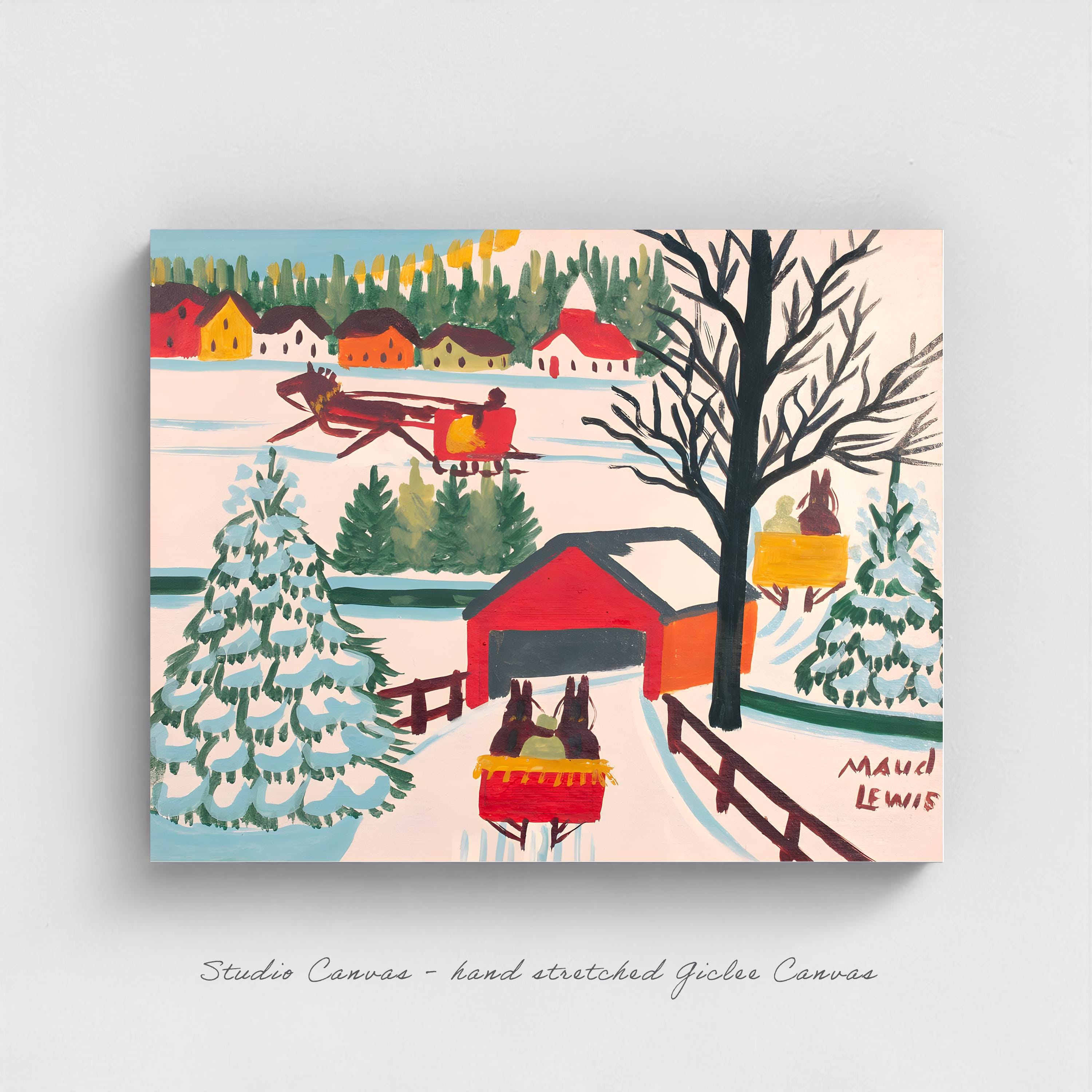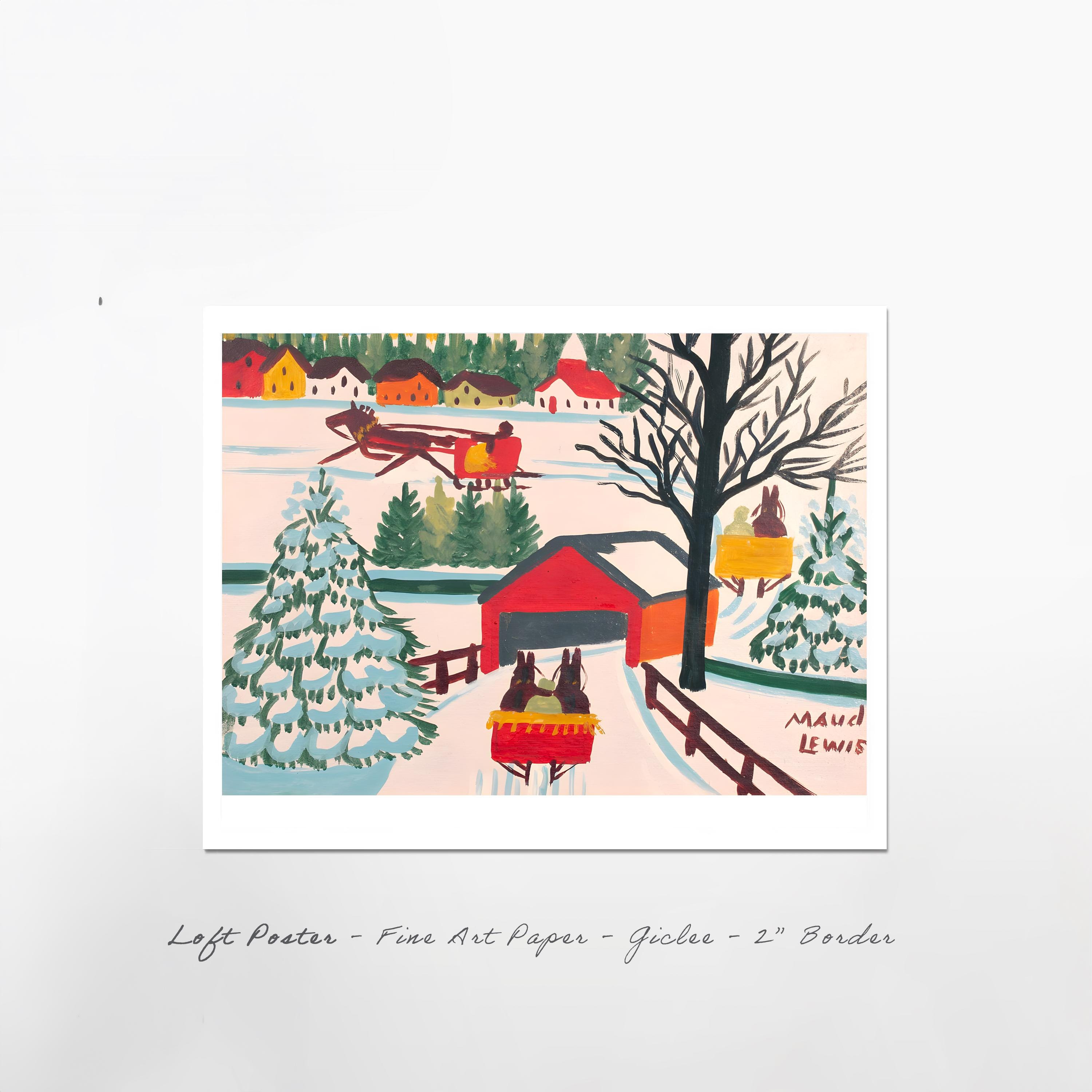 Maud Lewis Folk Art Print: Sleighs and Covered Bridge, Nova Scotia Winter