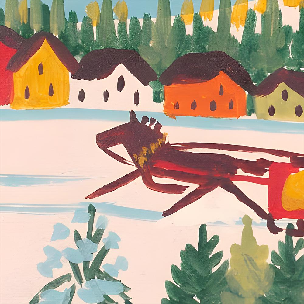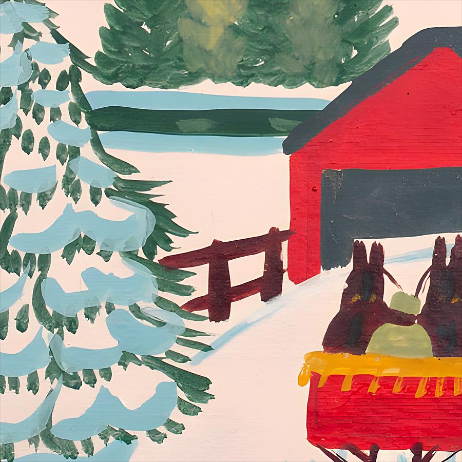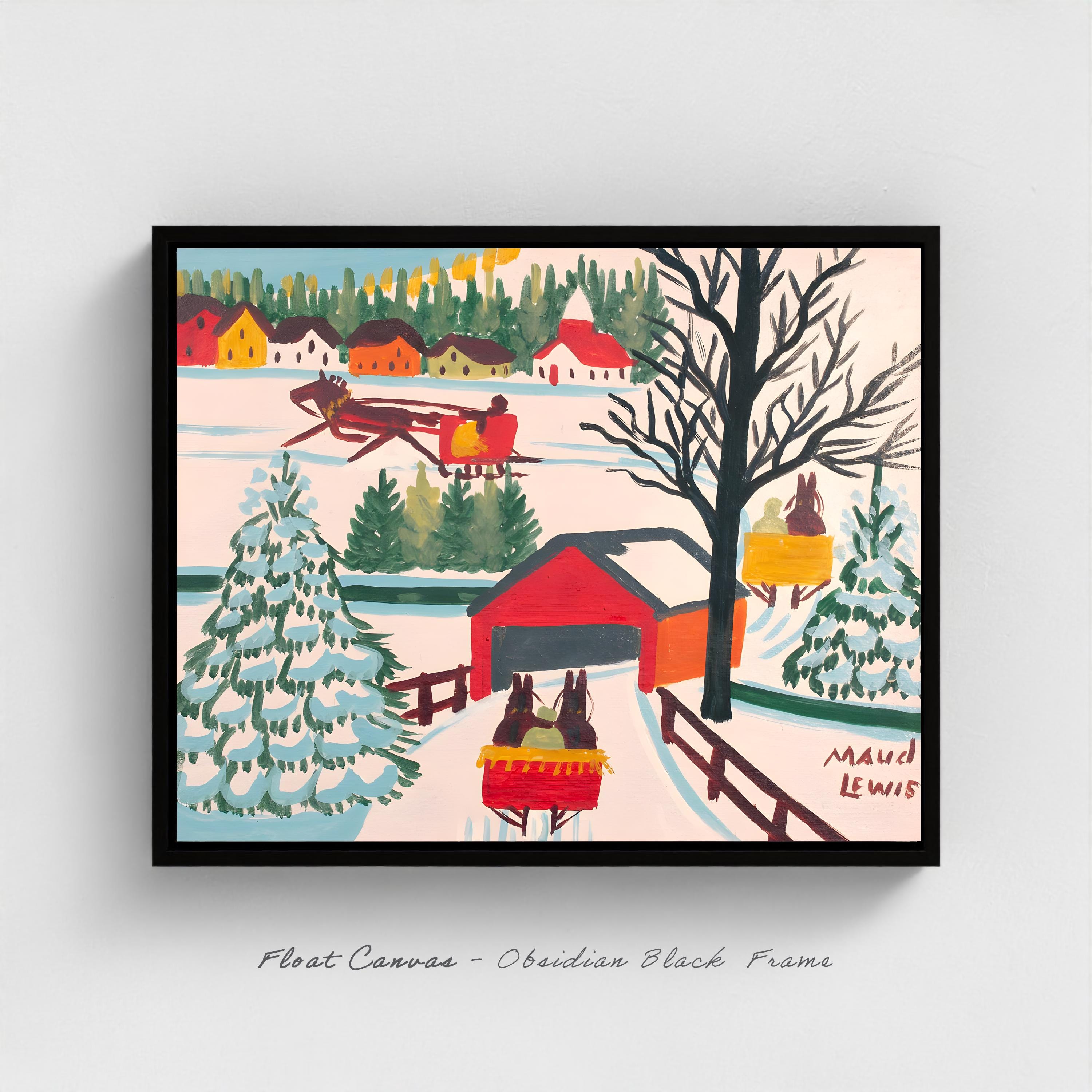 Maud Lewis Folk Art Print: Sleighs and Covered Bridge, Nova Scotia Winter