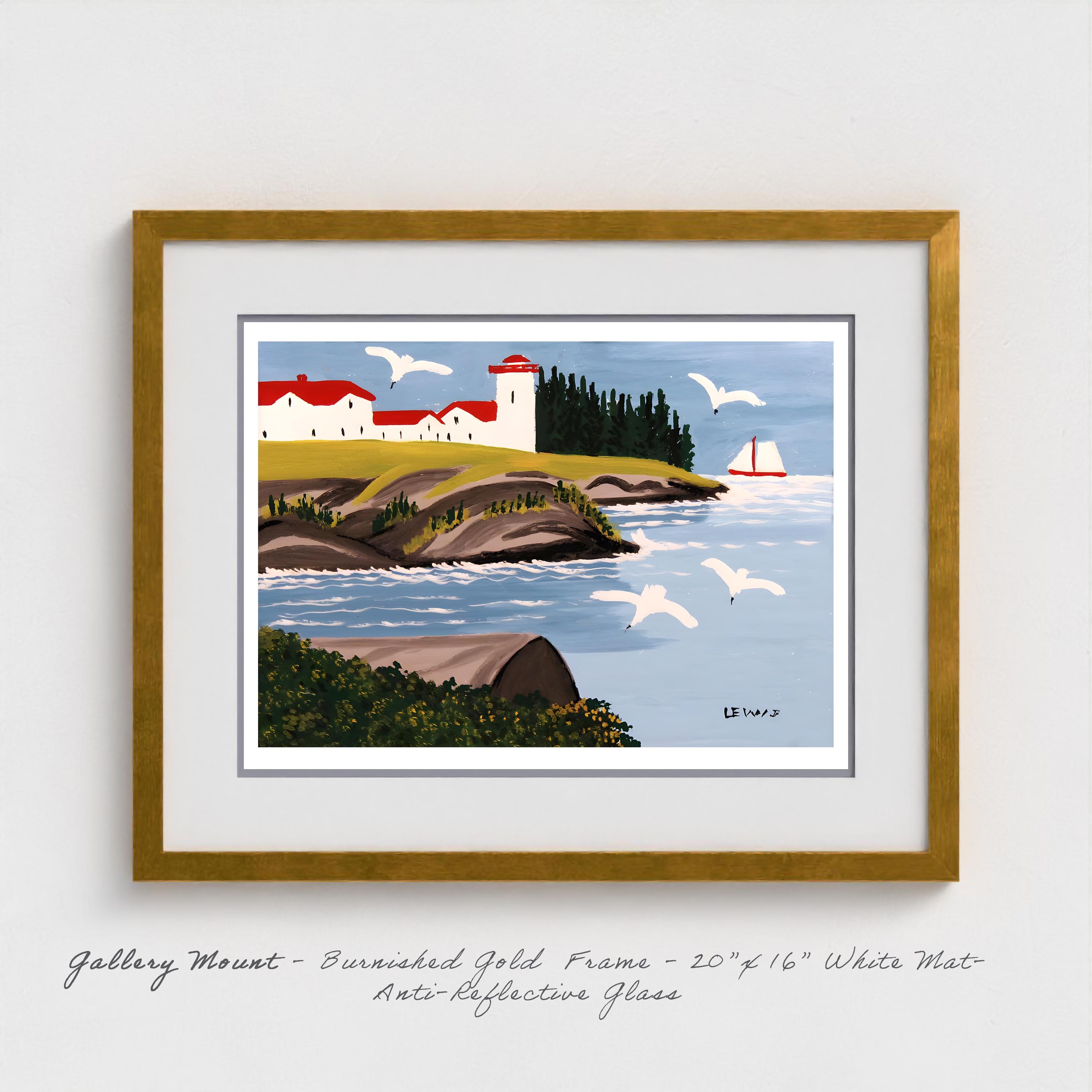 Gallery Mount - Your 11.5" x 15.5" artwork print is enclosed by a grey/white margin then a 2" white matte, protected by a 16"x20" glaze and enclosed with a 1.5" hardwood frame, ready for hanging (19x23" exterior dimensions)