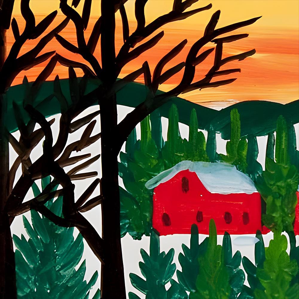 Deer Overlooking Village, painted in 1966, invites us into Maud's vision at the height of her artistic powers. Against a soft blue sky, a majestic buck stands watch over a cluster of houses nestled in an impossibly green hillside. Autumn leaves cling to trees, their fiery oranges ignited by Maud's unmixed Tinsol paint squeezed directly from the tube. Strokes of brown and black detail the deer's serene face as it surveys a world of eternal peace.