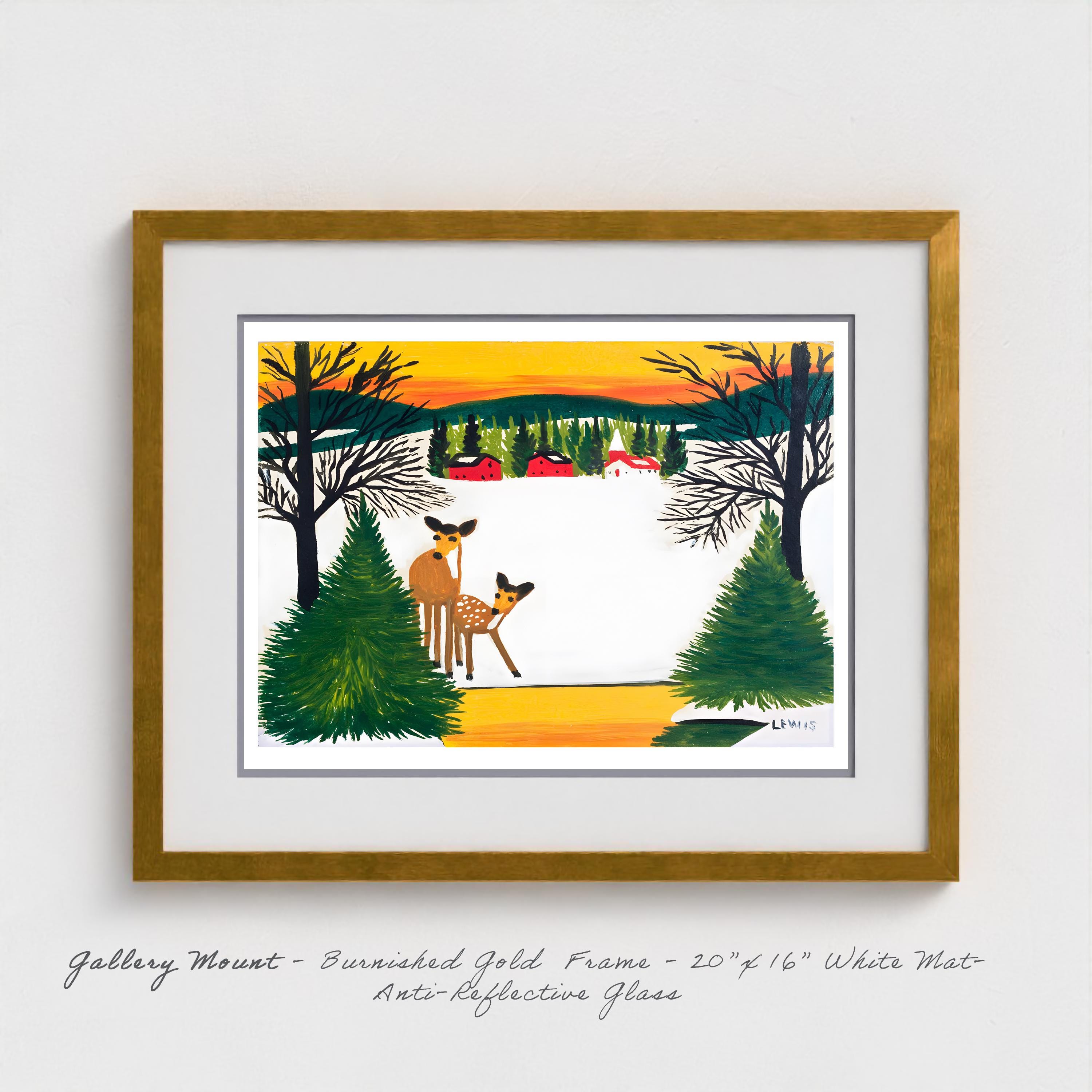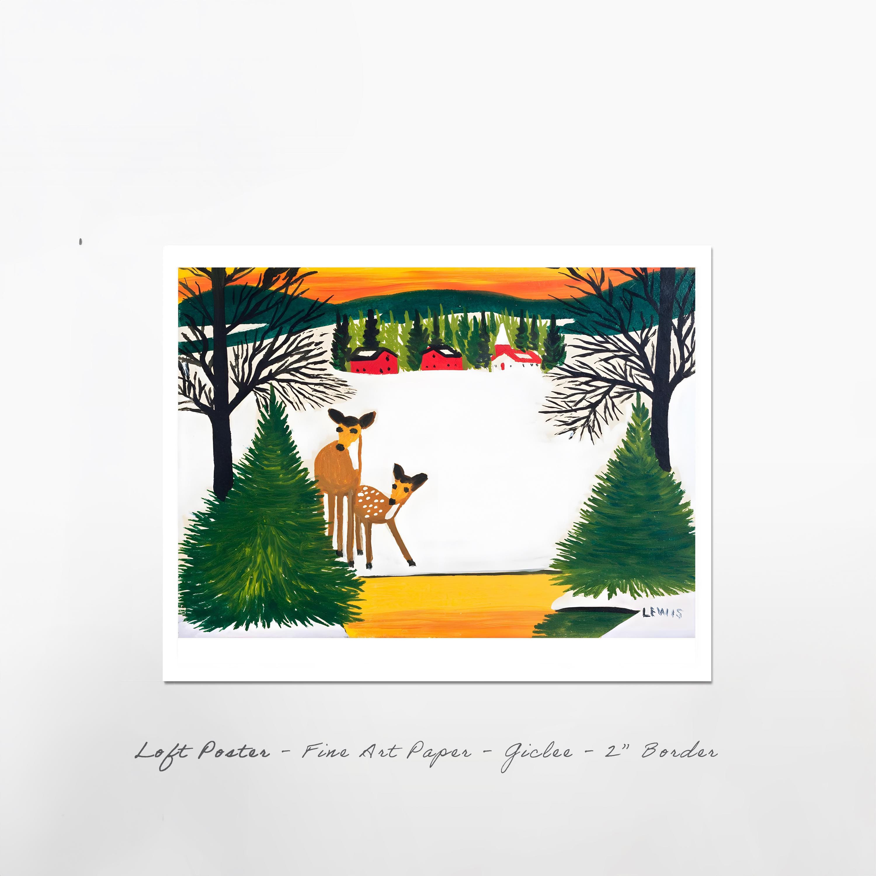 This museum-quality Giclee reproduction captures the warm glow of Lewis's sunset palette and the characteristic boldness of her early technique. The deer maintains its gentle presence, the sunset colors radiate their nostalgic warmth, and the composition retains that perfect simplicity Lewis achieved so effortlessly. Every element works together to create a scene that's both peaceful observation and imaginative longing.