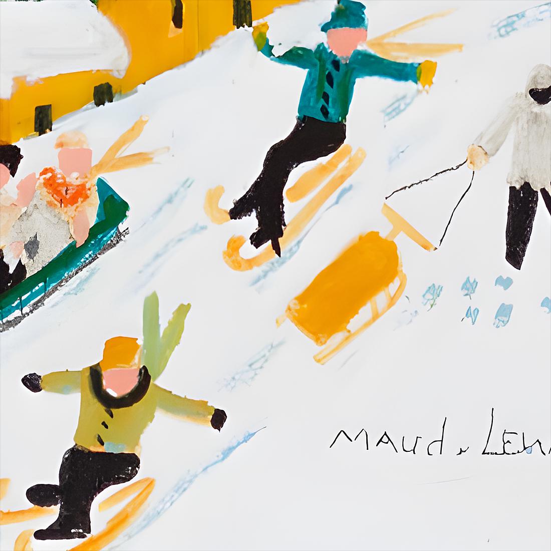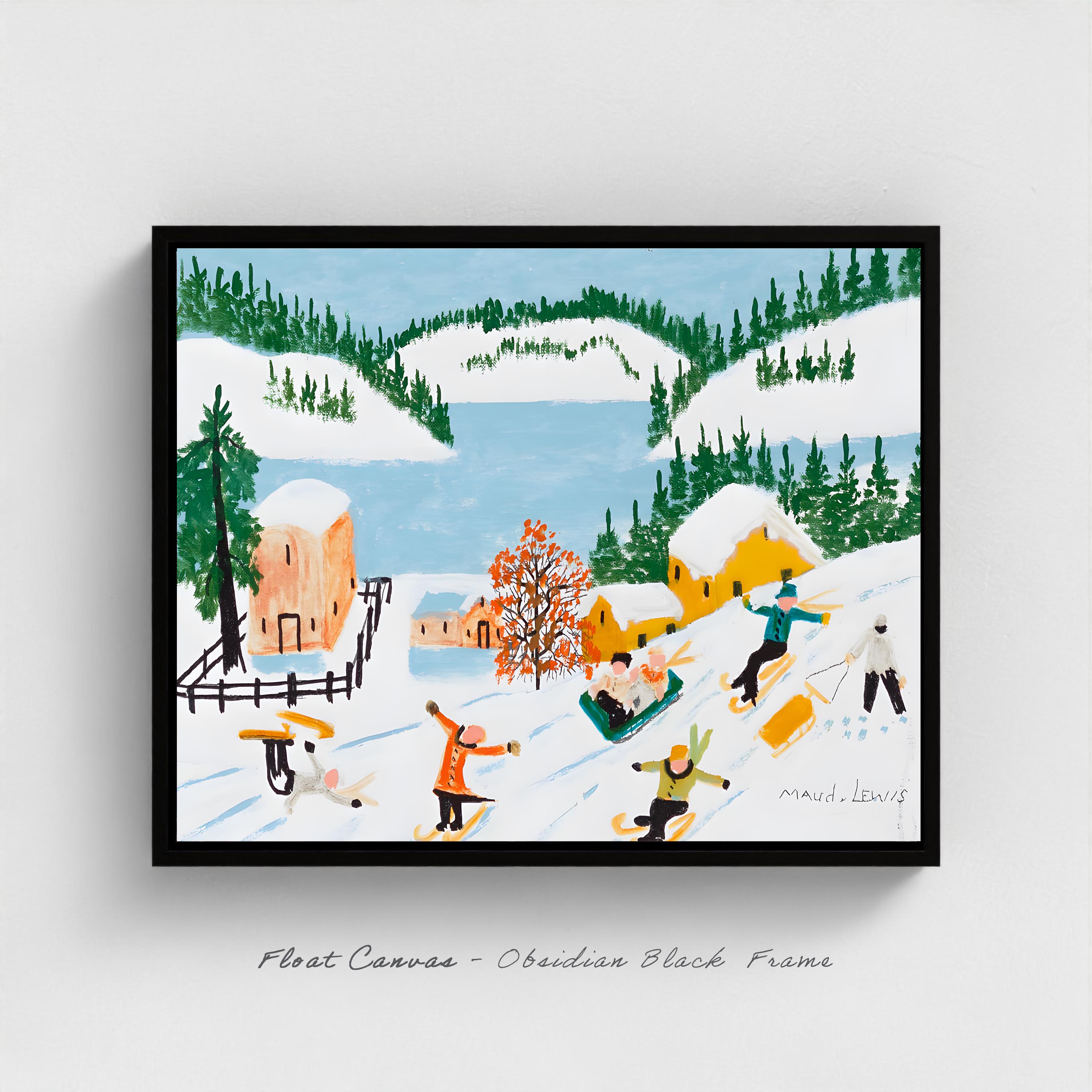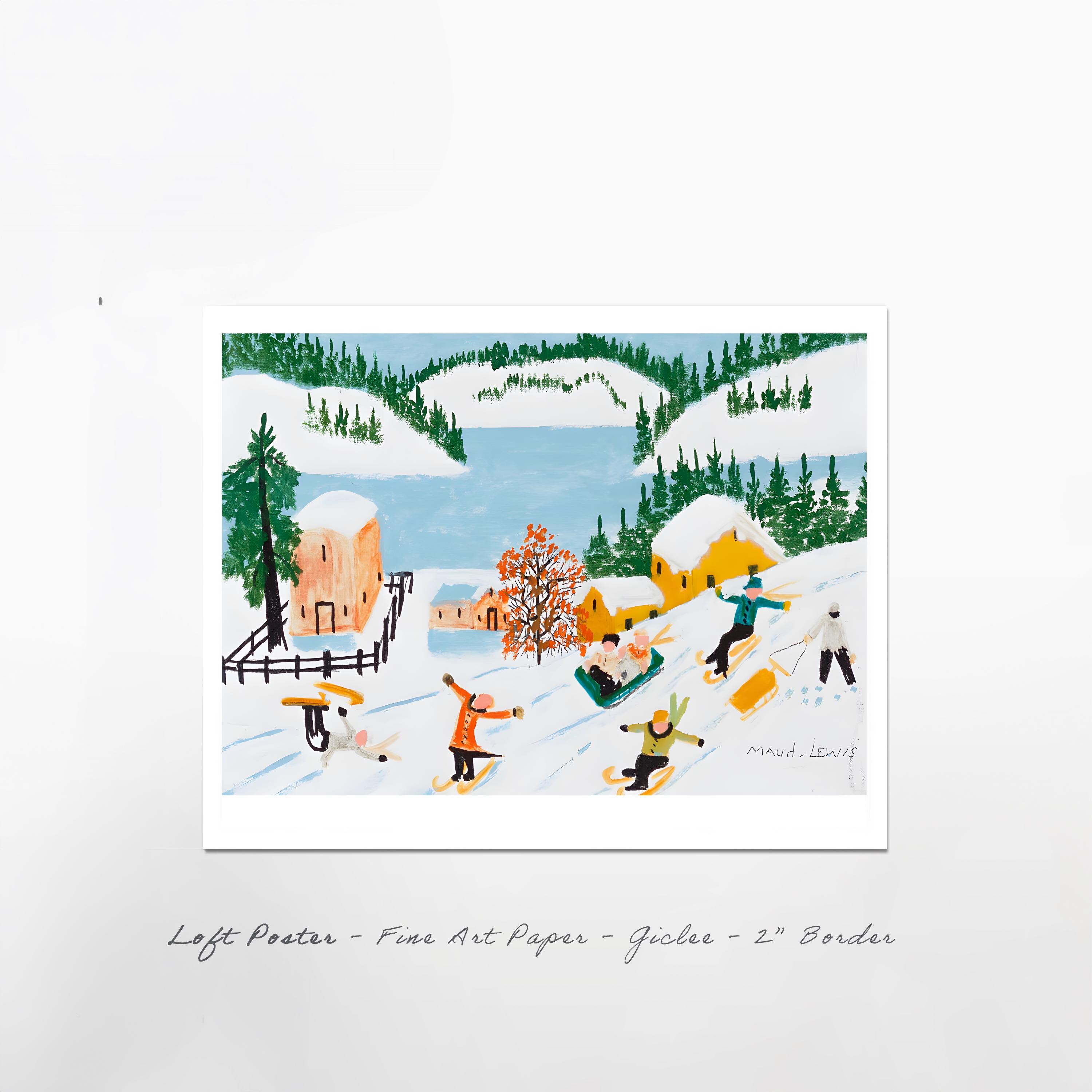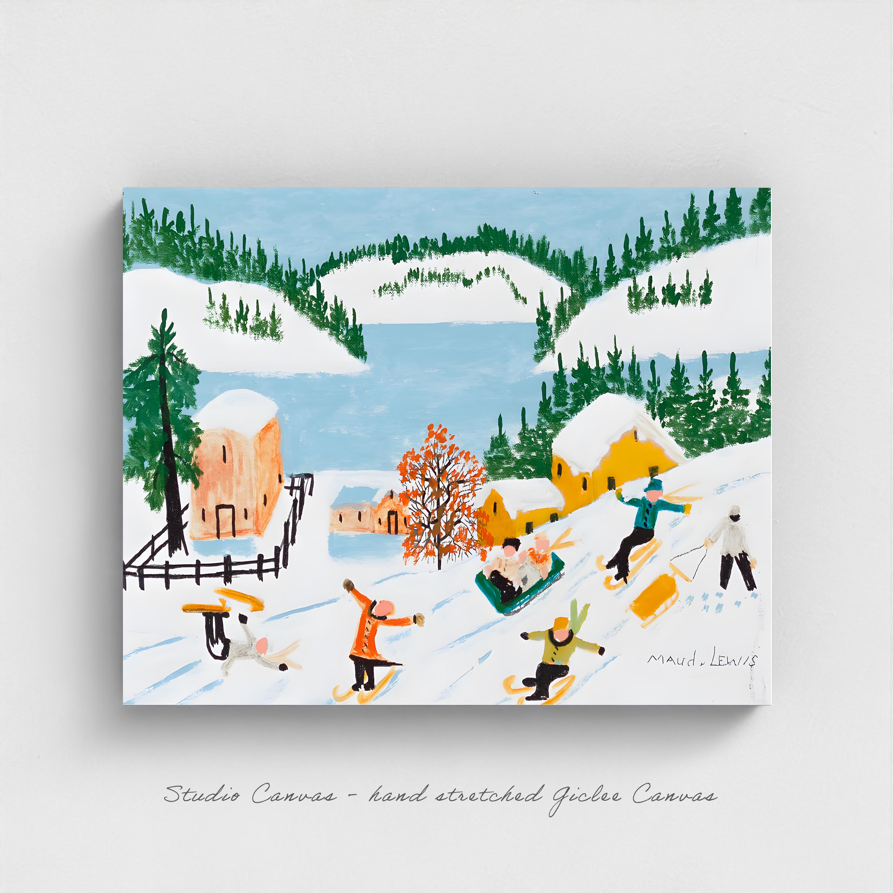 This delightful winter recreation scene captures Maud Lewis at her most playful and nostalgic, painting the childhood joys that lived on in her imagination decades after her own ability to participate in such activities had passed. Children on skis fly down snowy hills while others enjoy sledding, all set against a backdrop of brightly colored houses in vivid reds and yellows, ice-blue water, and white hills fringed with dark green pines. It's pure winter happiness translated into paint.
