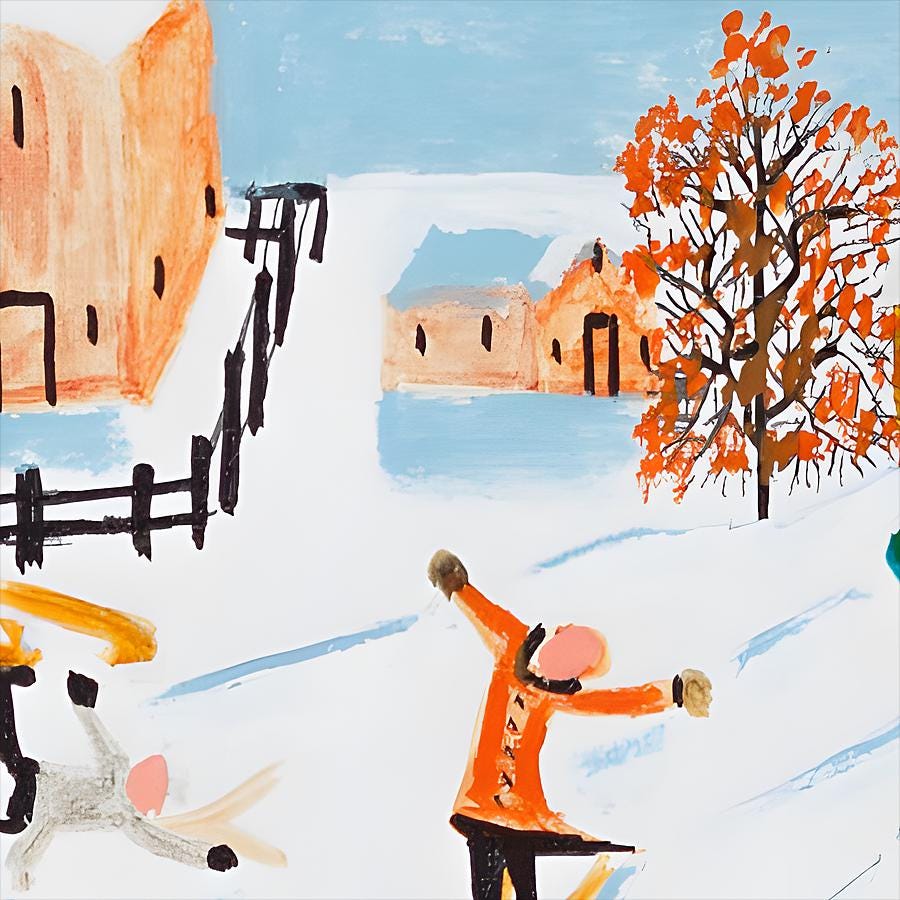 The bright houses in the background aren't merely decorative elements. They represent warmth, safety, and the community waiting at the end of play—hot chocolate by the stove, wet mittens drying, stories of the day's adventures. Lewis always painted complete emotional landscapes, not just visual scenes. Every element contributes to an overall feeling of contentment and belonging.