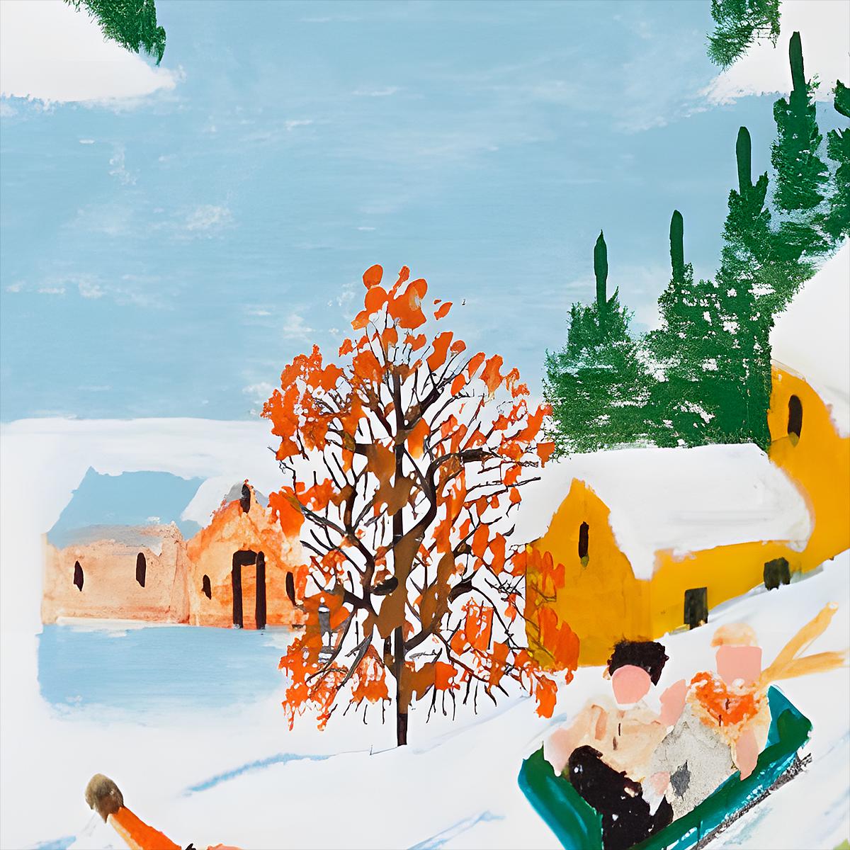 Her technique was deceptively simple—paints used straight from whatever sources she could gather, never mixed or blended. Those bright primary colors sit next to each other in bold patches, creating that instantly recognizable Maud Lewis aesthetic. The children's clothing likely features her favorite reds and blues, the snow remains pure white, and the houses glow in those warm yellows and oranges she loved. Everything is painted with the same direct, unshaded approach that made her work so distinctive.