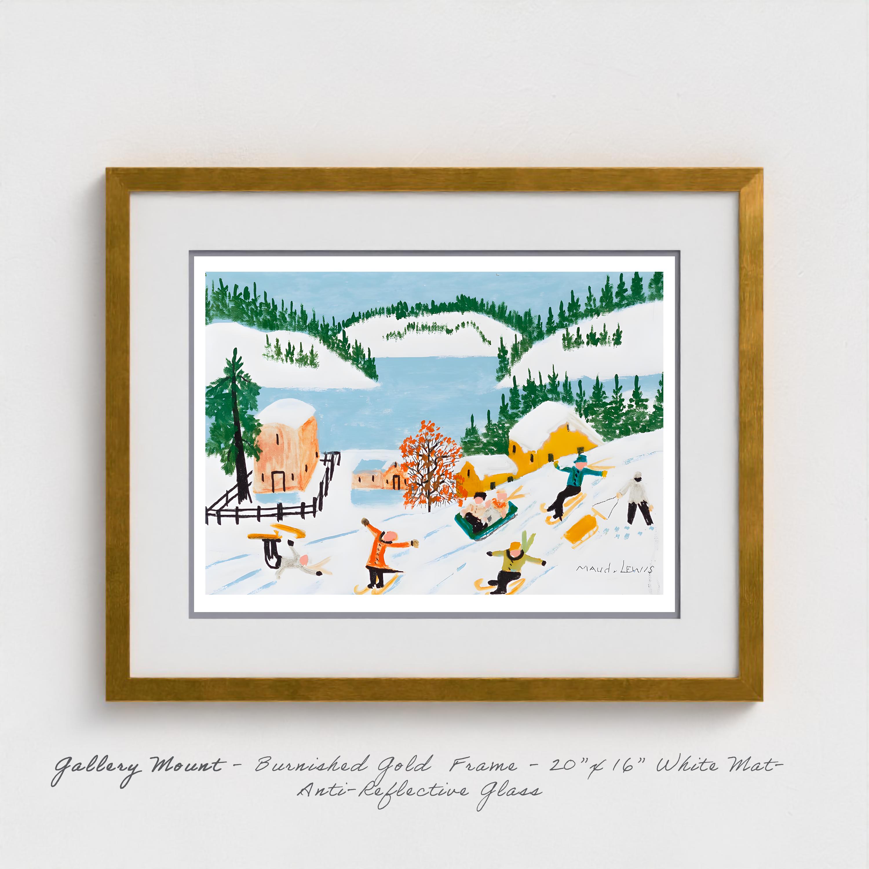 This reproduction captures Lewis's bold, direct technique perfectly through museum-quality Giclee printing. The colors maintain their brilliant intensity—those reds and yellows sing against the white snow, the blue water gleams, the green pines stand crisp against the winter sky. Every brushstroke retains the character of Lewis's arthritis-shaped hand movements, those distinctive rectilinear marks that became her signature style.