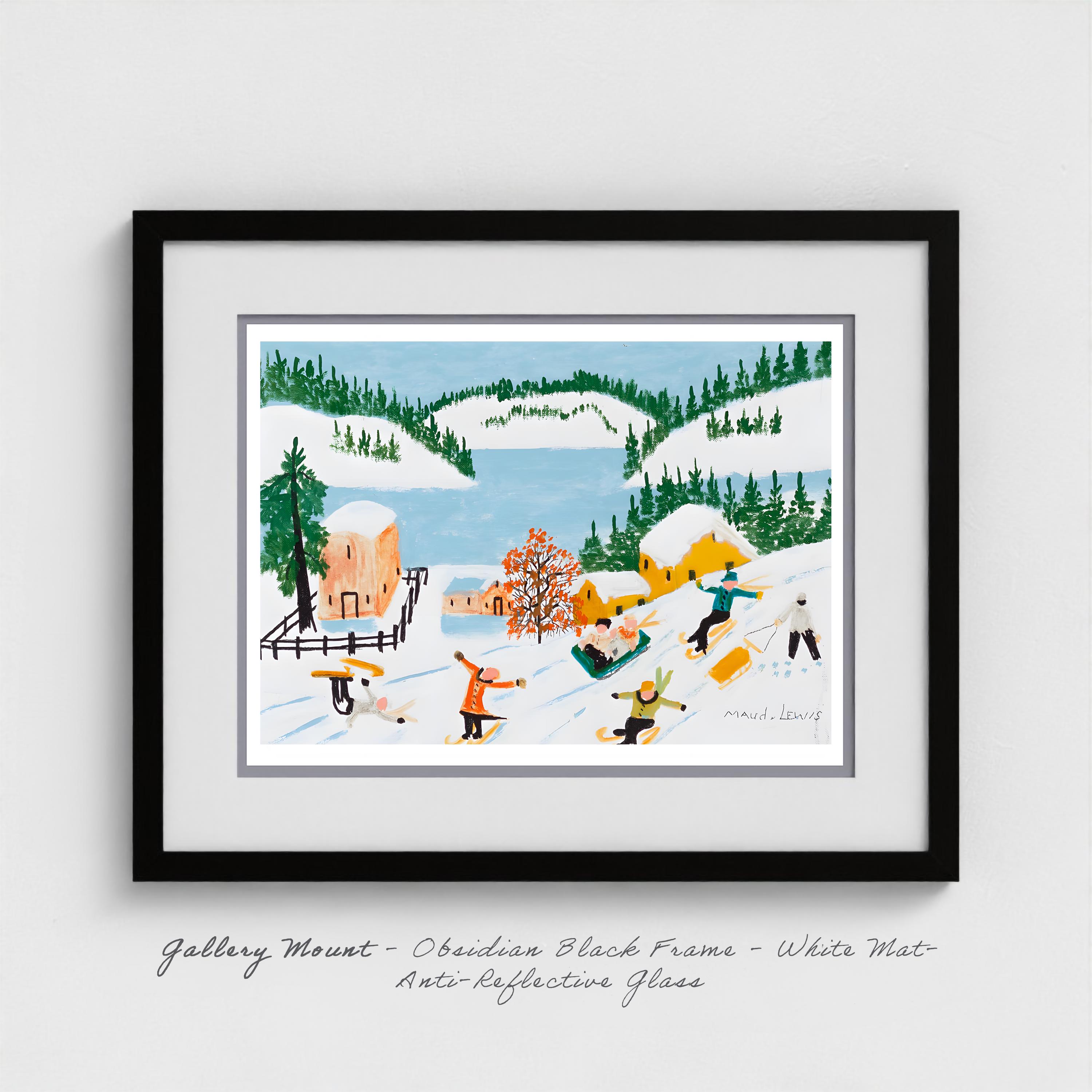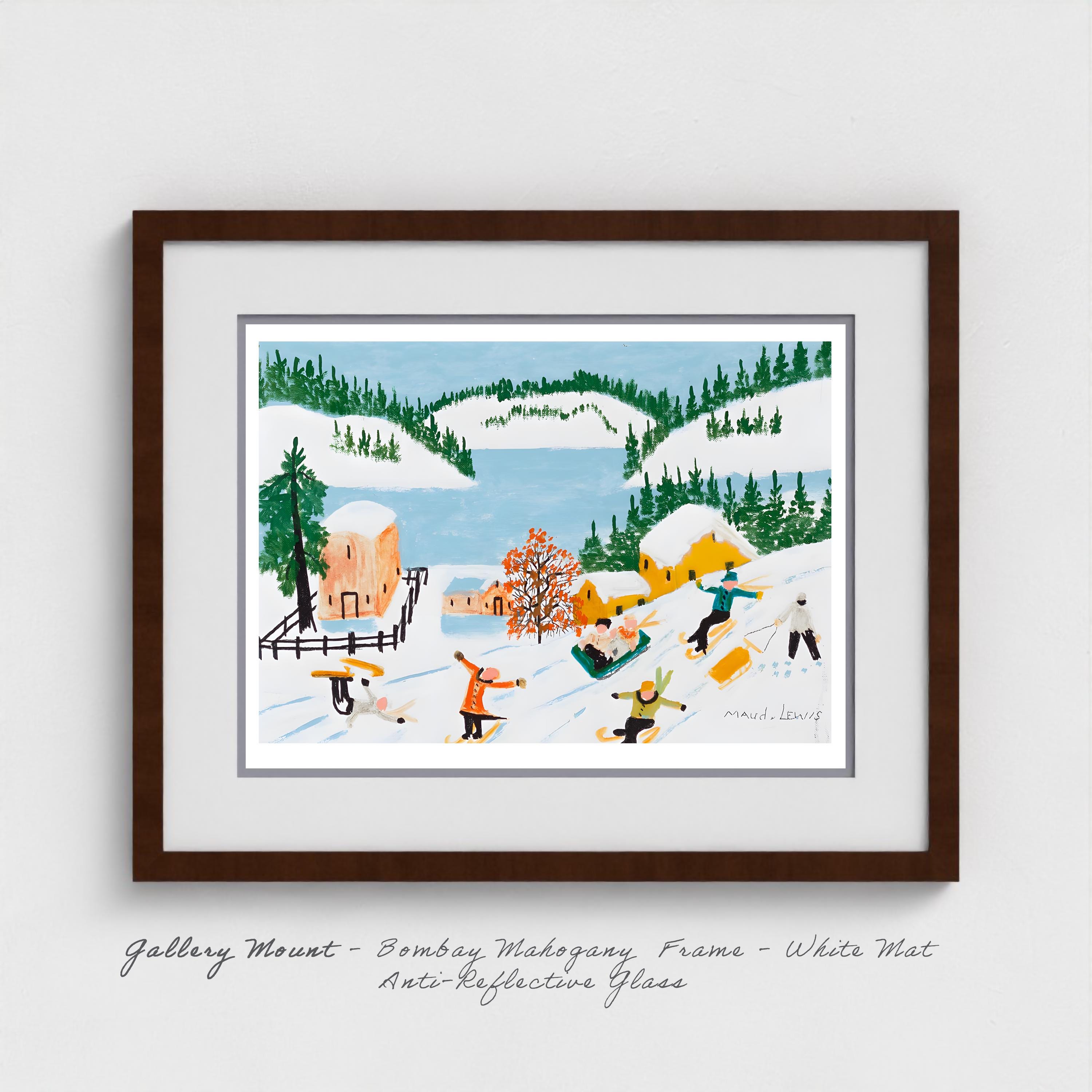 Winter sports and recreation scenes held special meaning for Lewis because they represented freedoms she herself could never fully experience. Born with birth defects and suffering from juvenile rheumatoid arthritis that worsened throughout her life, Lewis led what she called "a confined but happy home life" after leaving school at fourteen. While other children in Yarmouth and South Ohio skated, sledded, and skied down Maritime hills, Lewis watched from windows, absorbing every detail and storing these scenes of carefree movement in the visual memory she would draw on for her entire painting career.