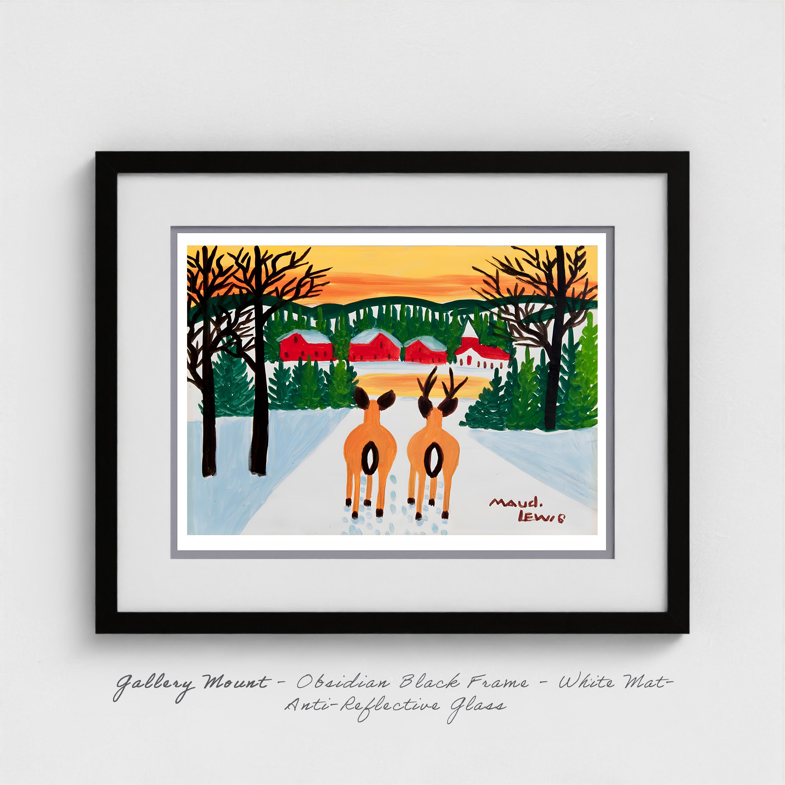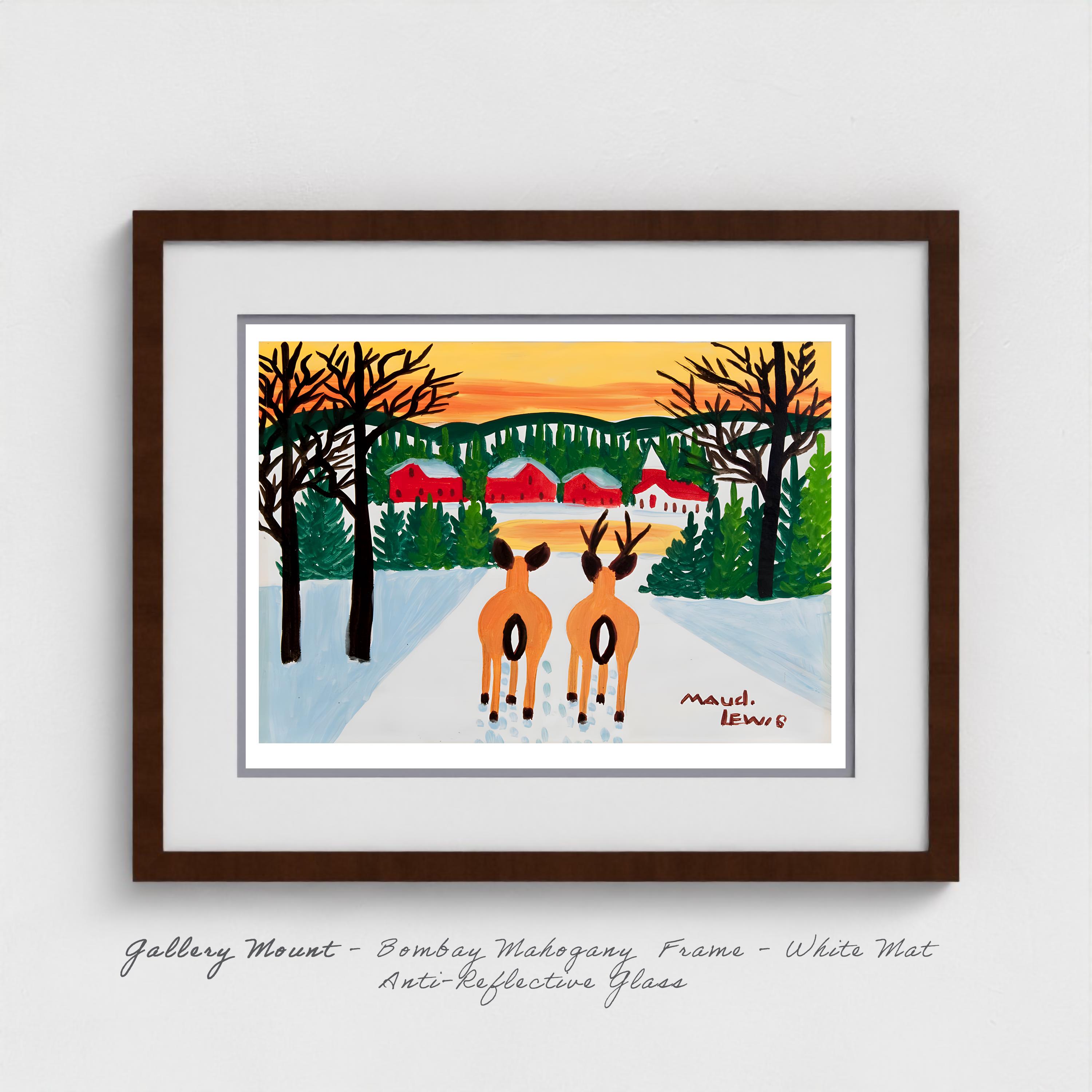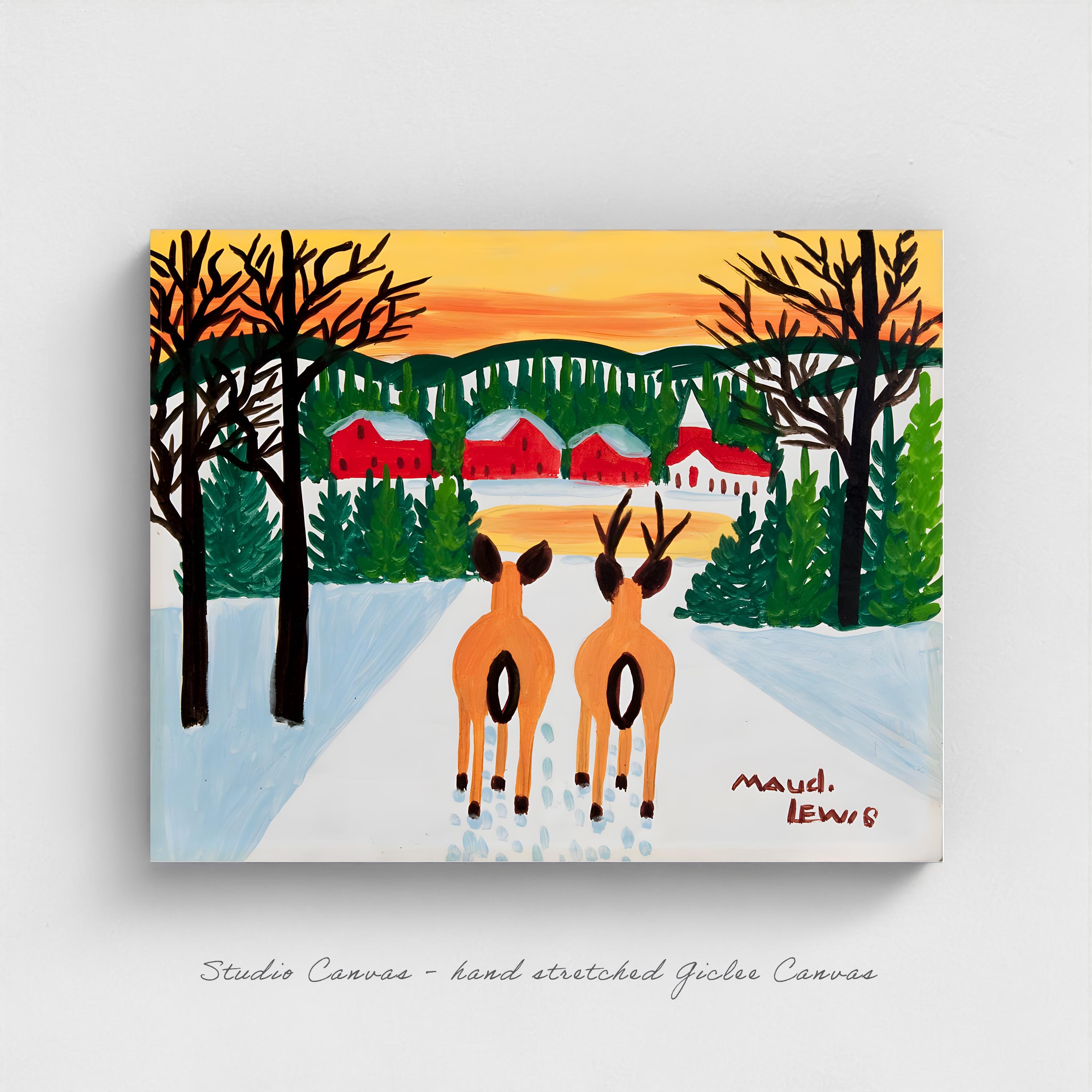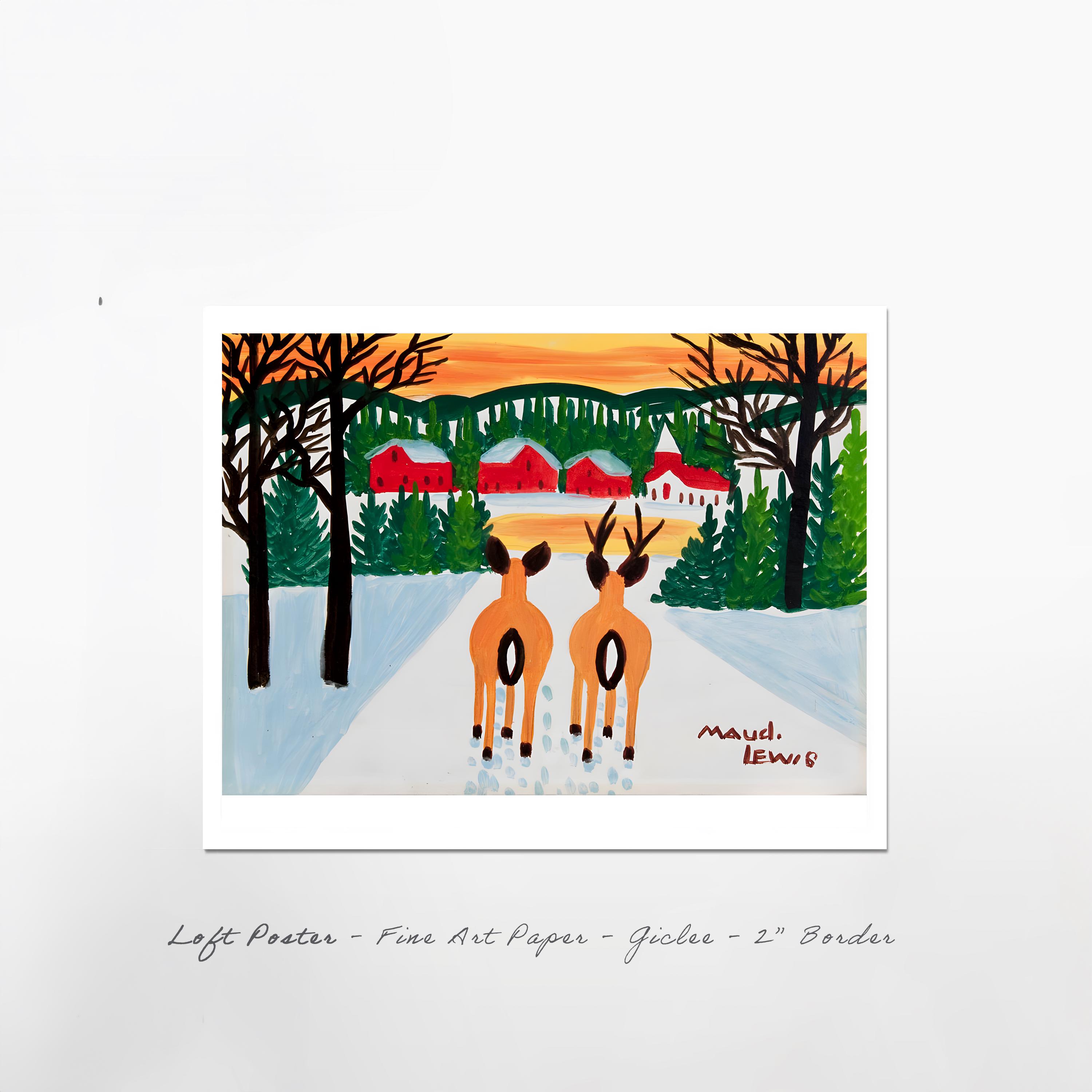 Deer Overlooking Village 1966 Maud Lewis Giclee Print | Nova Scotia Folk Art | Sunset Painting | Canadian Wildlife | Maritime Landscape
