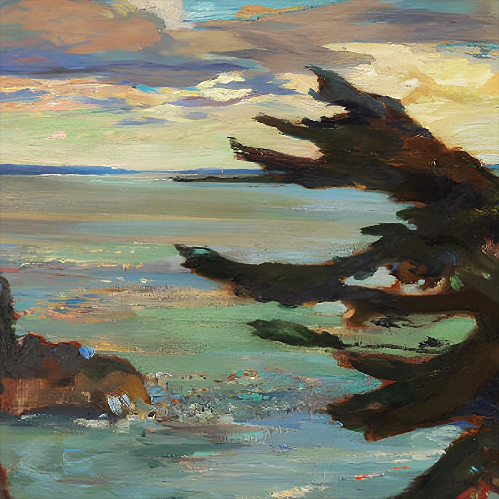 The painting that emerged during winter 1920-1921 showcases Varley's distinctive technique. Wind-swept pines cling tenaciously to rocky outcrops, their forms sculpted by relentless western gales. Dark blue hues dominate the churning waters, dotted with white crests that suggest turbulent energy barely contained beneath the surface. The distant shoreline forms simplified silhouettes against storm-laden skies. Varley's dynamic brushwork conveys movement and drama — not the frozen moment of a photograph but the accumulated experience of standing witness to nature's raw power.
