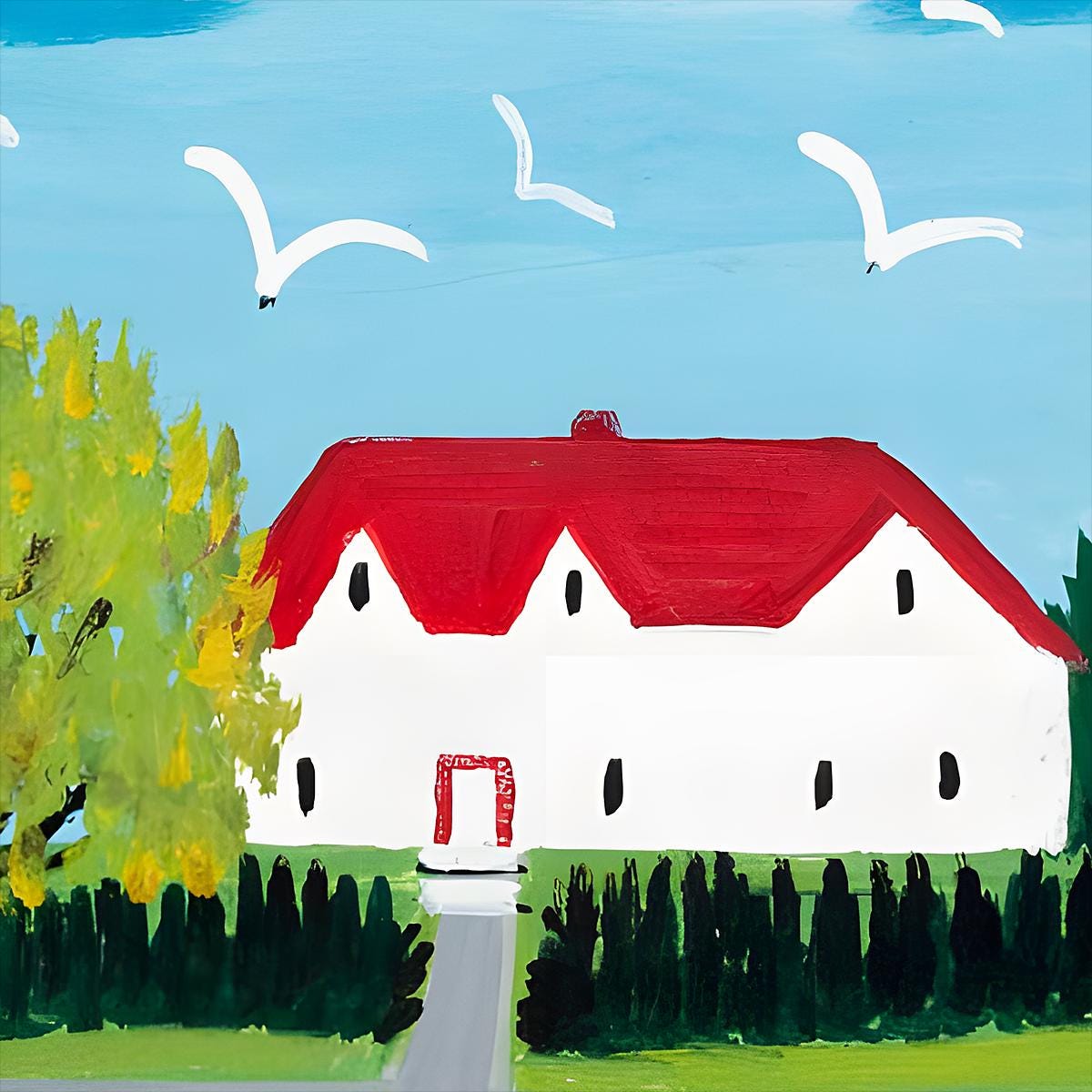 The white house with red roof anchoring St Anne Ferry's foreground evokes the countless similar structures dotting Nova Scotia's rural landscape — simple, sturdy, painted in cheerful colours against long grey winters. Whether depicting a specific house Maud knew or a composite memory of Maritime domestic architecture, it grounds the composition in human habitation. This is working landscape, not wilderness — people live here, ferries serve them, seagulls scavenge their wharves, trees frame their homes.