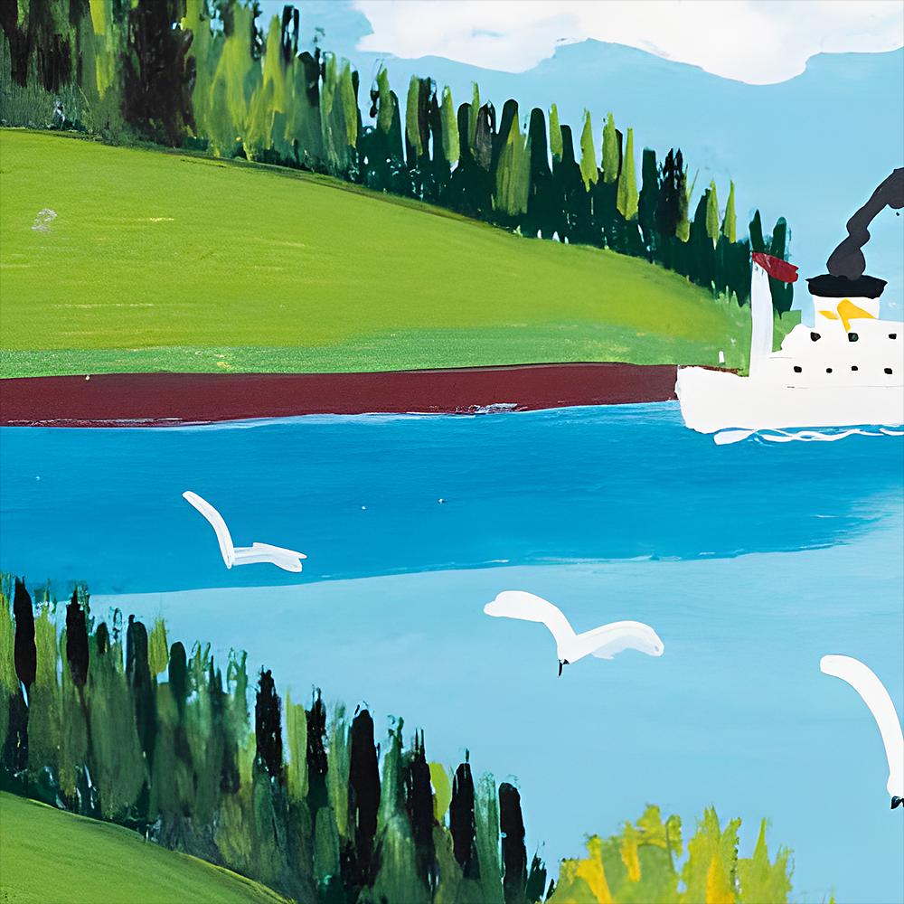 In 1958, from her tiny painted house beside Nova Scotia's Highway No. 1, Maud Lewis watched the steady rhythm of ferry traffic crossing the Bay of Fundy between Digby and Saint John — white steamships threading through the notorious Digby Gut, their smoke trailing across water that connected her isolated Marshalltown community to the wider world. St Anne Ferry captures this essential artery of Maritime life with Lewis's distinctive palette of bright blues, cheerful reds, and emerald greens, transforming routine transportation into joyful folk art.