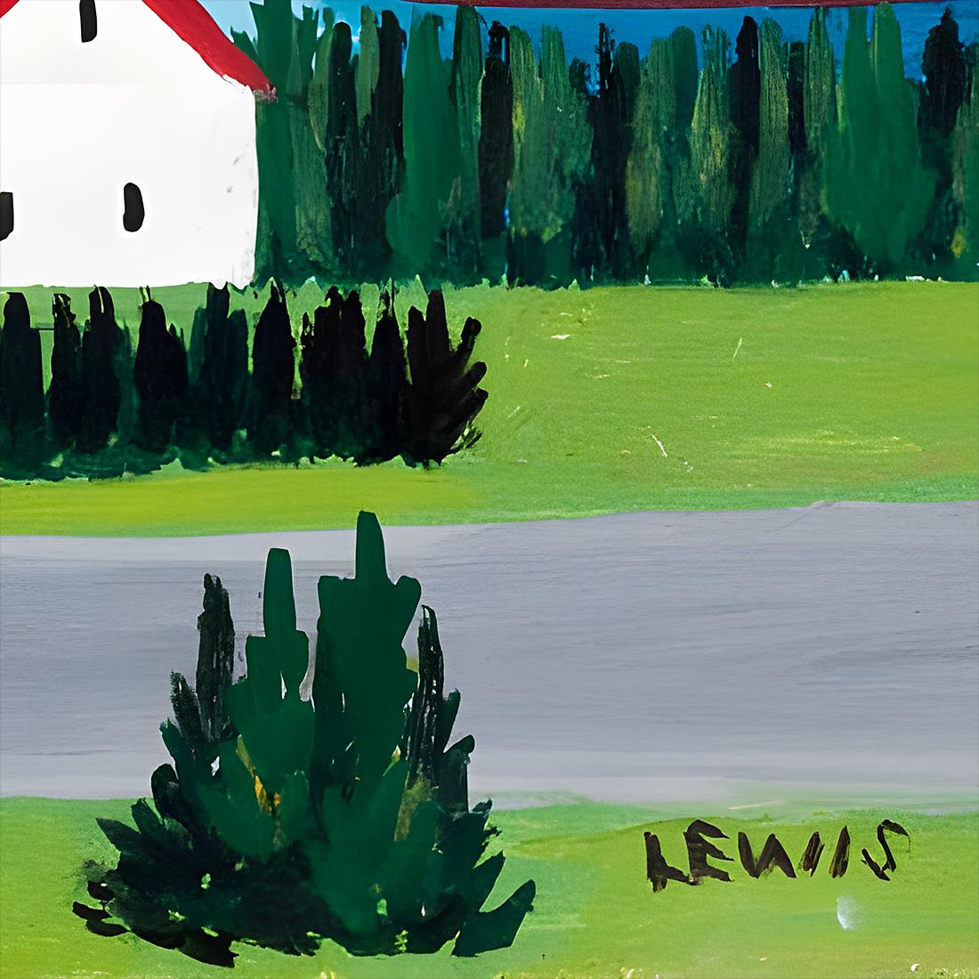 By 1958, Maud Lewis had been painting seriously for nearly two decades, having evolved from selling five-cent Christmas cards door-to-door with her fish peddler husband Everett to producing oil paintings that attracted tourists stopping at their roadside home. Her signature appeared in the lower right corner — "LEWIS" in capital letters — a mark of growing confidence in work that sold for just two or three dollars per painting. She would not reach even seven to ten dollars until the final years of her life.