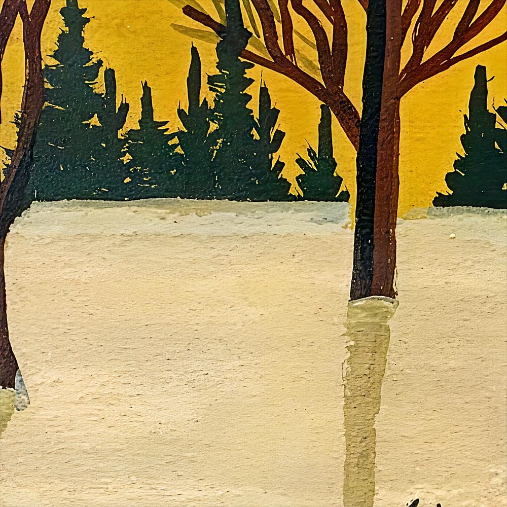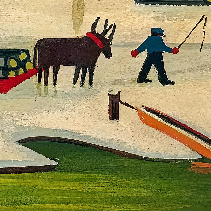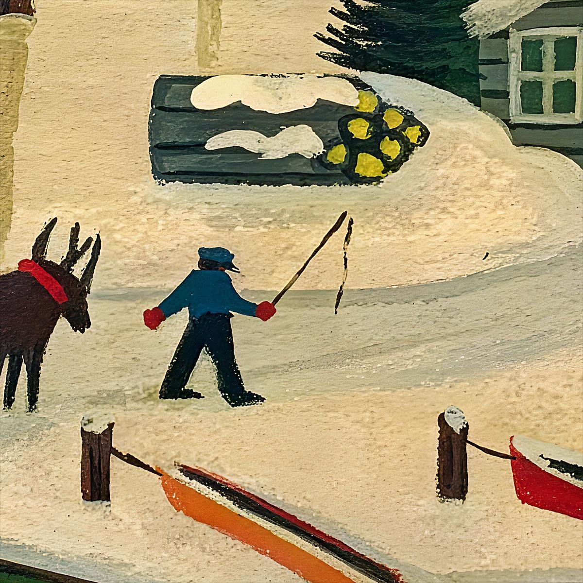 By 1945, Maud had refined the compositional strategies that would characterize her entire career. She worked from memory and imagination rather than direct observation — her limited mobility meant she rarely ventured beyond her dooryard, experiencing the broader landscape through Everett's occasional Model T excursions. Yet her paintings capture essential truths about Maritime winter: the particular green of evergreens against snow, the way smoke disperses in cold air, the brightness of sunlight on white ground, the simple geometry of rural architecture.