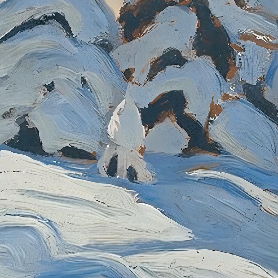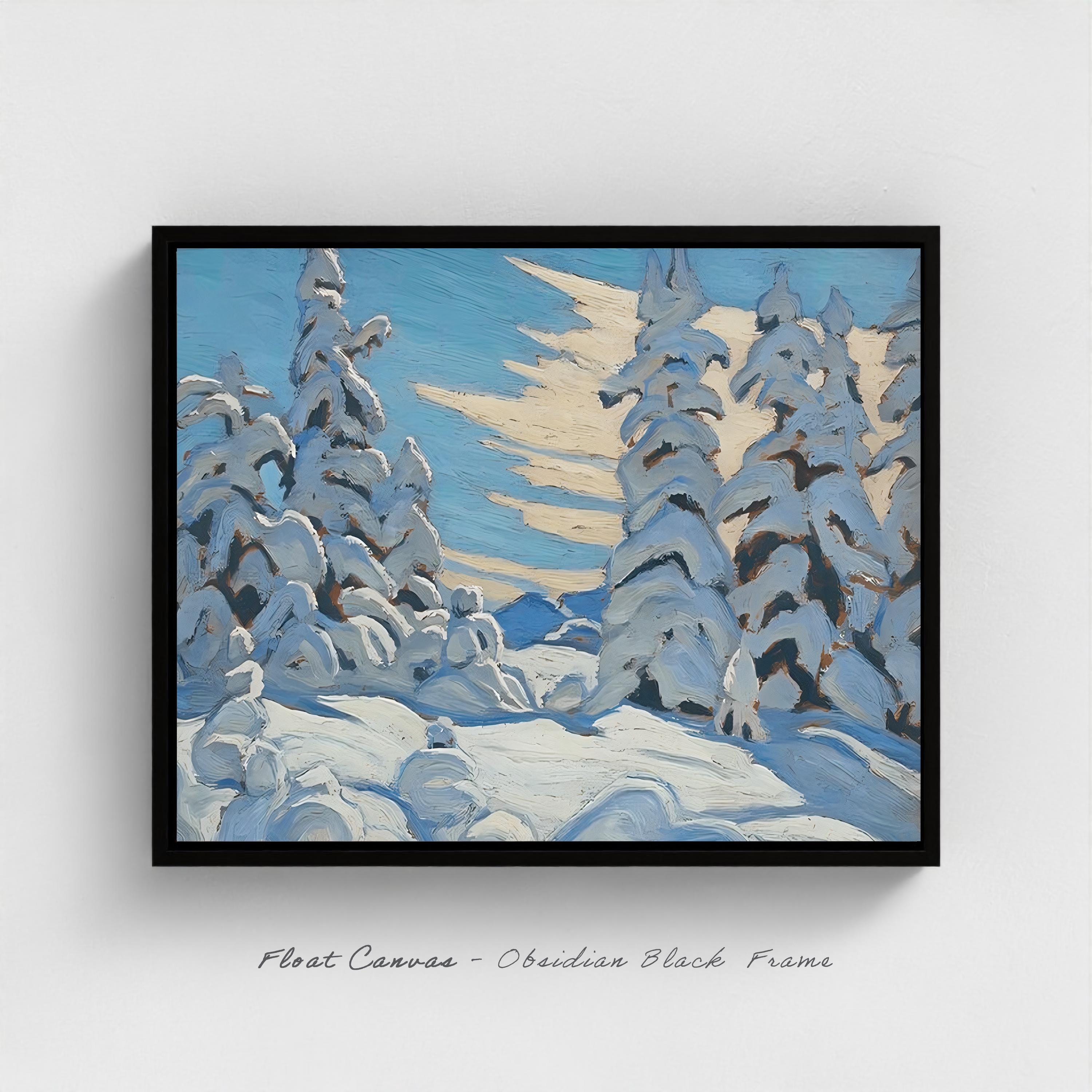 But Trees and Snow captures something different from Harris's later monumental mountain canvases. This is not simplified geometric abstraction. This is direct observation, immediate response, a field sketch painted in excitement before the snow could melt. The brushwork is vigorous and spontaneous — thick impasto laid on with loaded brush, capturing the sculptural weight of snow bending evergreen branches earthward. Blues range from pale sky cerulean to deep shadow cobalt. The snow itself is rendered in brilliant whites and creams with shadows of blue and mauve — those distinctive Harris winter colours that suggest both physical cold and spiritual purity.