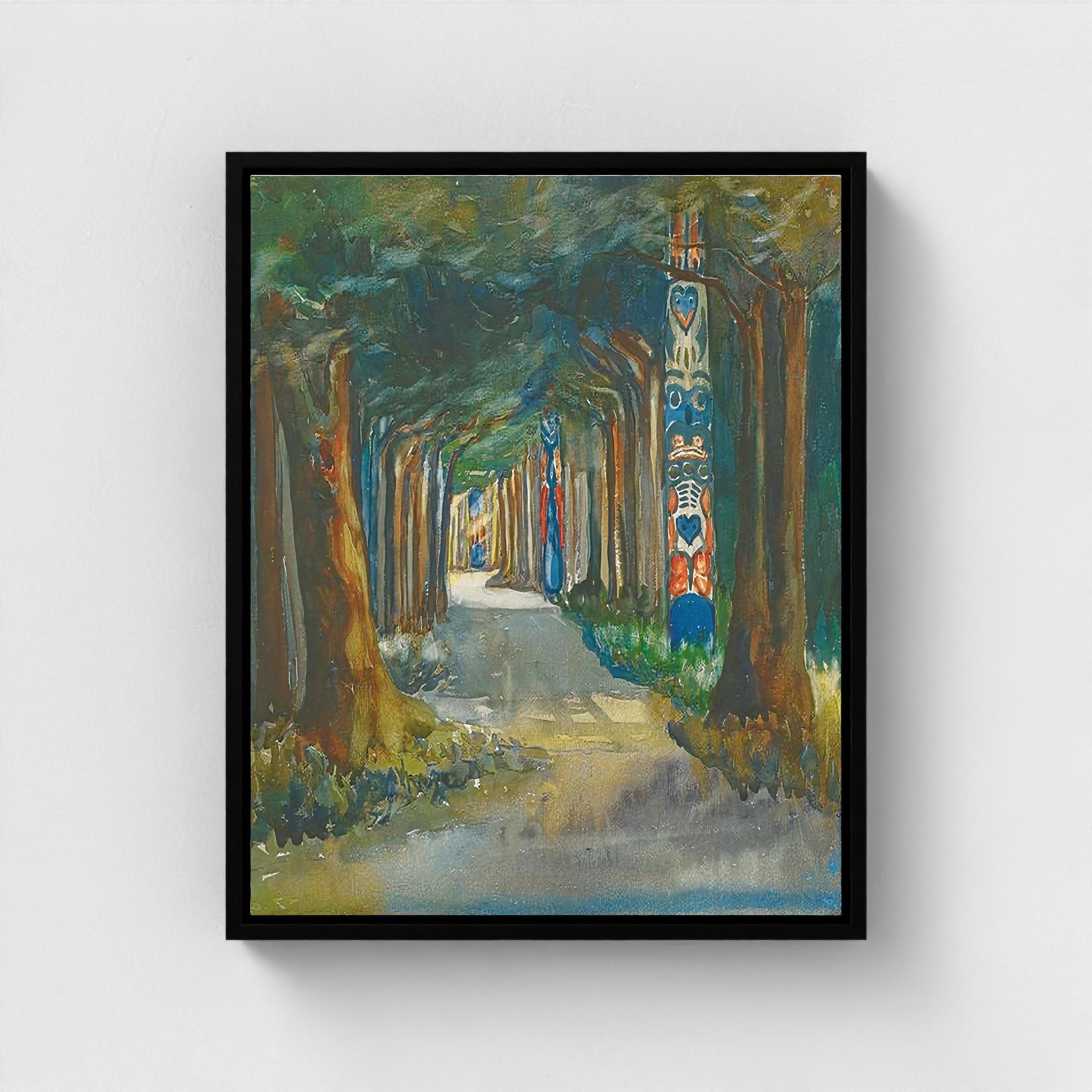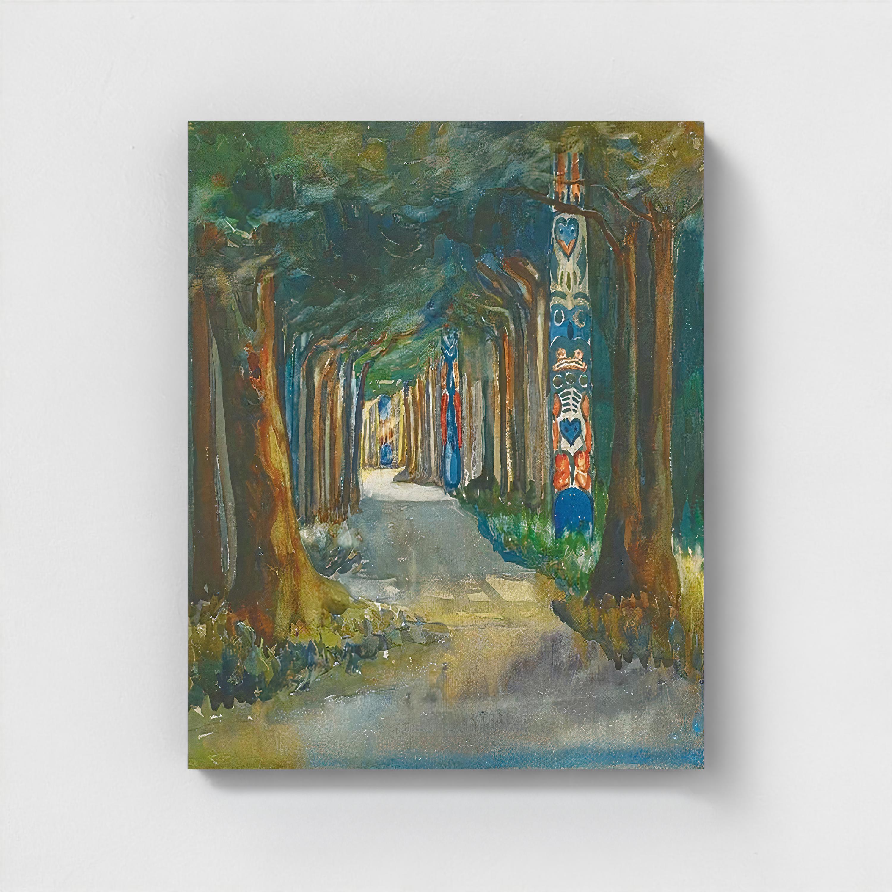 This early work shows Carr before she developed her mature Post-Impressionist style in France. The composition is traditional, the perspective straightforward - yet mystery inhabits the scene. The poles stand vivid in red, blue, and white against dark forest tones, simultaneously cultural objects and natural forms. This visual ambiguity reflects Carr's emerging understanding: Indigenous art didn't imitate nature but participated in it.