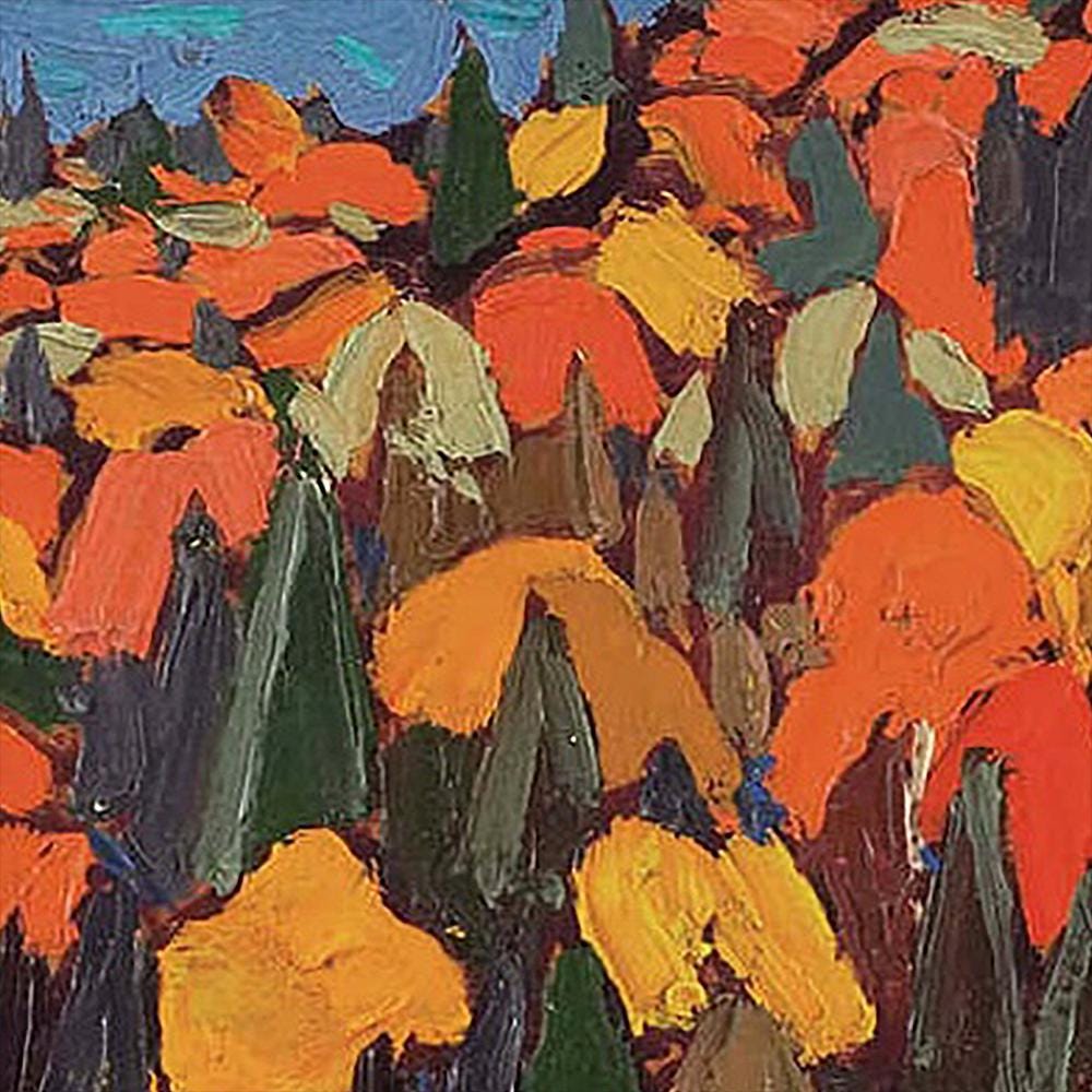 impasto technique transforms familiar autumn woods into a shimmering mosaic of reds, oranges, and golds.