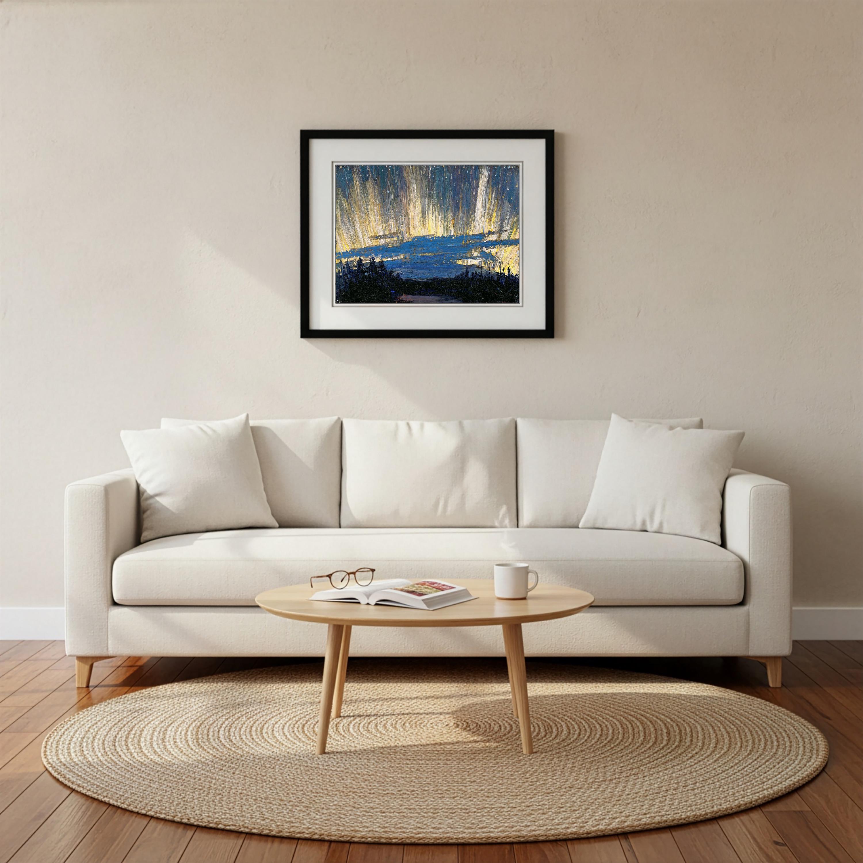 Gallery Frame — Your artwork is professionally printed on fine art paper, presented with a white mat under anti-reflective glass in a classic black hardwood frame. Ready to hang. Museum-quality presentation for collectors and discerning spaces.