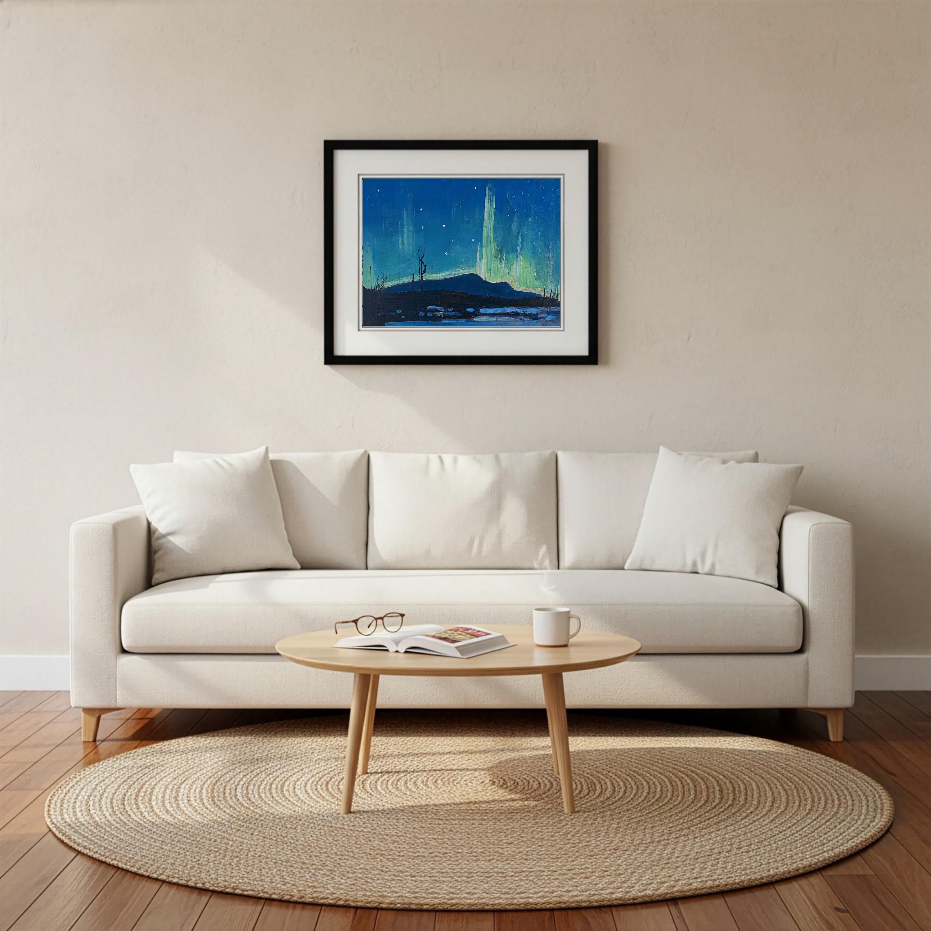 Gallery Frame — Your artwork is professionally printed on fine art paper, presented with a white mat under anti-reflective glass in a classic black hardwood frame. Ready to hang. Museum-quality presentation for collectors and discerning spaces.