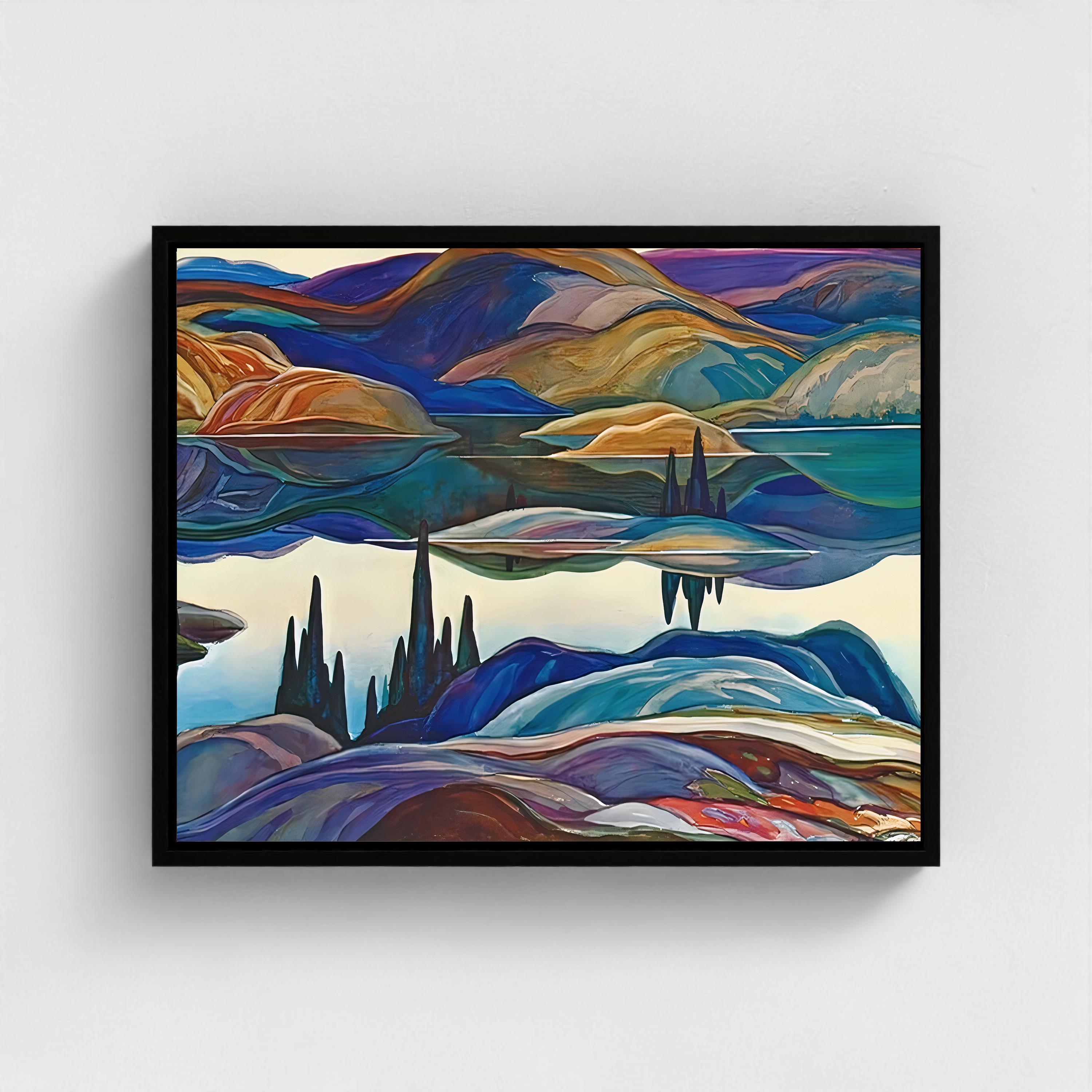 - Giclee pigments on artist-grade canvas mounted within a silk black wood float frame, creating a contemporary shadow gap between canvas and frame.