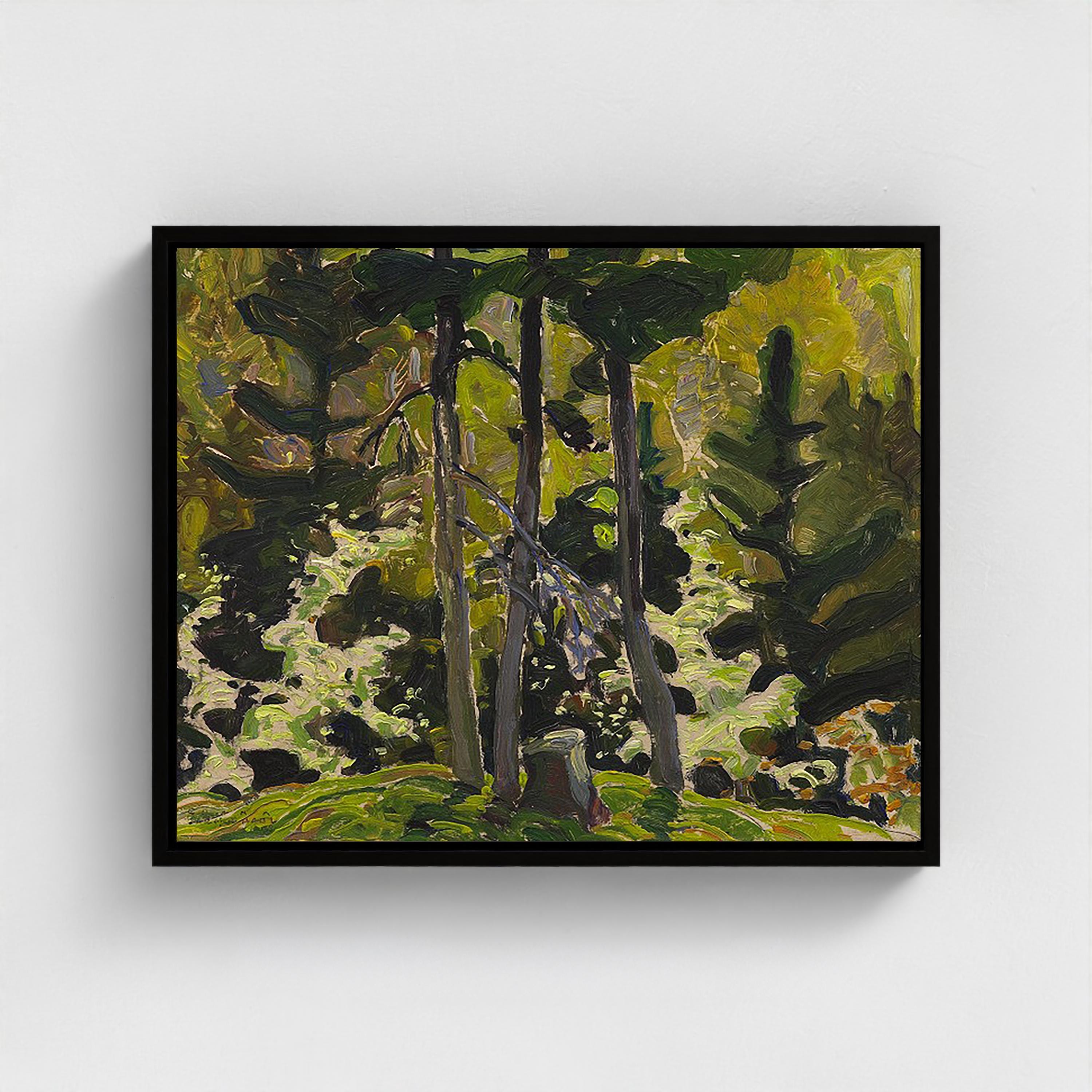 - Giclee pigments on artist-grade canvas mounted within a silk black wood float frame, creating a contemporary shadow gap between canvas and frame.