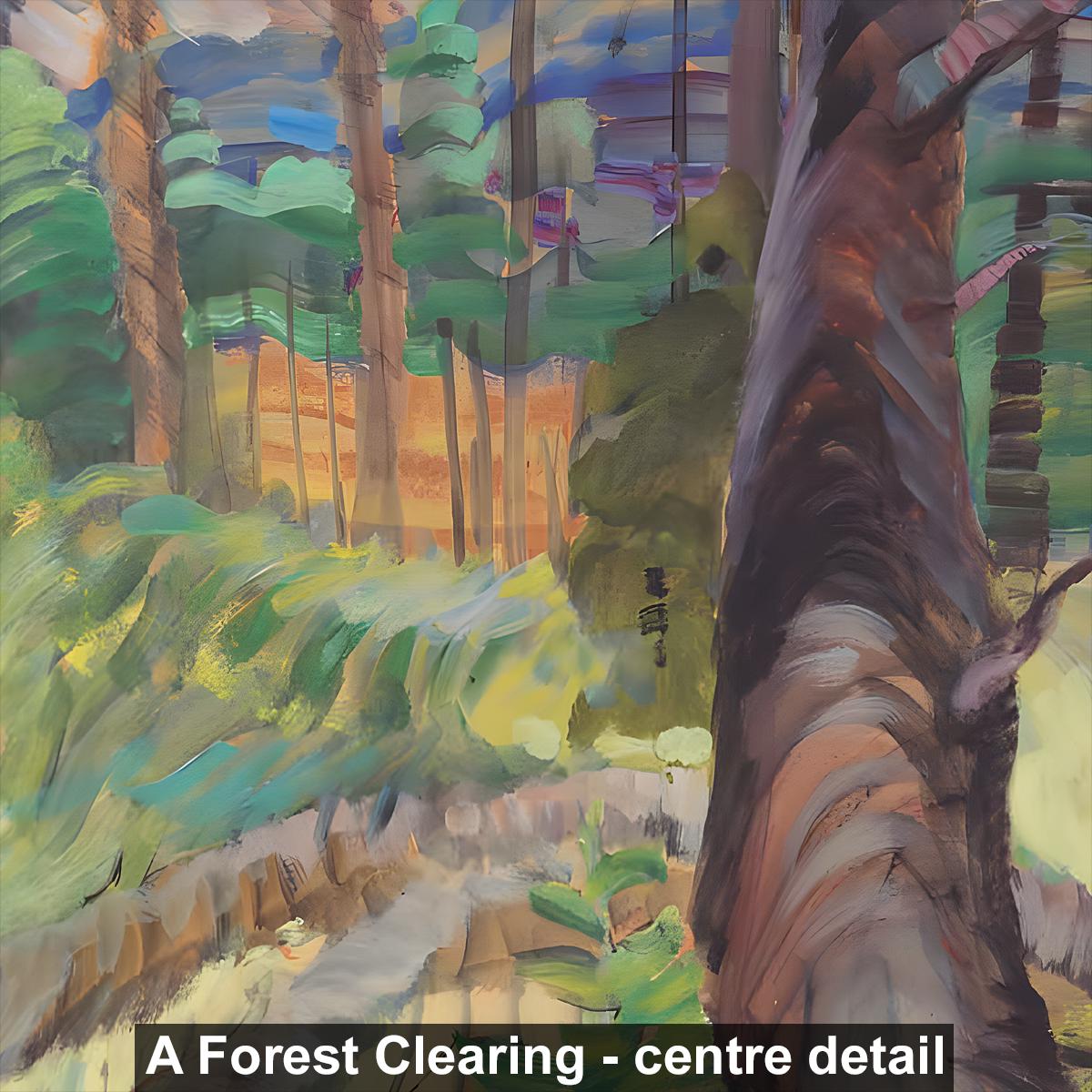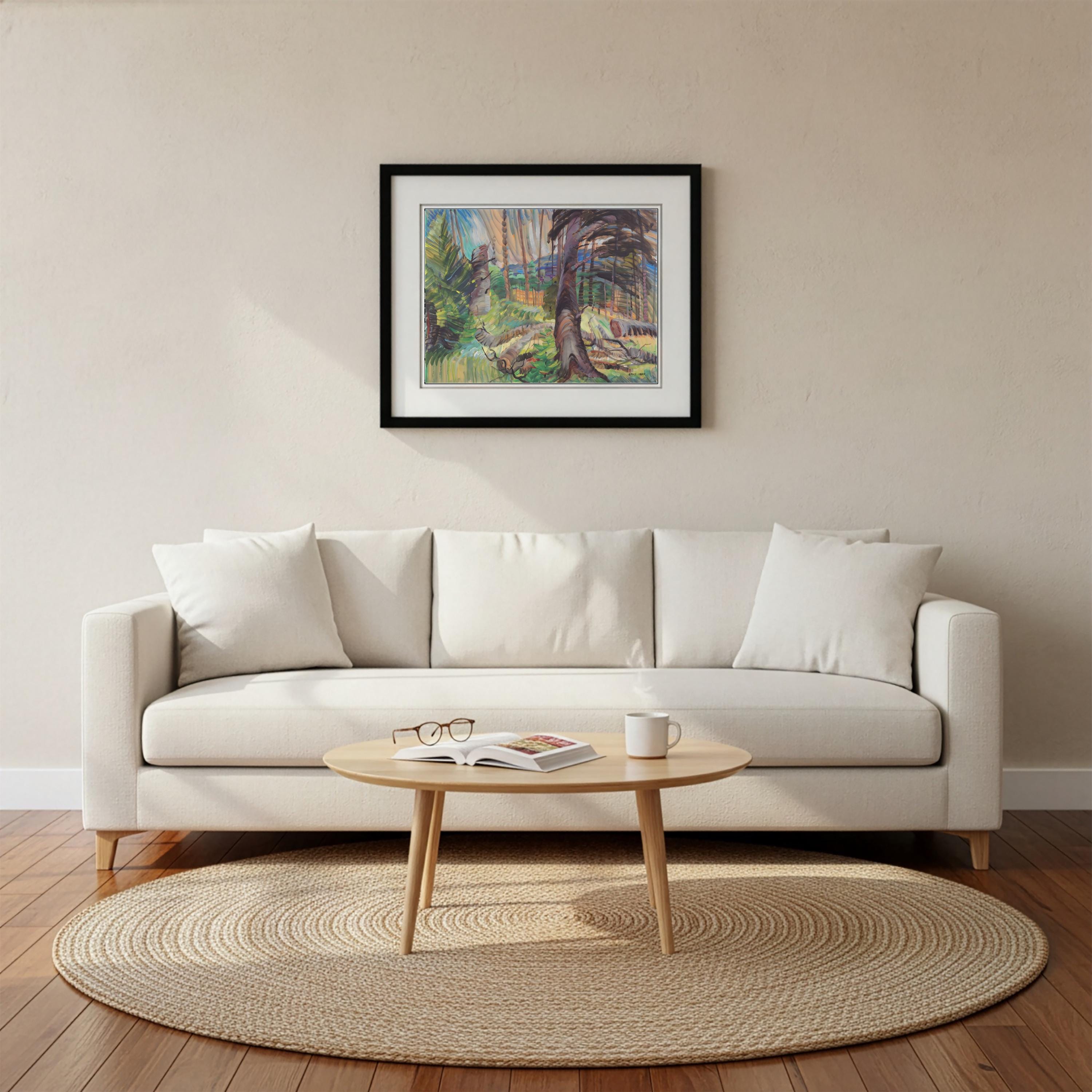 Emily Carr's "A Forest Clearing" (1935) finds the breath within the density — an opening in the canopy where sky pours down and the forest momentarily lets go of its grip. Carr was drawn to clearings not as emptiness but as presence, places where the forest revealed what it normally held hidden. Light floods the open ground with an almost spiritual intensity while the surrounding trees lean inward like witnesses, and the clearing becomes a threshold — not between forest and not-forest, but between the seen and the felt.
