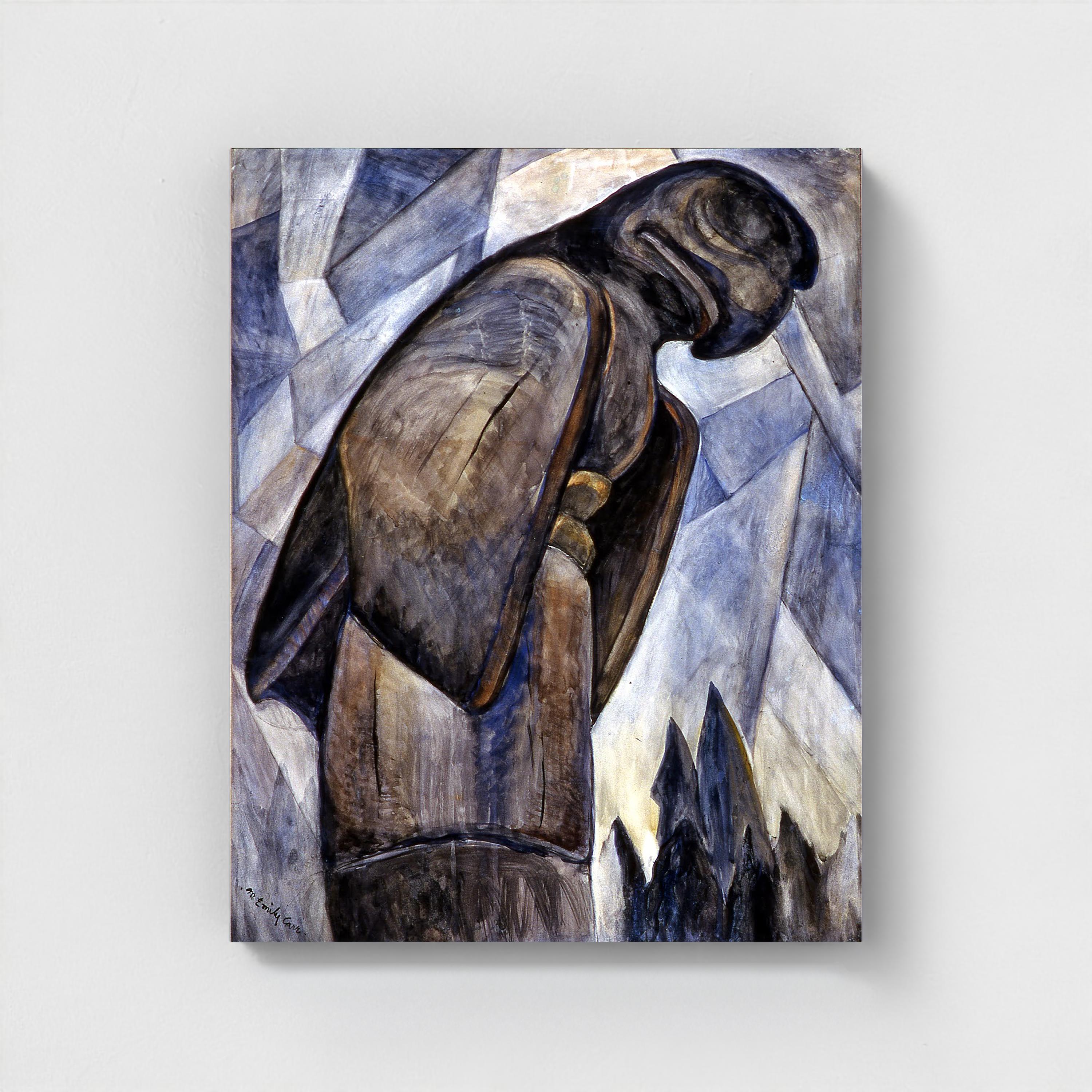 Emily Carr's "Big Eagle, Skidegate" captures a towering Eagle figure from the Haida village, its great wings and fierce gaze commanding the sky above Haida Gwaii. The Eagle in Haida tradition is a being of vision and authority — a creature that sees from the highest vantage what remains hidden to those below. Carr paints this pole with a reverence that matches its stature, the carved form rising against the coastal landscape with an unshakeable dignity. Like the Big Raven, the Big Eagle speaks across worlds, and Carr understood that to paint it honestly was not to document a carving but to stand in the presence of something alive.