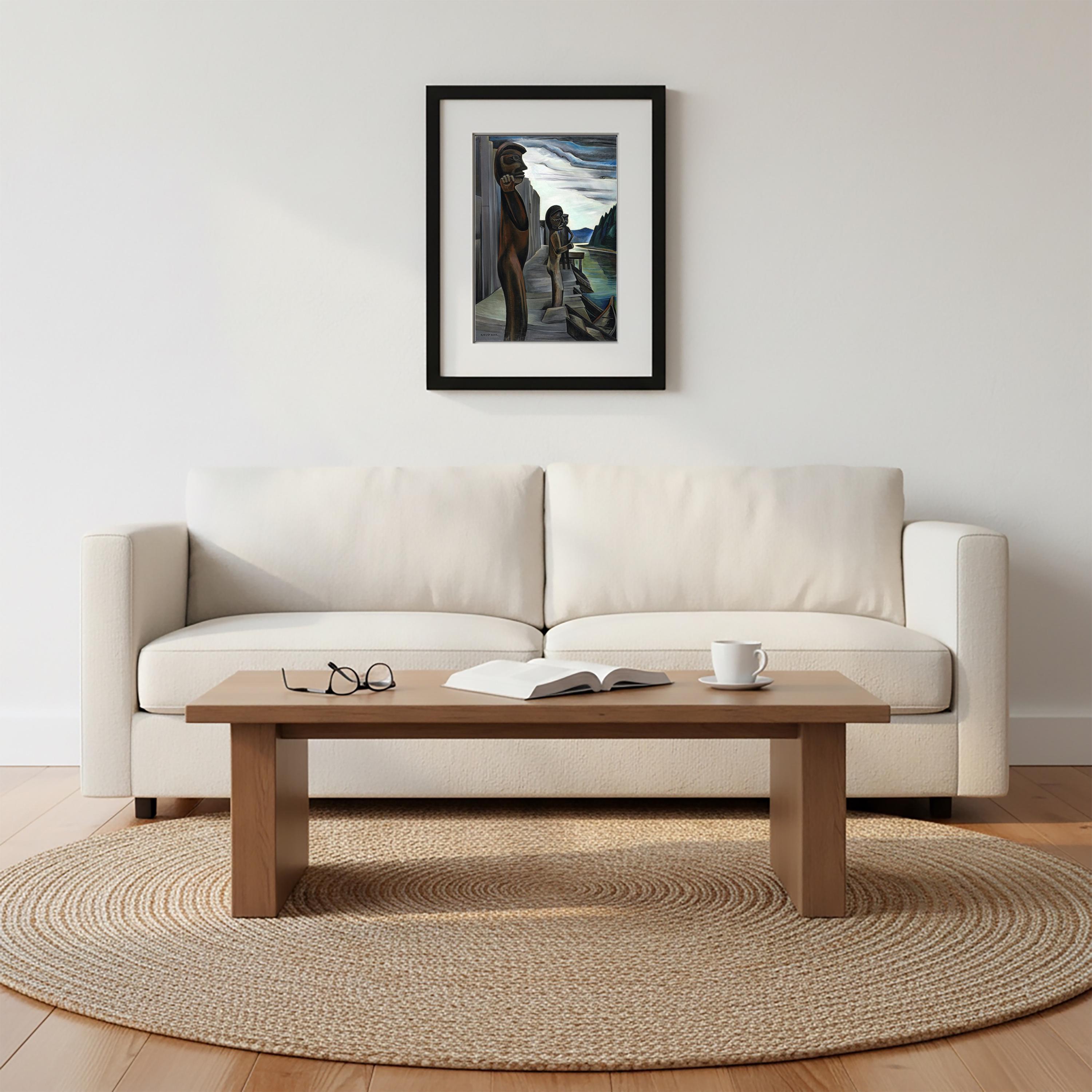 - Giclee pigments on artist-grade canvas mounted within a silk black wood float frame, creating a contemporary shadow gap between canvas and frame.