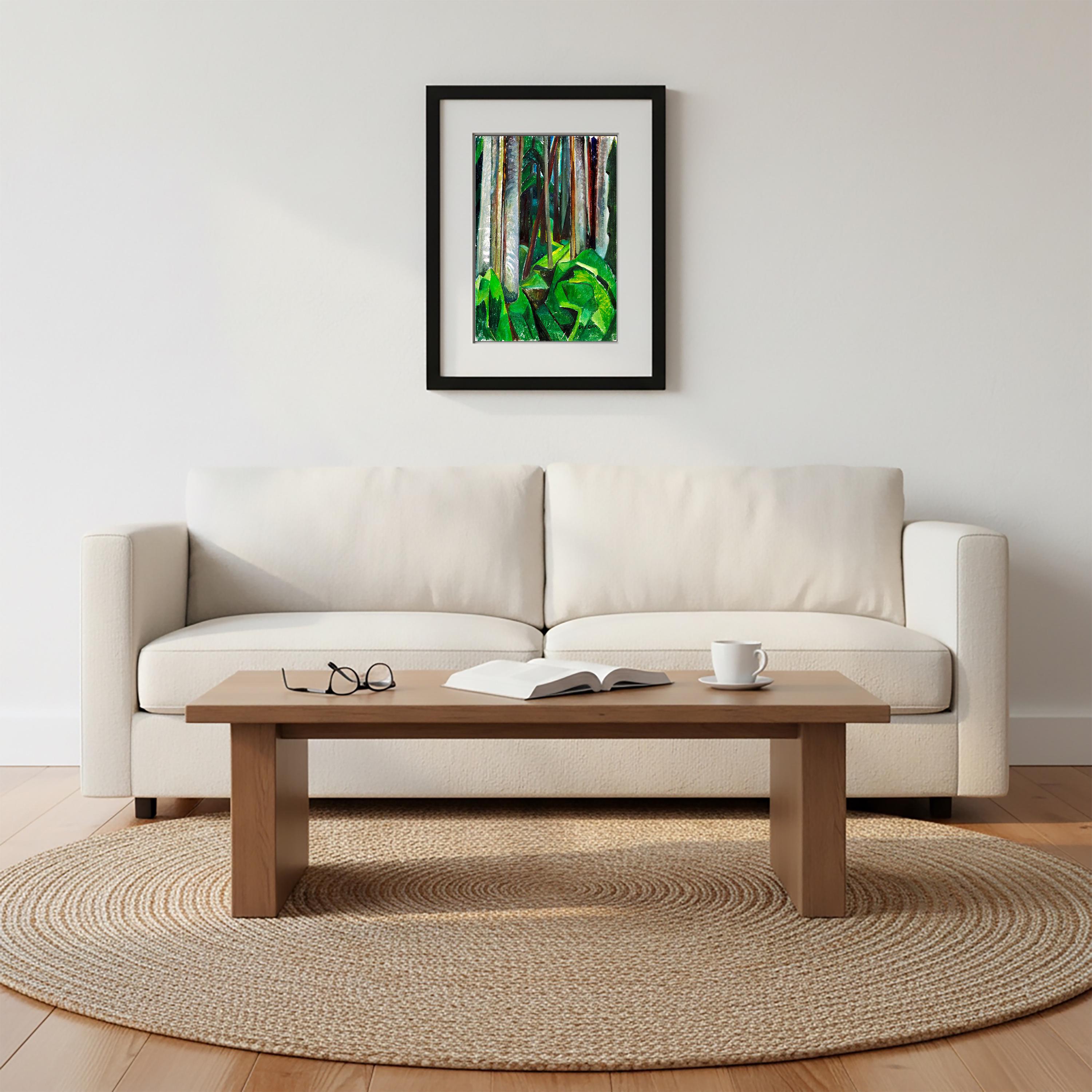 - Giclee pigments on artist-grade canvas mounted within a silk black wood float frame, creating a contemporary shadow gap between canvas and frame.