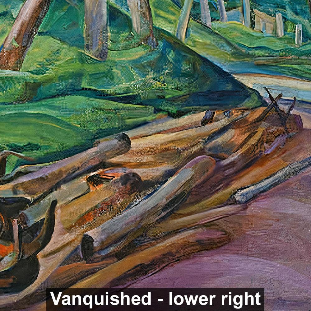 Emily Carr's "Vanquished" (1930) confronts the devastating aftermath of industrial logging in the British Columbia wilderness — a landscape of shattered stumps and fallen giants, rendered with the raw emotional intensity of her mature style. Yet within the destruction, Carr finds defiance — the twisted remains of ancient trees refuse to surrender their presence, standing as monuments to what was taken. This is Carr at her most prophetic, transforming environmental grief into a powerful statement about the cost of progress and the enduring spirit of the land.