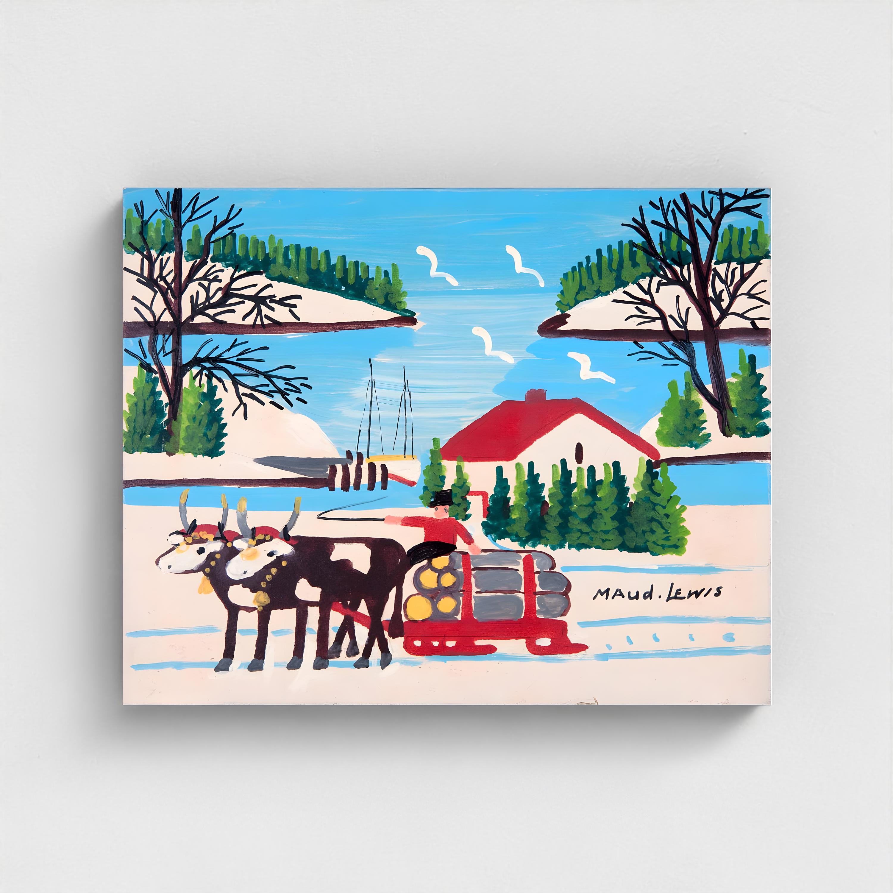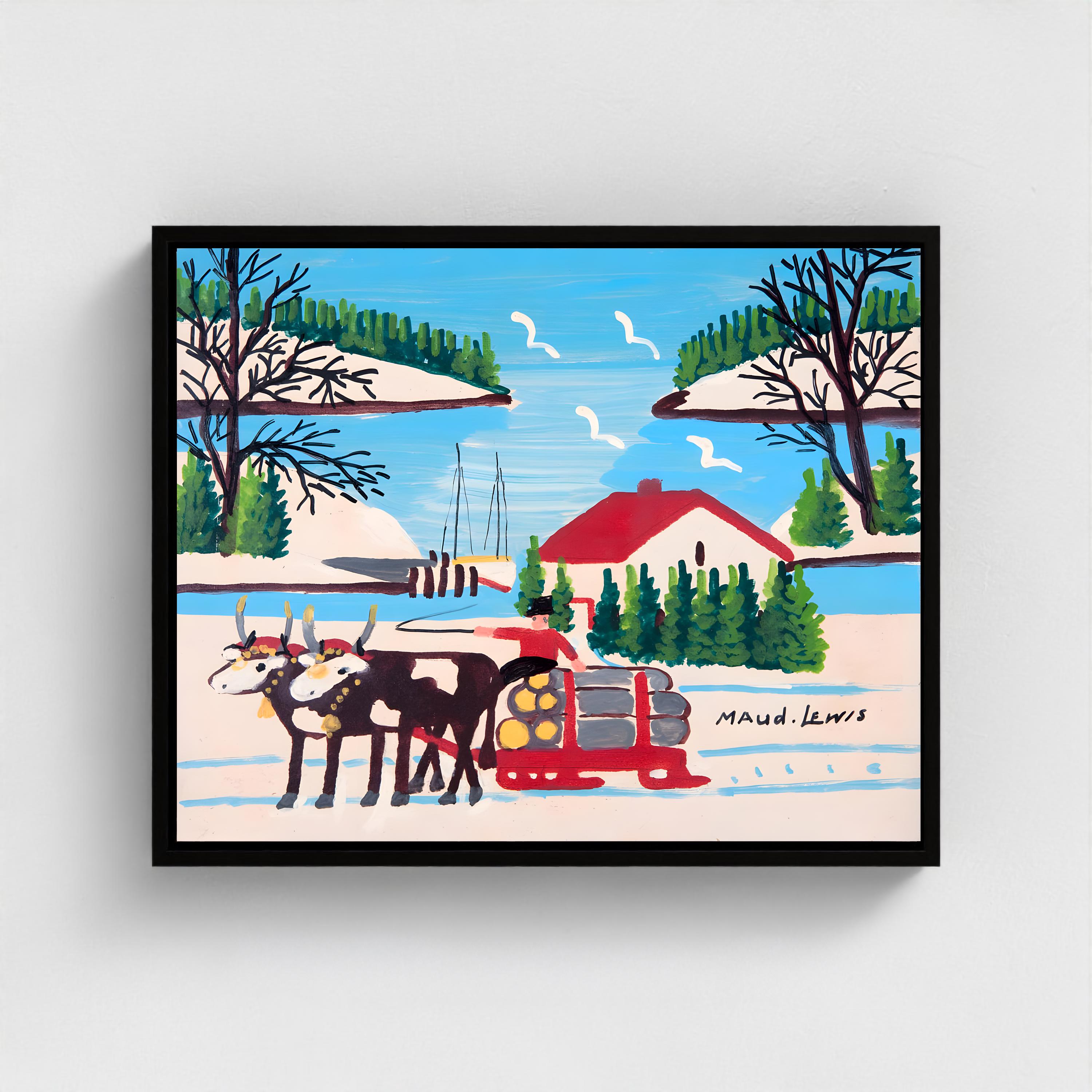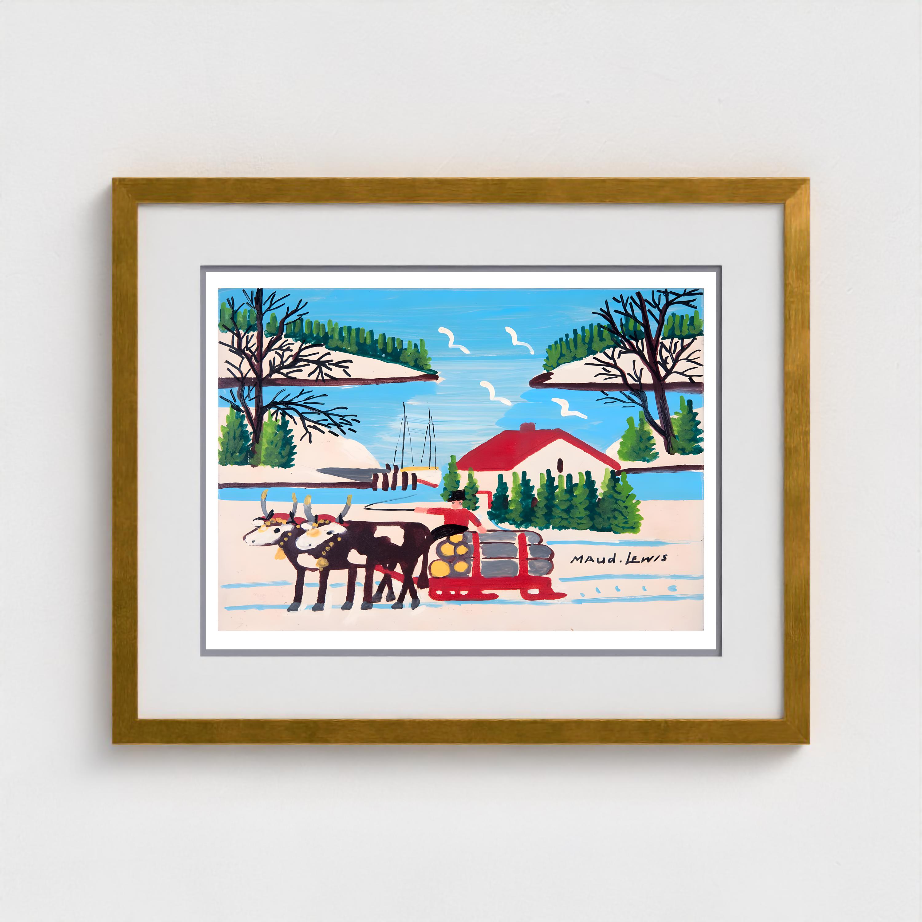 Maud Lewis, Oxen Hauling Logs Near Harbour -1964 | Vintage Canadian Folk Art
