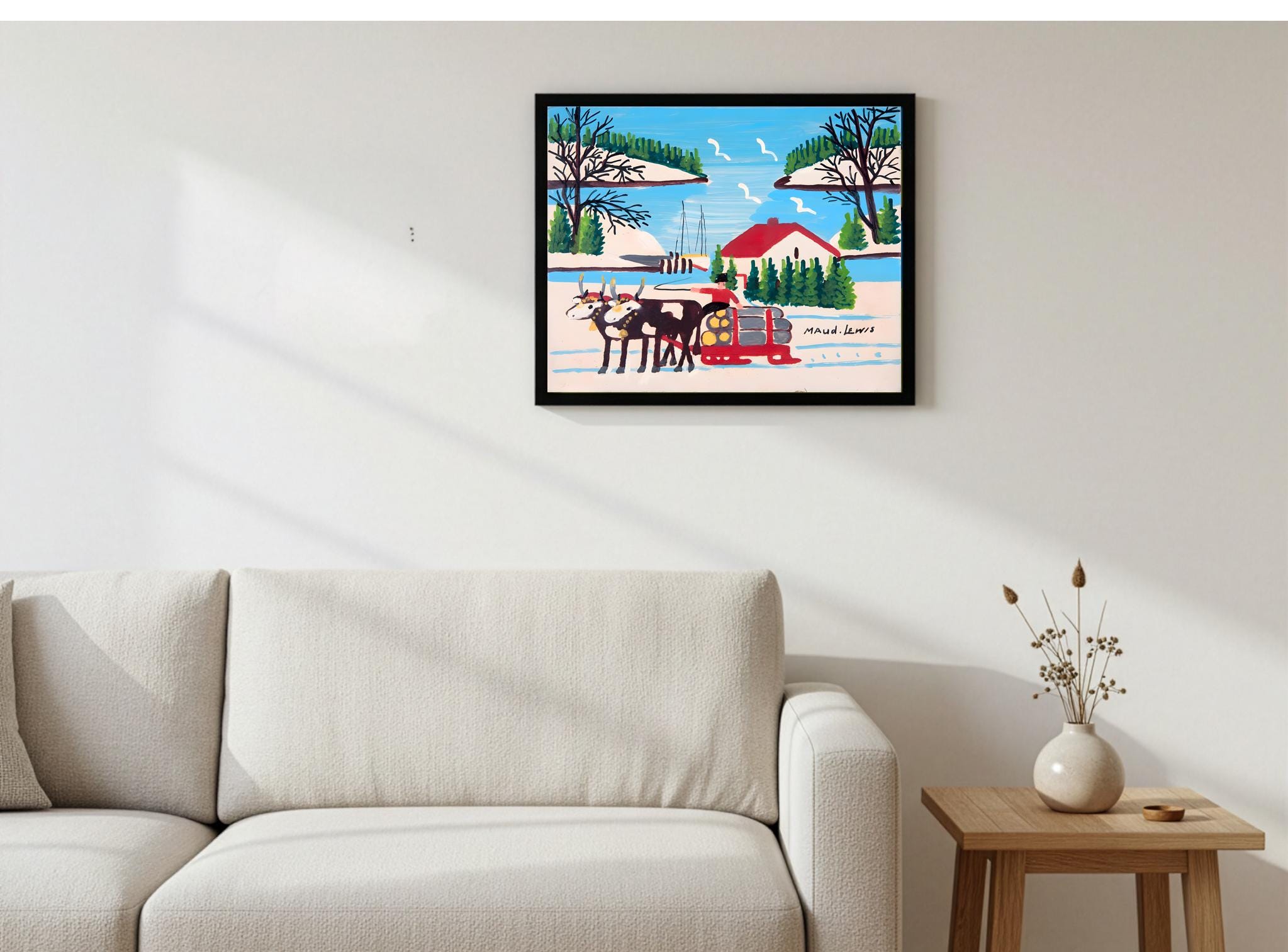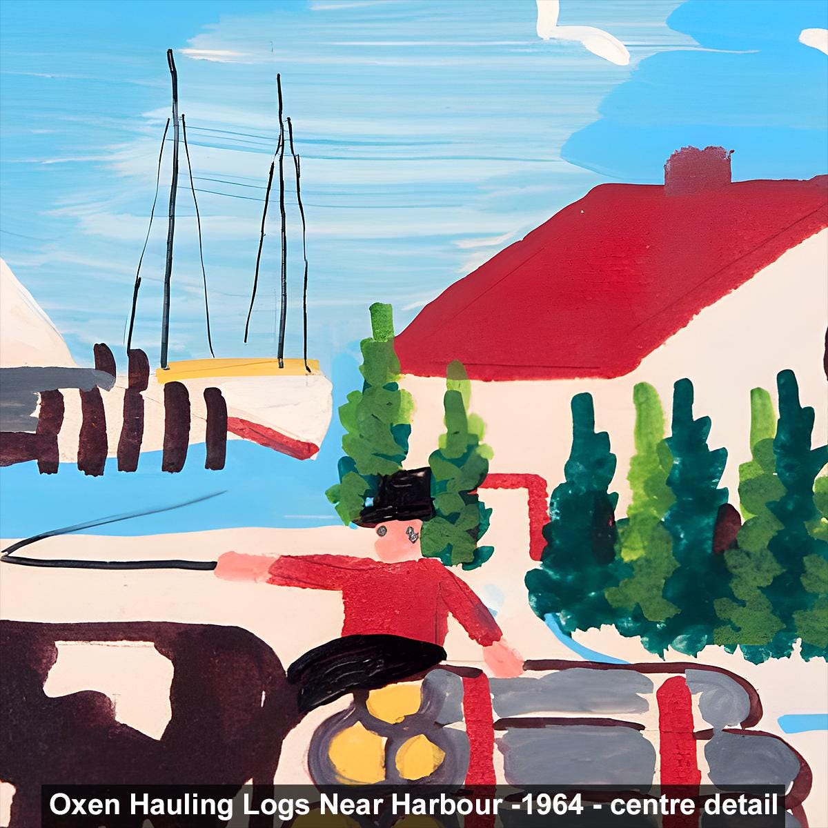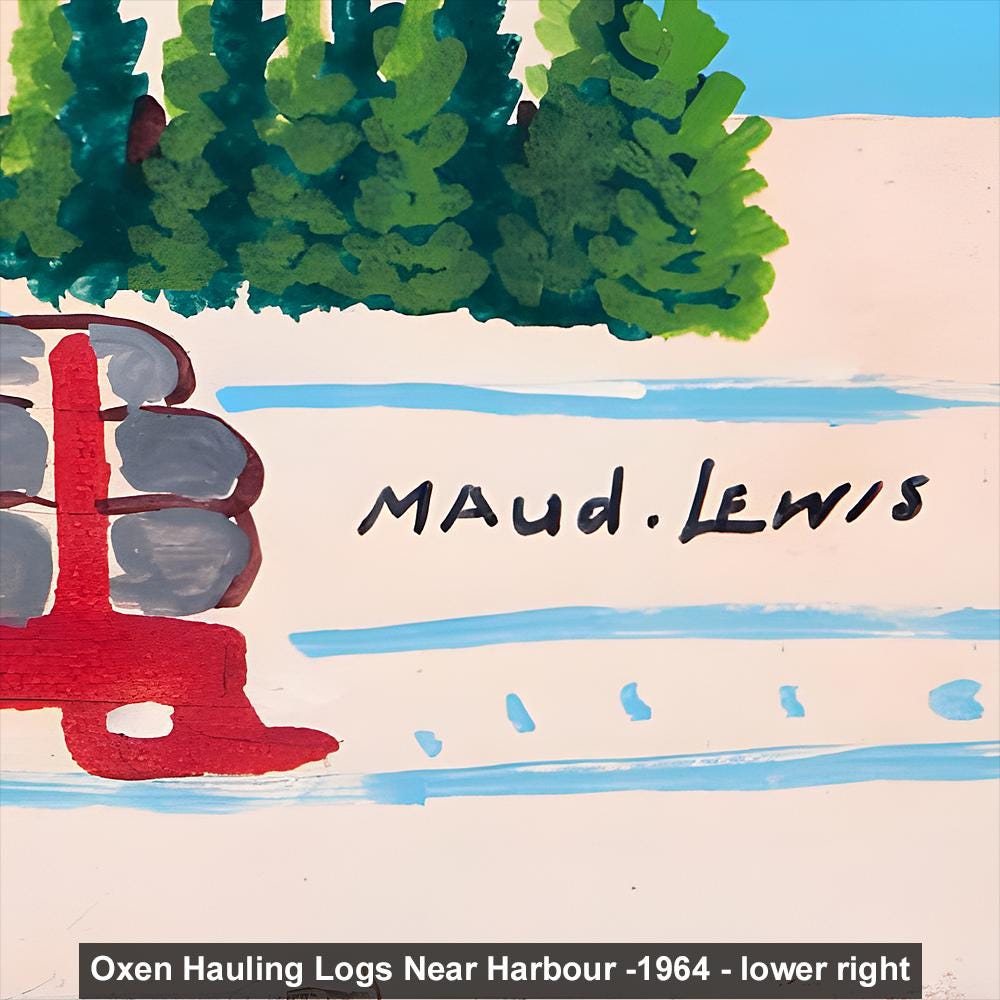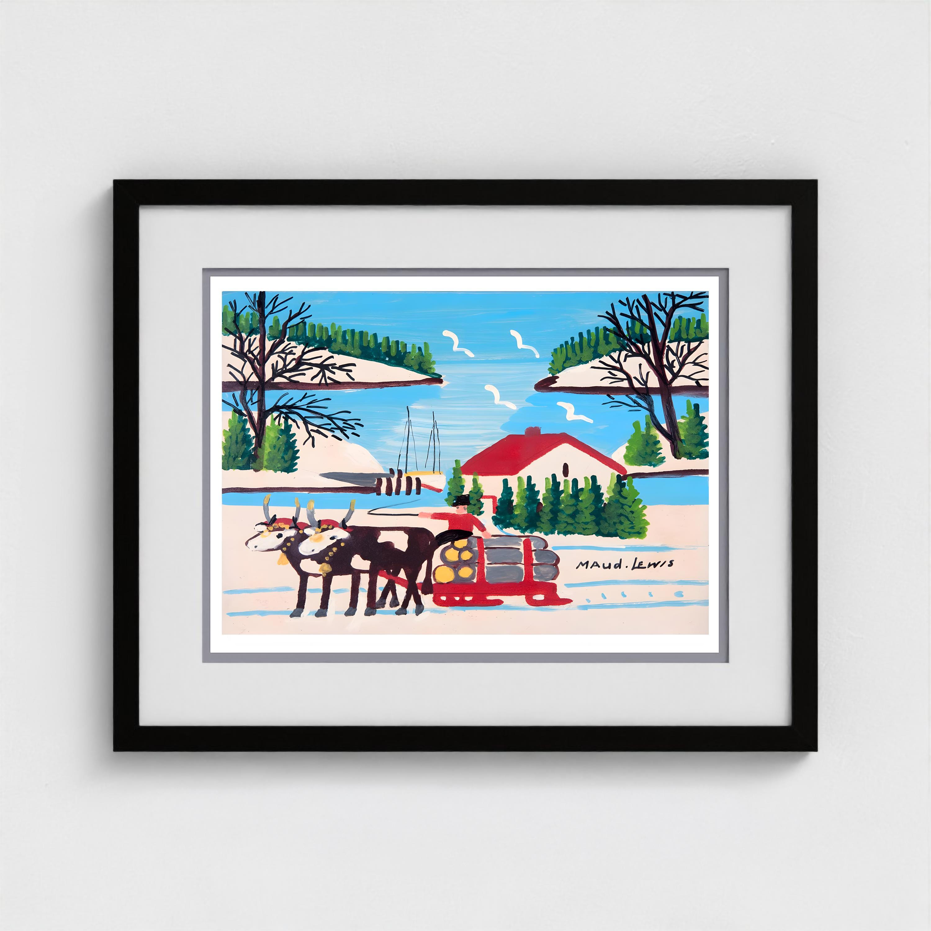 Maud Lewis, Oxen Hauling Logs Near Harbour -1964 | Vintage Canadian Folk Art