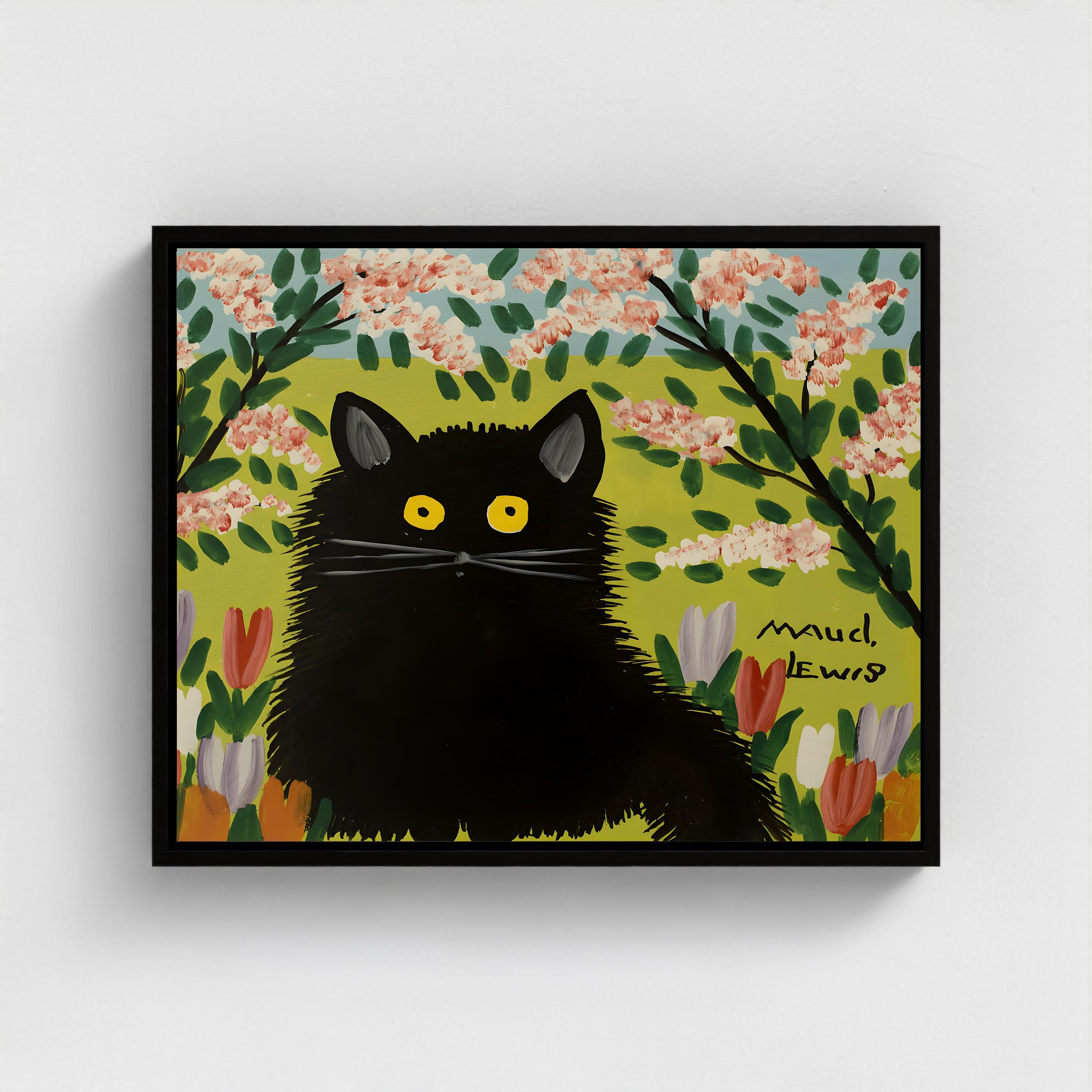 - Giclee pigments on artist-grade canvas mounted within a silk black wood float frame, creating a contemporary shadow gap between canvas and frame.